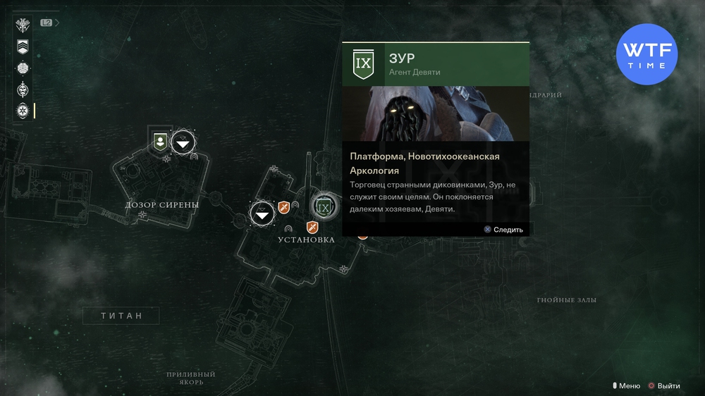 На этот раз Зур высадился в небольшом бункере на Титане, бежать от быстрого перемещения совсем недалеко. Вам нужна локация Установка. Задержится Агент Девяти здесь на четыре дня и улетит домой за новыми товарами в полдень вторника.
