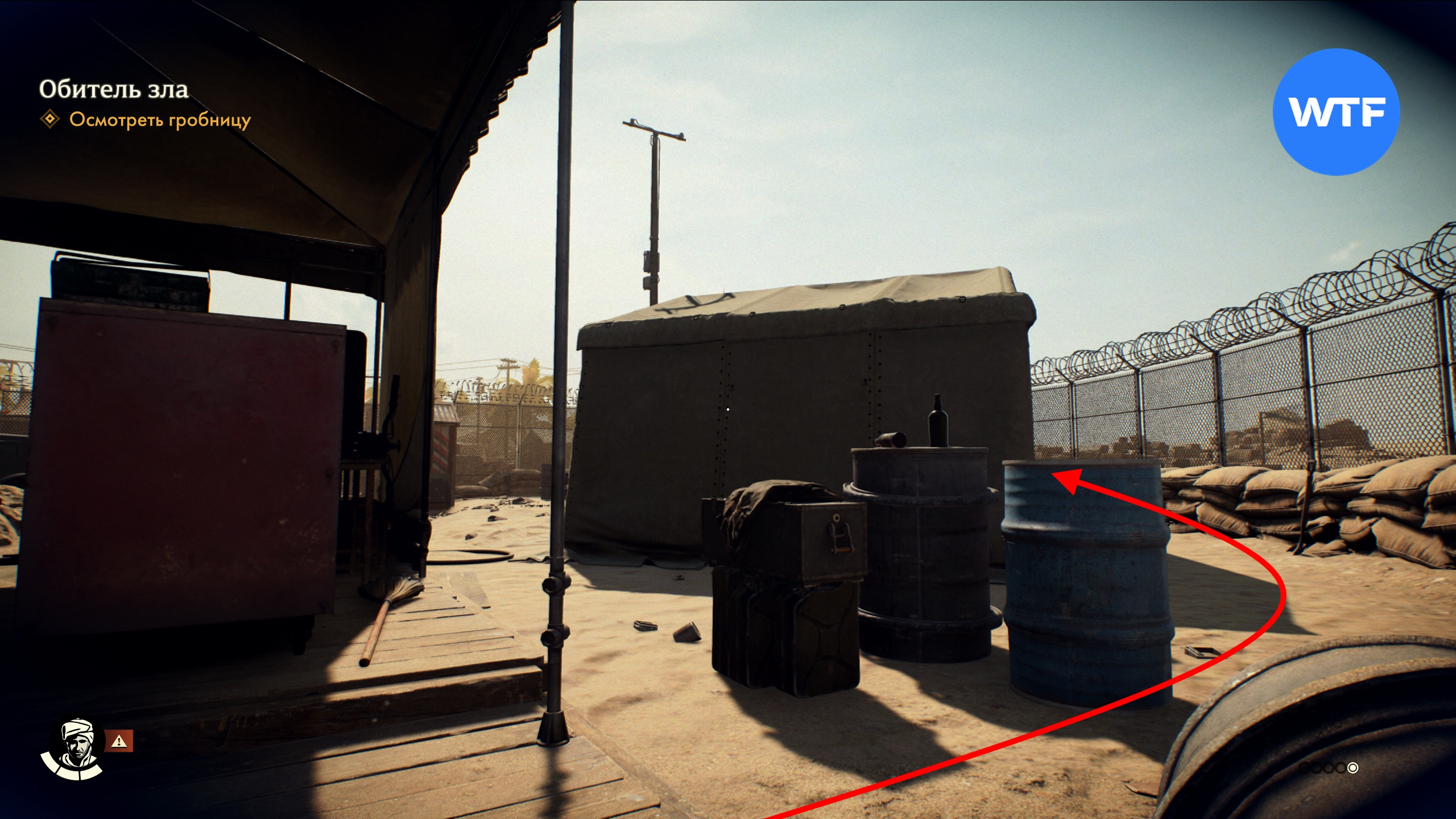 Вход в гробницу с привидениями можно найти, если пойти по дороге на юго-запад. Точное место мы показали на скриншотах ниже. Вы можете незаметно прокрасться за машинами и использовать ранее найденный ключ, чтобы отпереть вход.