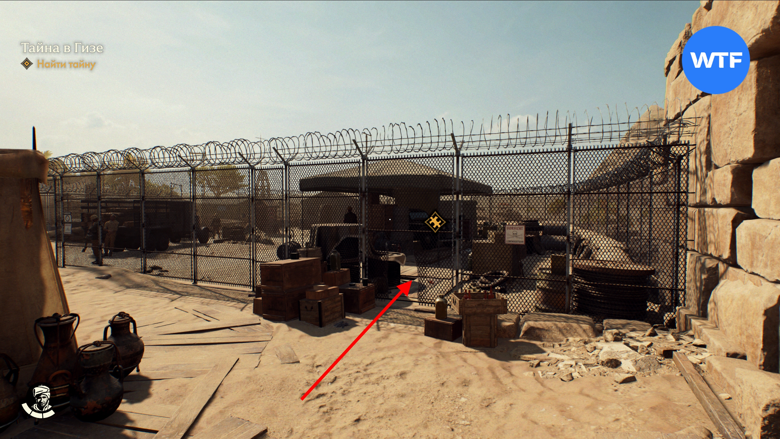 Впервые узнать об этой тайне можно из записки в военном лагере к северу от Лагеря рабочих в Гизе. Незаметно пробраться внутрь можно через дыру в заборе а северо-восточном углу.