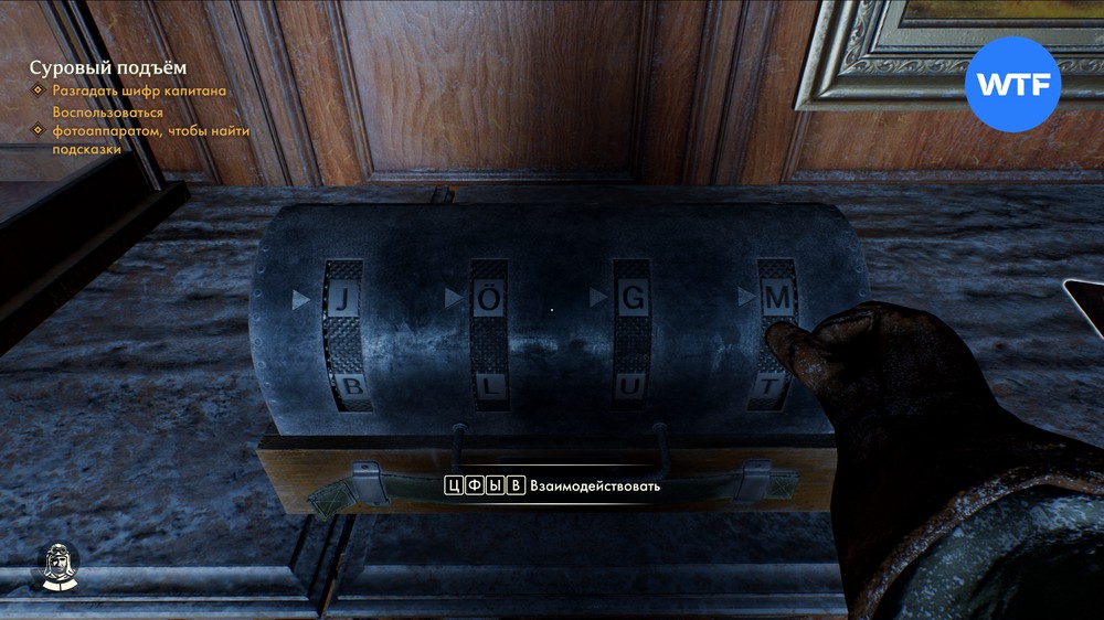 Ваша задача — найти четыре диска, вставить их в шифровальную машину, а затем закрыть крышку, чтобы получить возможность их вращать. При установке дисков обратите внимание на буквы, которые на них нанесены, так как нам нужно набрать определенное слово.
