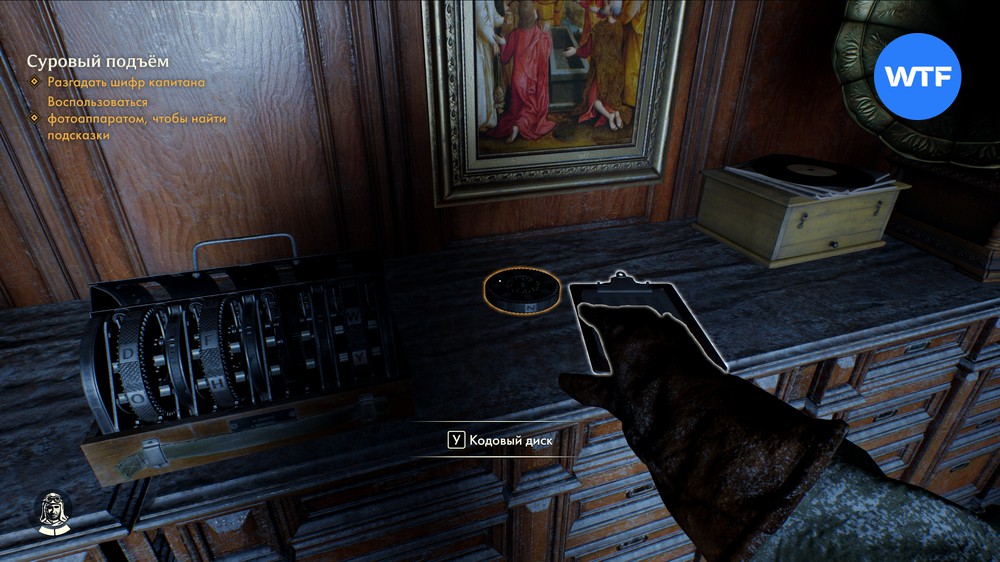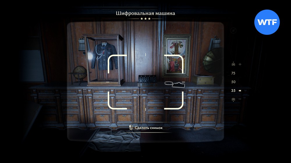 На шкафу в углу также стоит шифровальная машина. В зависимости от уровня сложности, на котором вы играете, несколько кодовых дисков уже может стоять на месте, либо все они будут разбросаны по комнате.