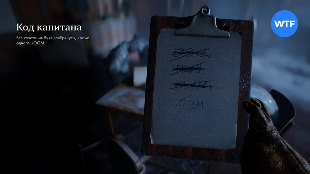 После этого внимательно осмотрите записки, разбросанные вокруг: одна из них содержит код капитана, состоящий из букв JOGM, а другие две — таблицы кодов, которые пригодятся вам для его расшифровки.