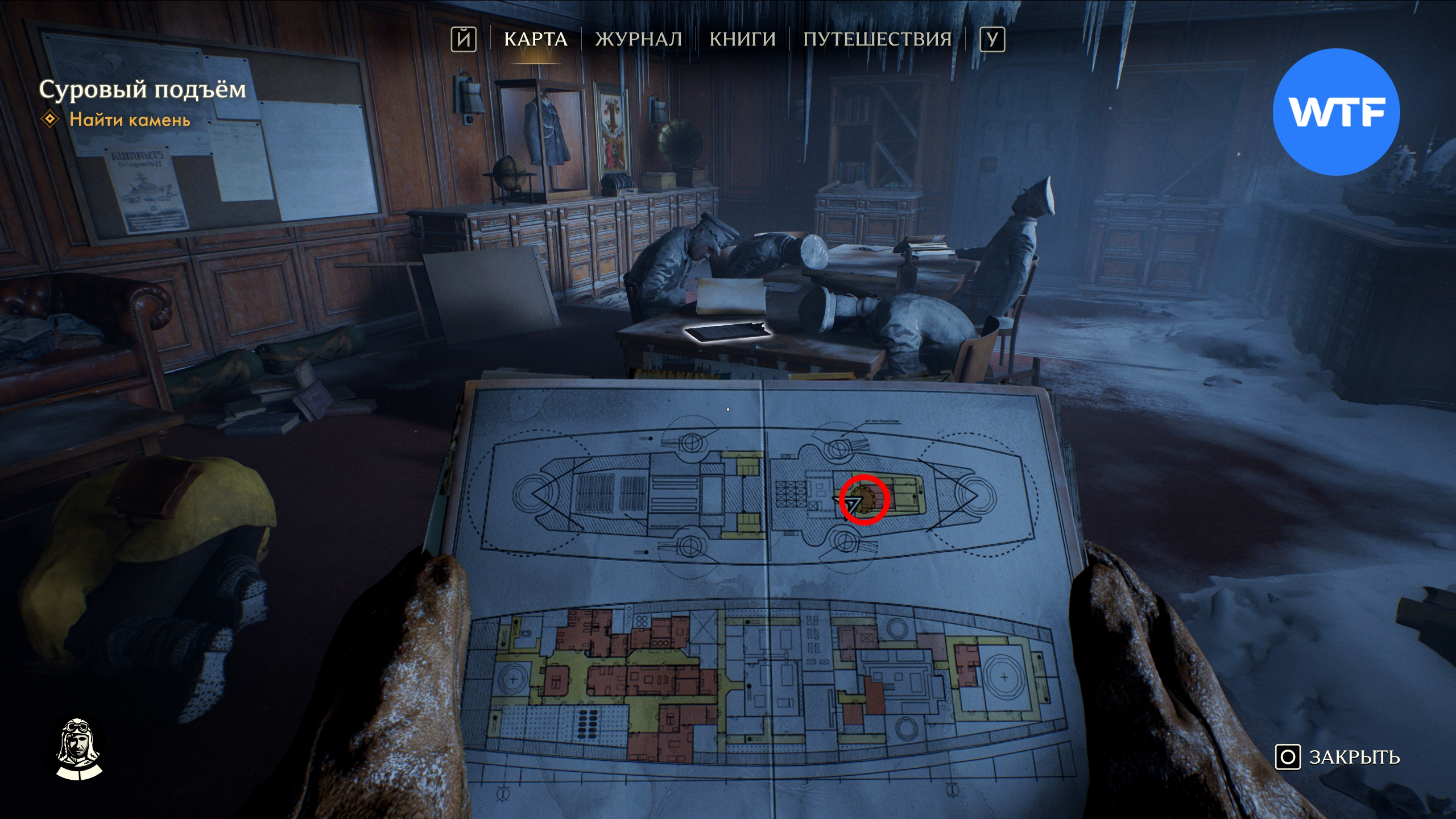 Чтобы добраться до камня, вам нужно открыть дверь с кодовым замком, ведущую в Боевую рубку. А для этого нужно расшифровать код капитана. Чтобы понять, что же все-таки произошло на линкоре «Куммец», рекомендуем вам почитать Журнал капитана, лежащий на столе.