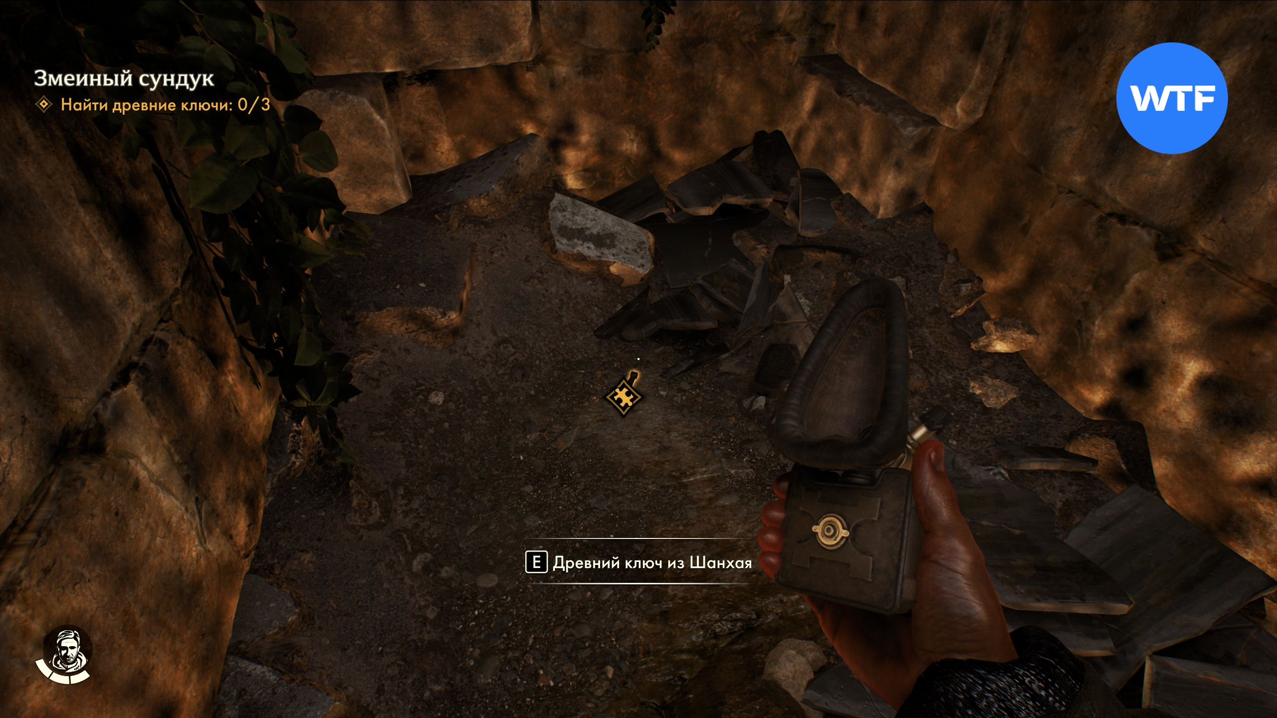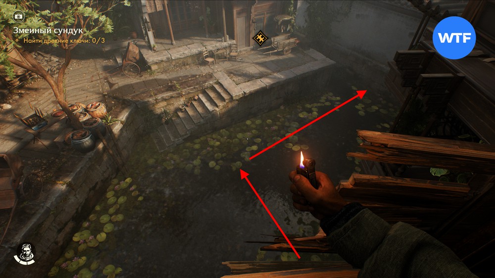 Прыгайте вниз, ныряйте и плывите в сторону стены. Там есть узкий лаз, в который можно проплыть и отодвинуть каменную балку. Это позволит вам добраться до древнего ключа из Шанхая.