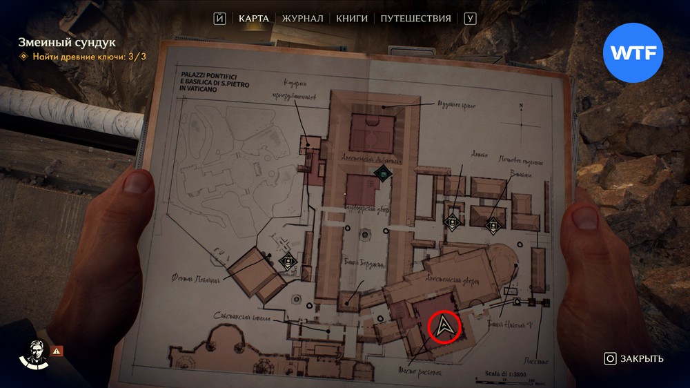 Ныряйте и ищите подводный проход в центре дальней стены комнаты. Поднимите упавшую балку, преграждающую путь, и в итоге доберетесь до скрытой области, где и найдете древний ключ из Ватикана.