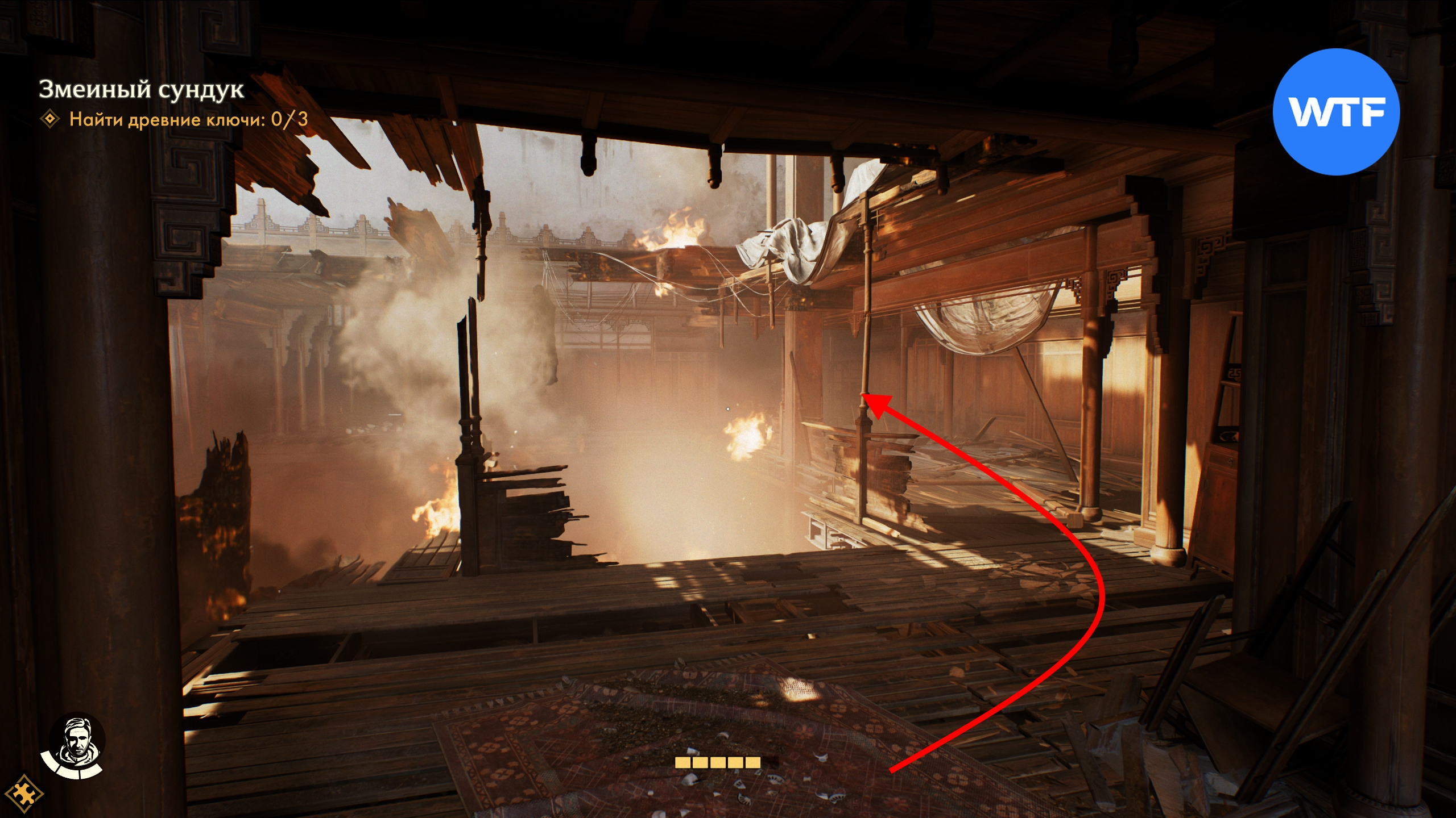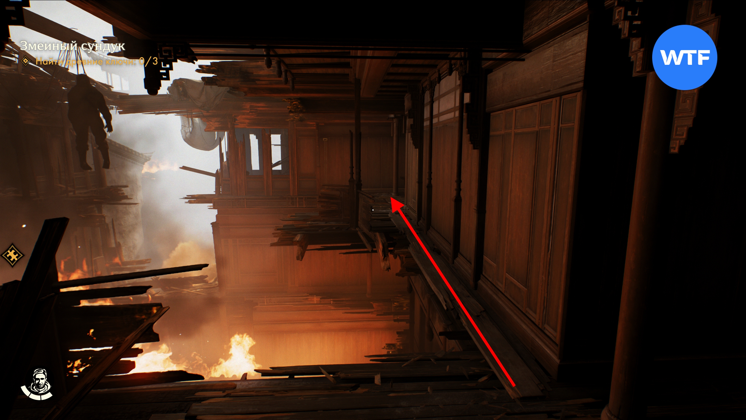 Далее спускайтесь вниз и идите вперед, в горящую комнату. Там вам нужно держаться правой стороны, чтобы обойти огонь по кругу и по узкой балке у стены пробраться к уцелевшей части здания.