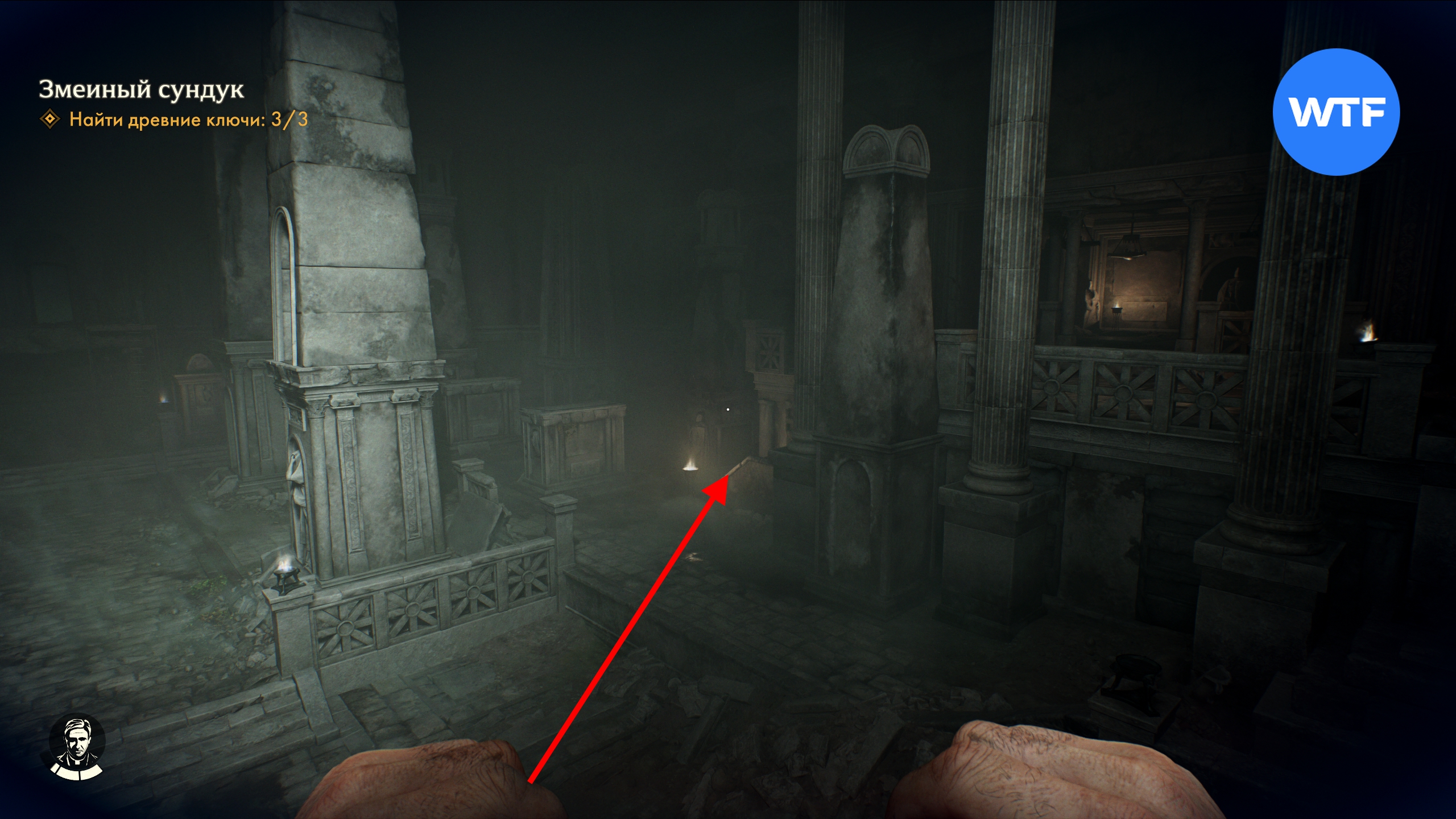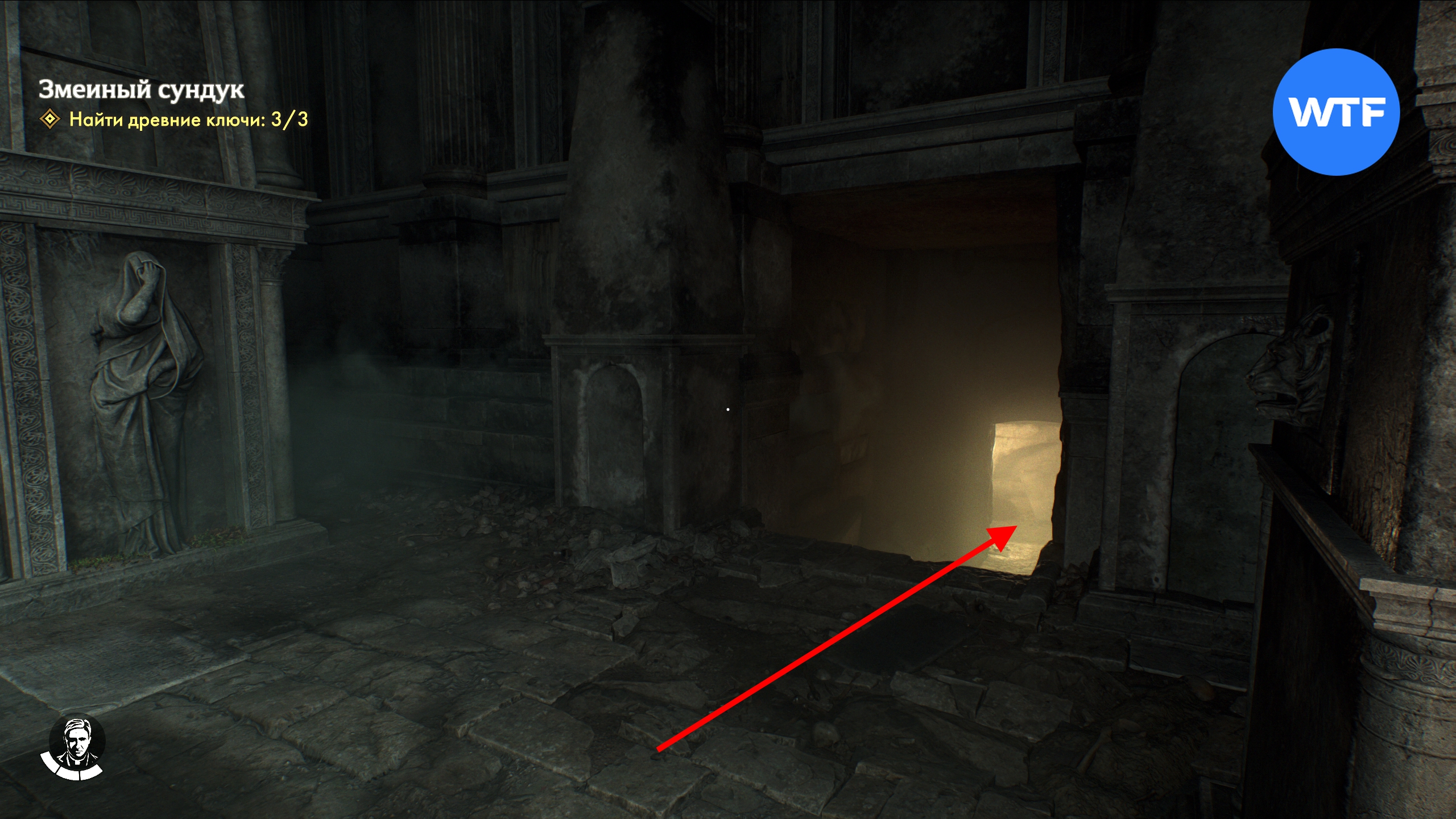 По этому коридору идите вперед и поставьте старинный бюст на каменный постамент, чтобы открыть решетку.