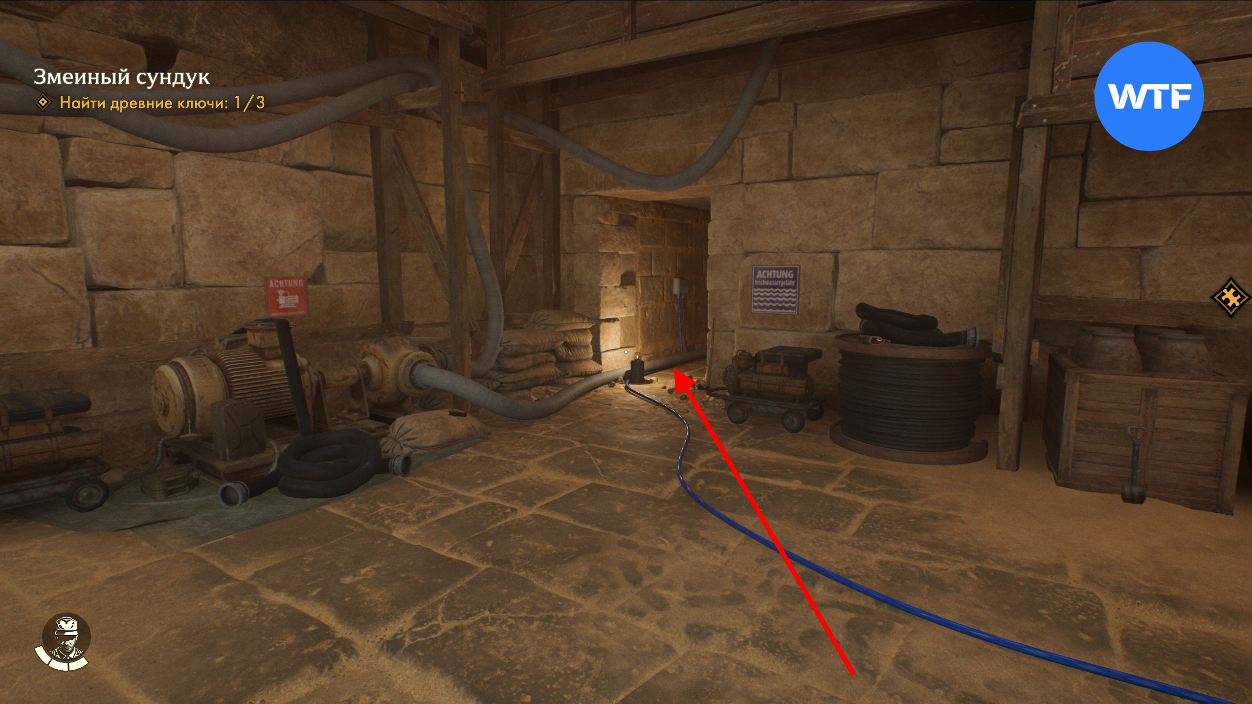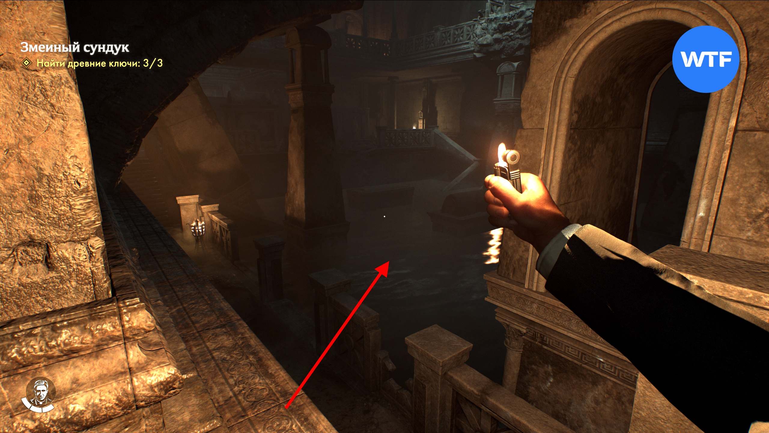 В этом зале прыгайте в воду и плывите в дальний правый угол, где есть проход. Затем отодвиньте каменную балку под водой и в итоге доберетесь до древнего ключа из Гизы.
