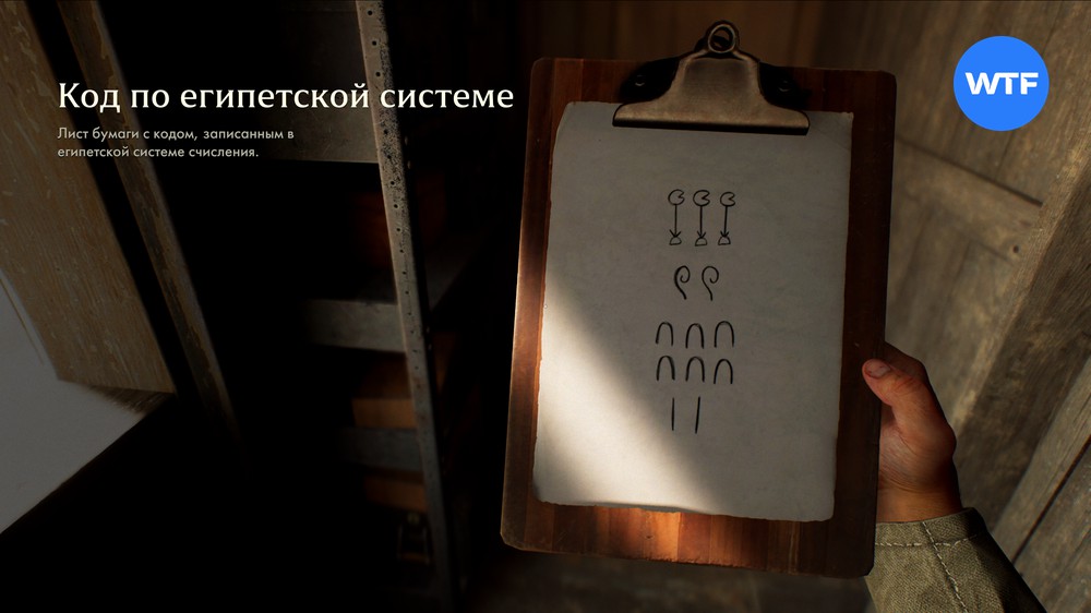 Рядом с запертым ящиком вы также найдете планшет с прикрепленным к нему листком, на котором записан Код по египетской системе. Если подставить вместо картинок значения из записки выше, то получим следующее: