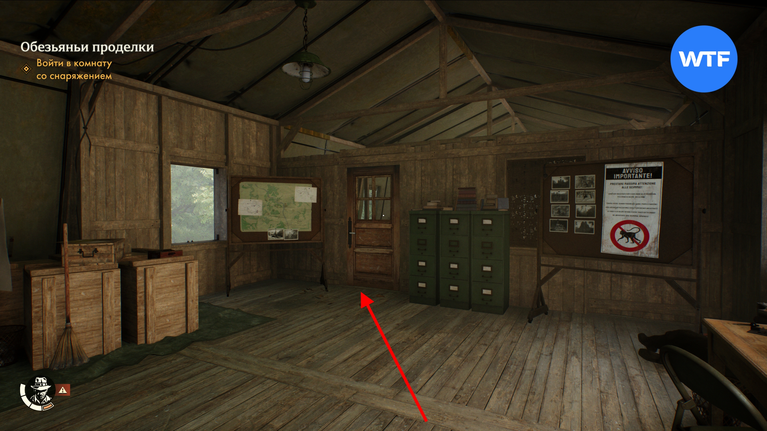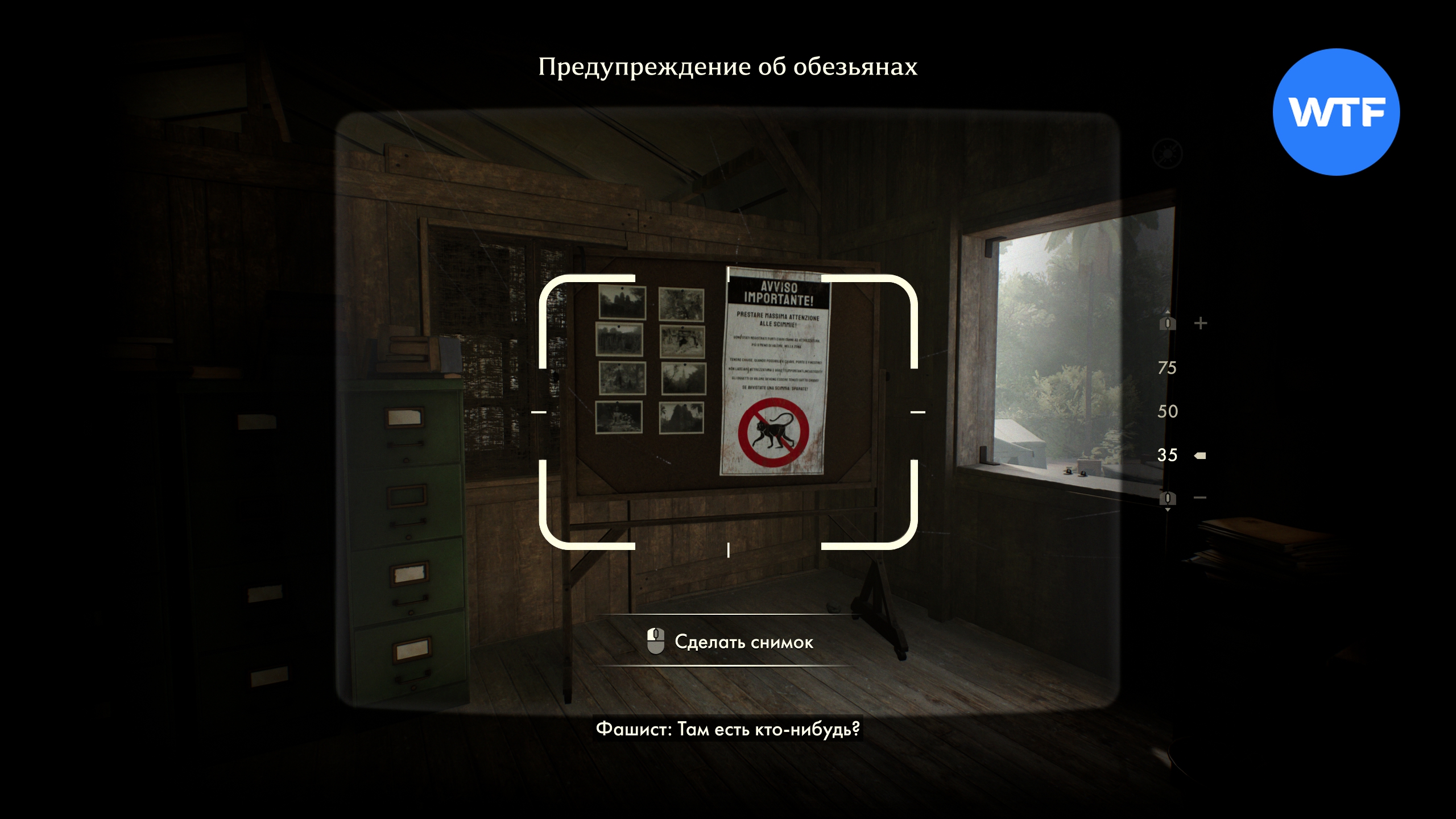 В комнате вам нужно сфотографировать Предупреждение об обезьянах, висящее на доске у окна, а также прочитать две записки: одна лежит на столе, а вторая прикреплена к шкафчику с ключами у входа.