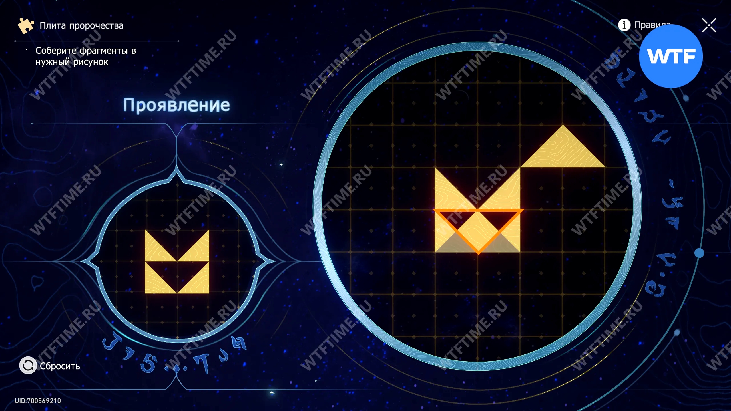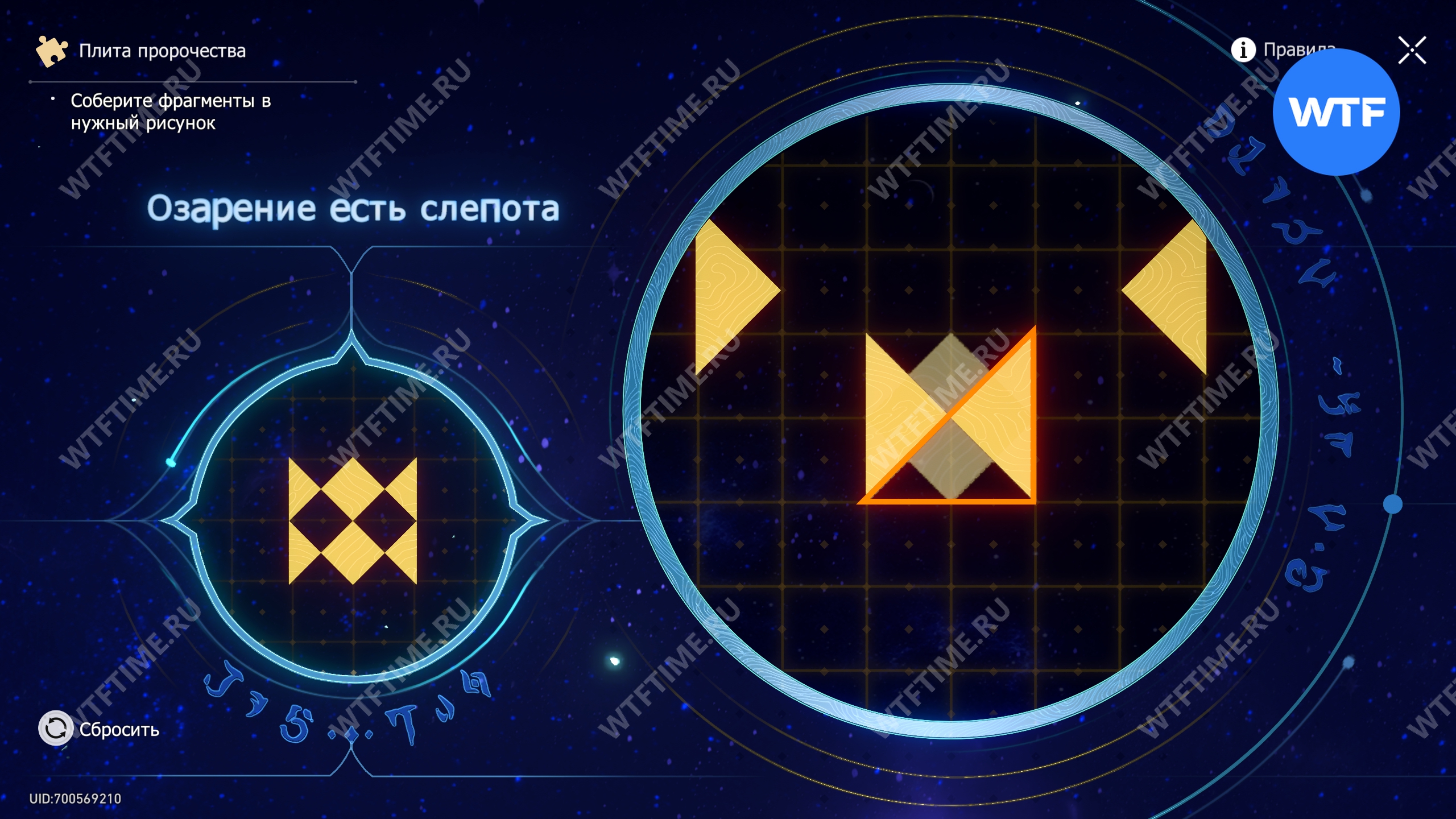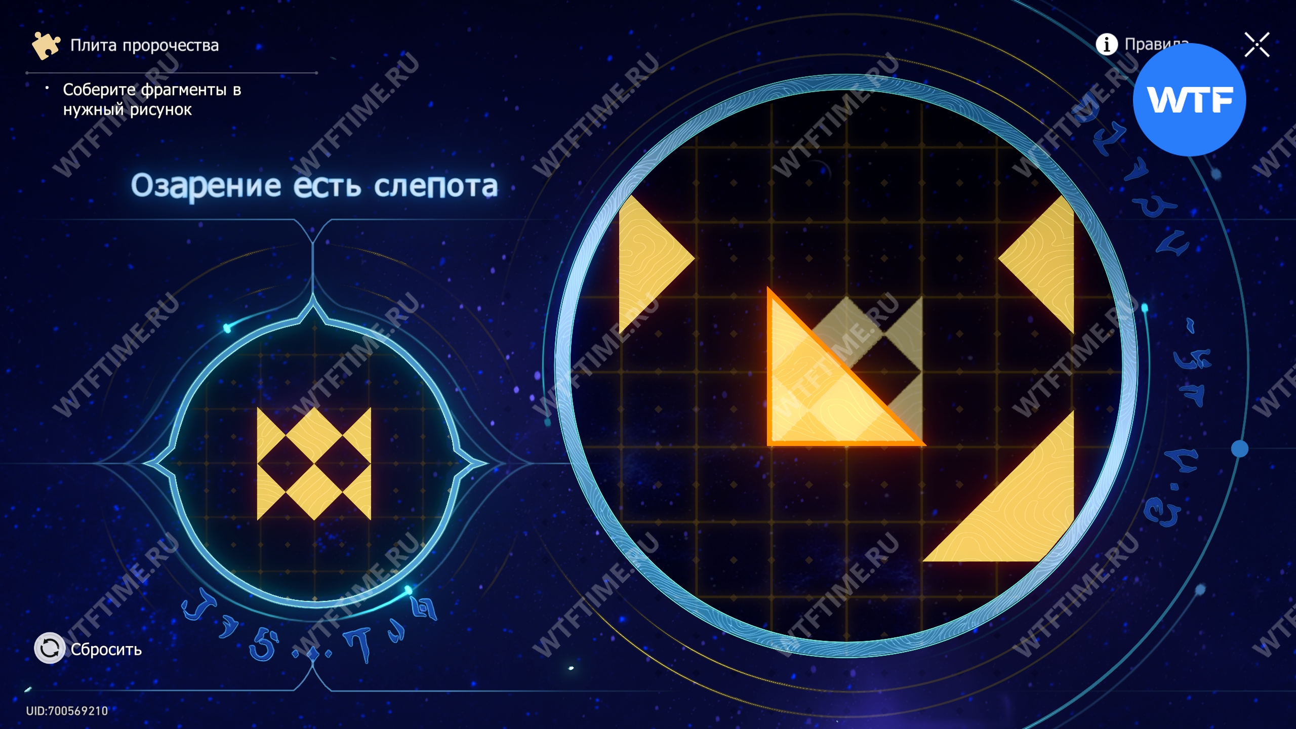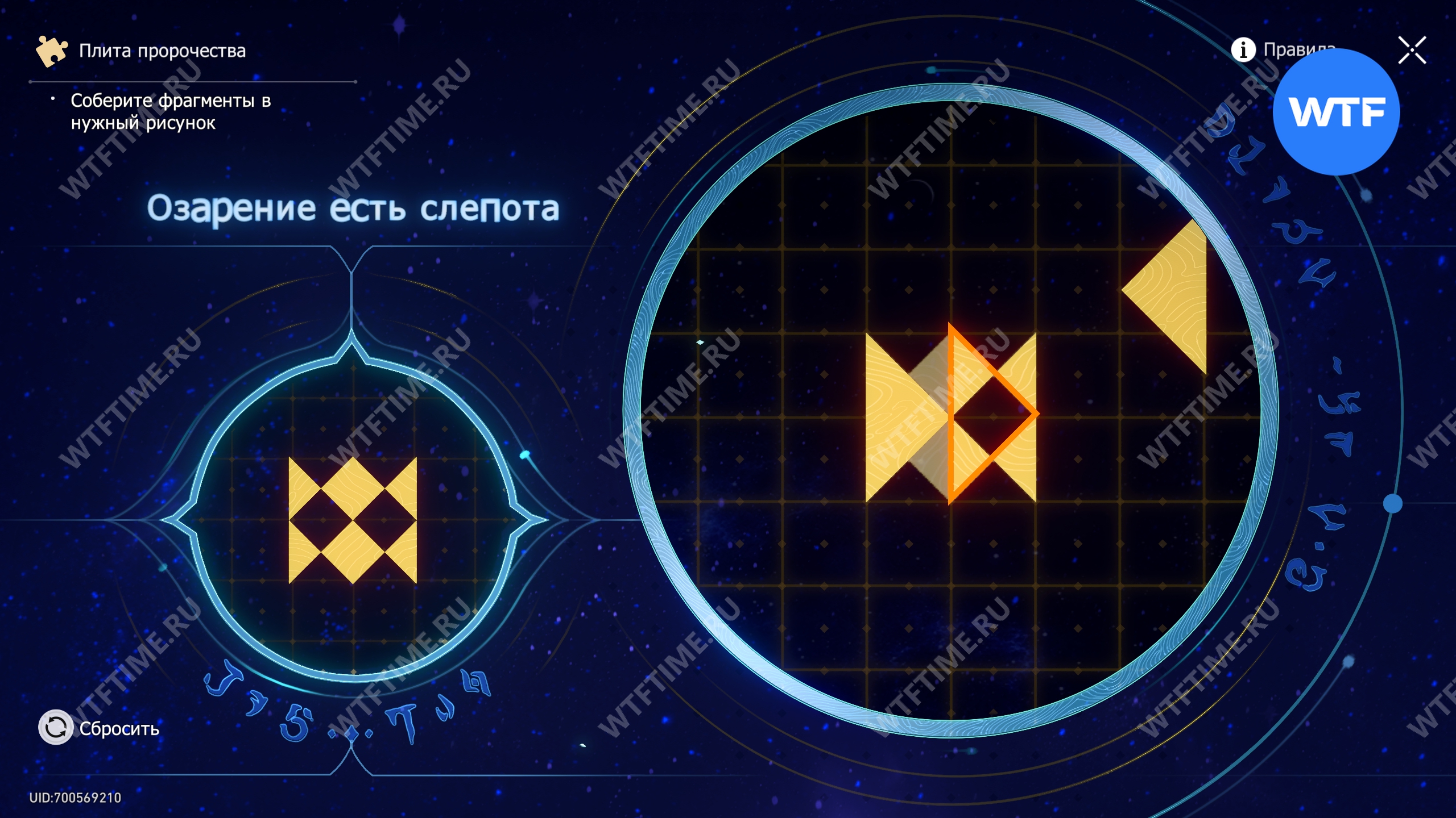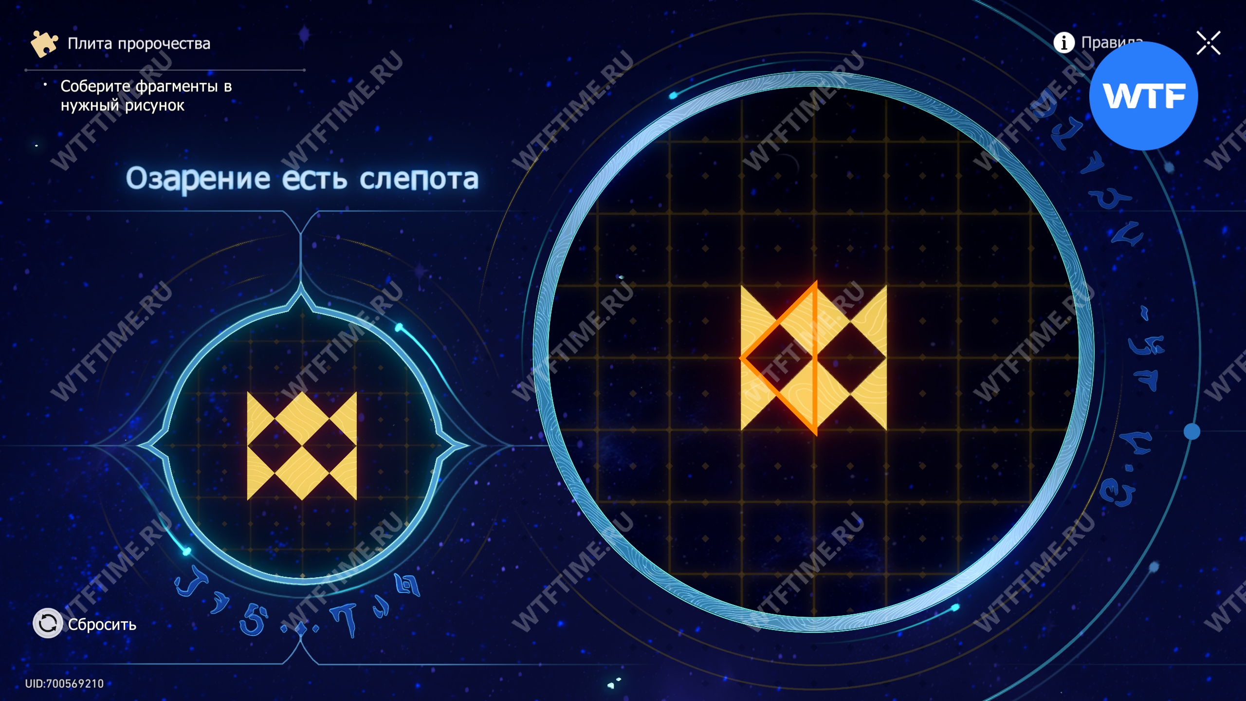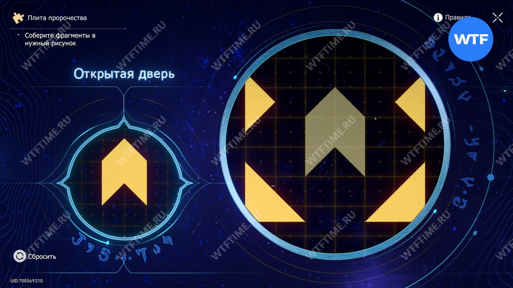 При запуске головоломки с плитой пророчества вы видите два изображения: левое показывает, какой результат должен получиться, а правое содержит разрозненные фрагменты, которые нужно расположить в верном порядке.