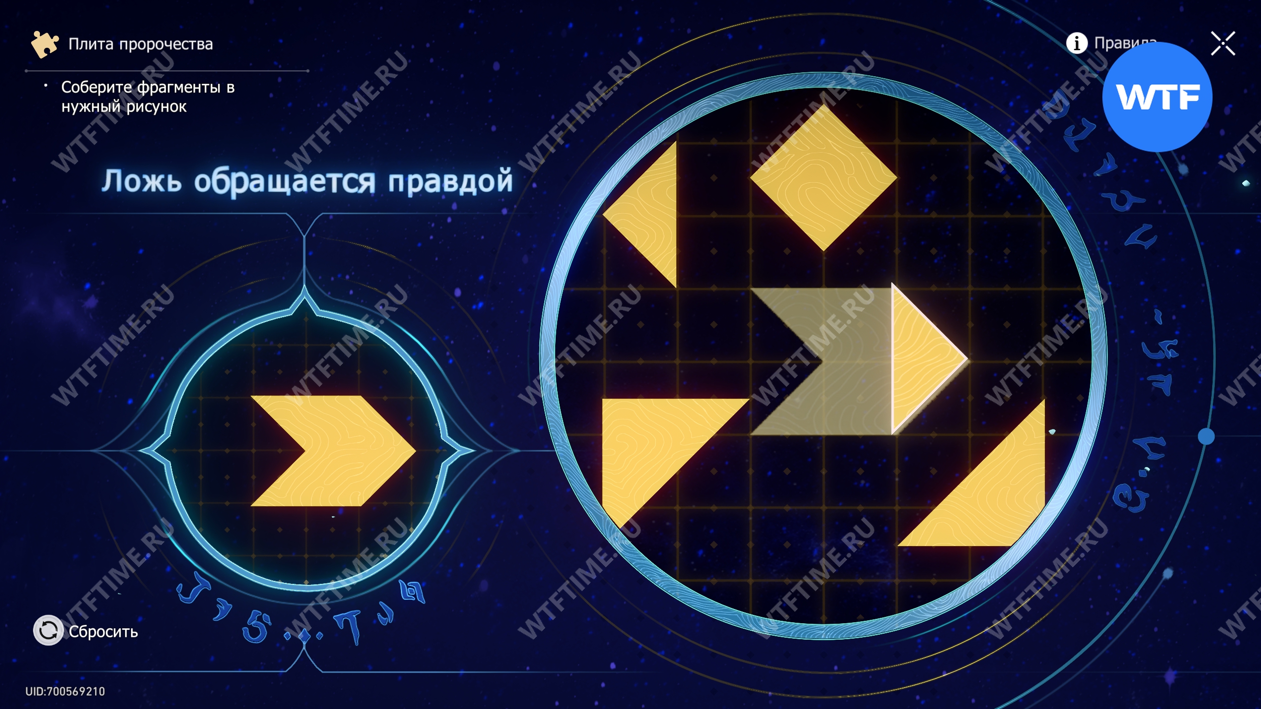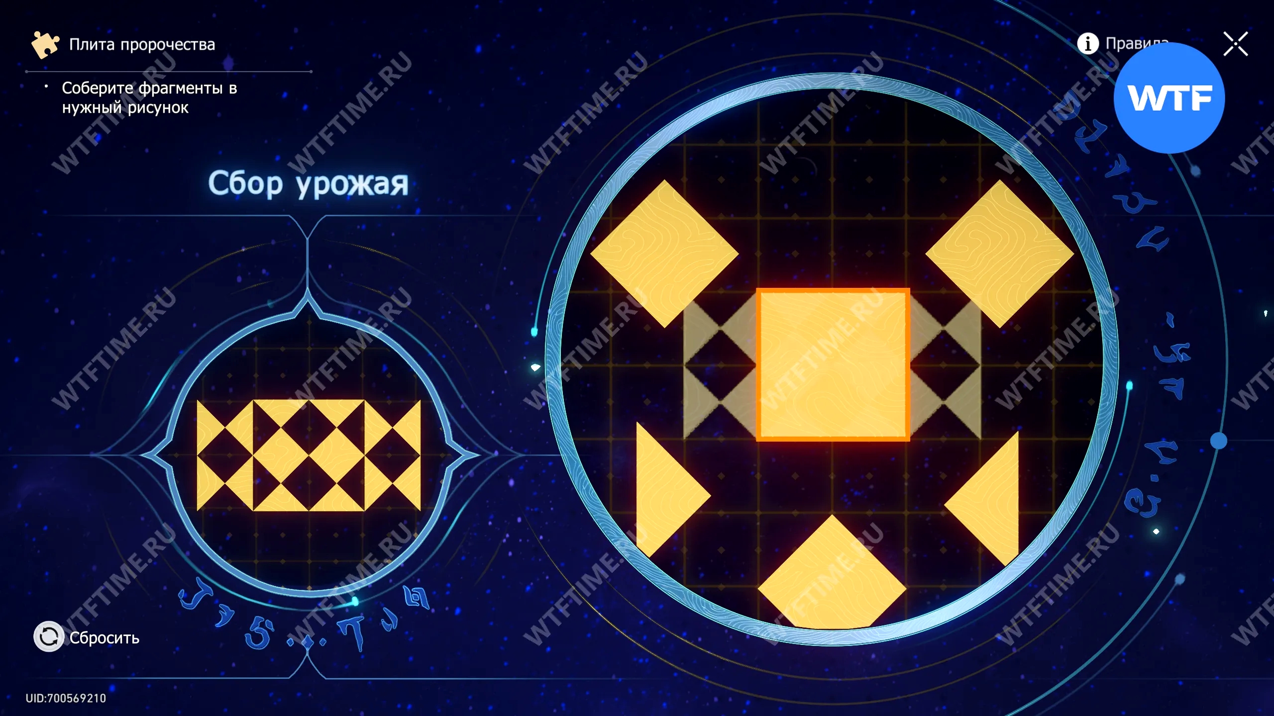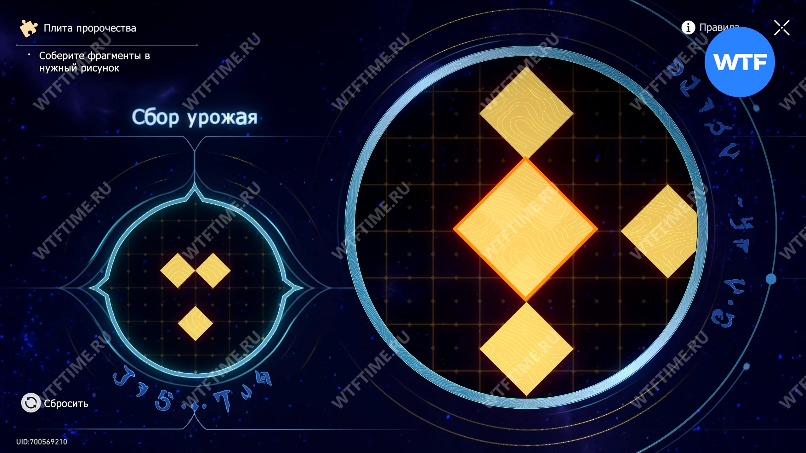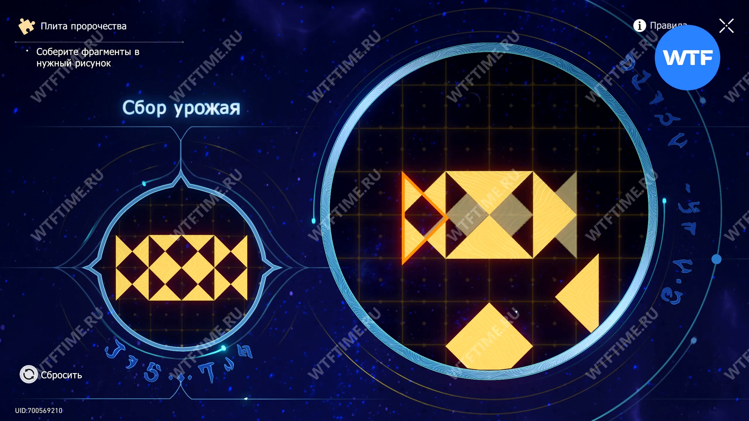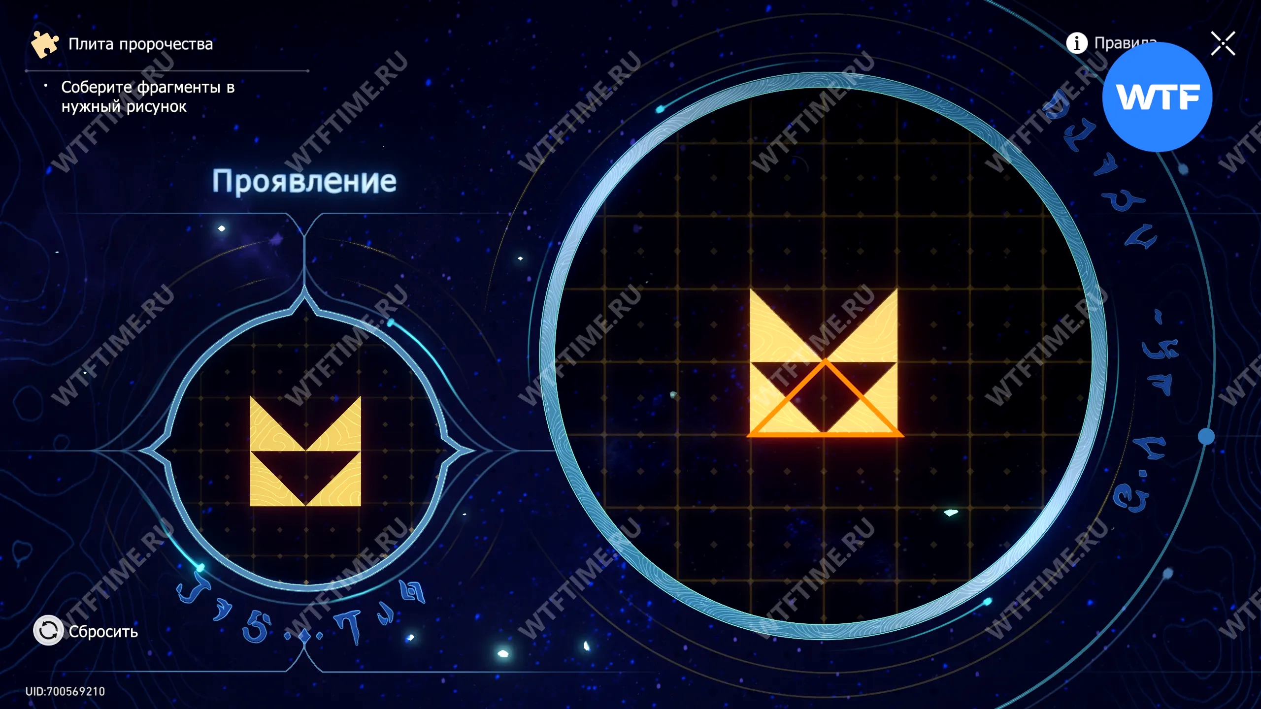 При запуске головоломки с плитой пророчества вы видите два изображения: левое показывает, какой результат должен получиться, а правое содержит разрозненные фрагменты, которые нужно расположить в верном порядке.