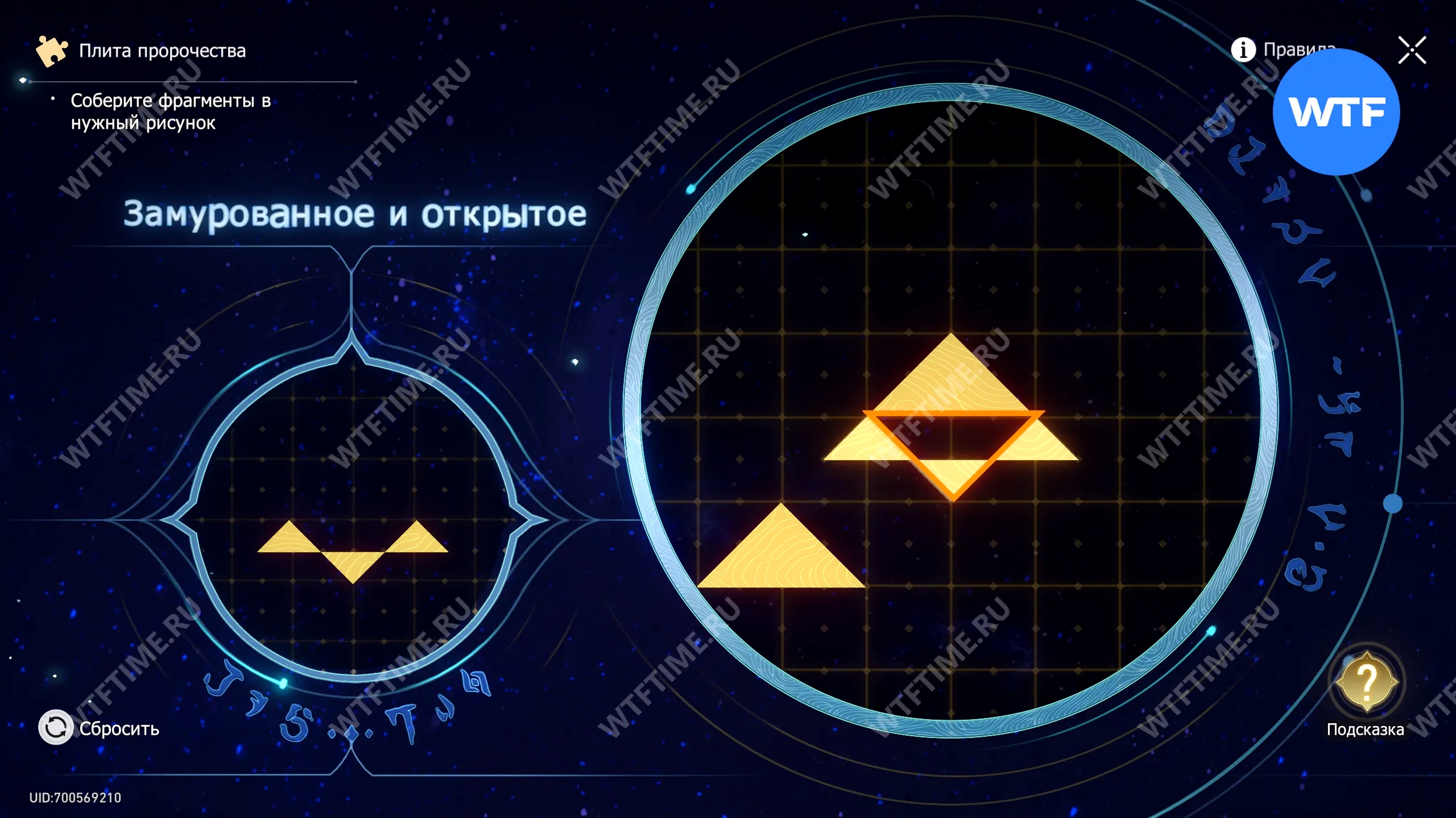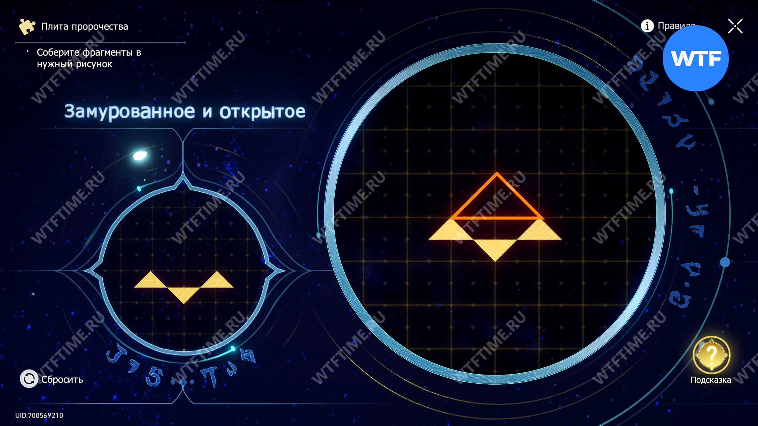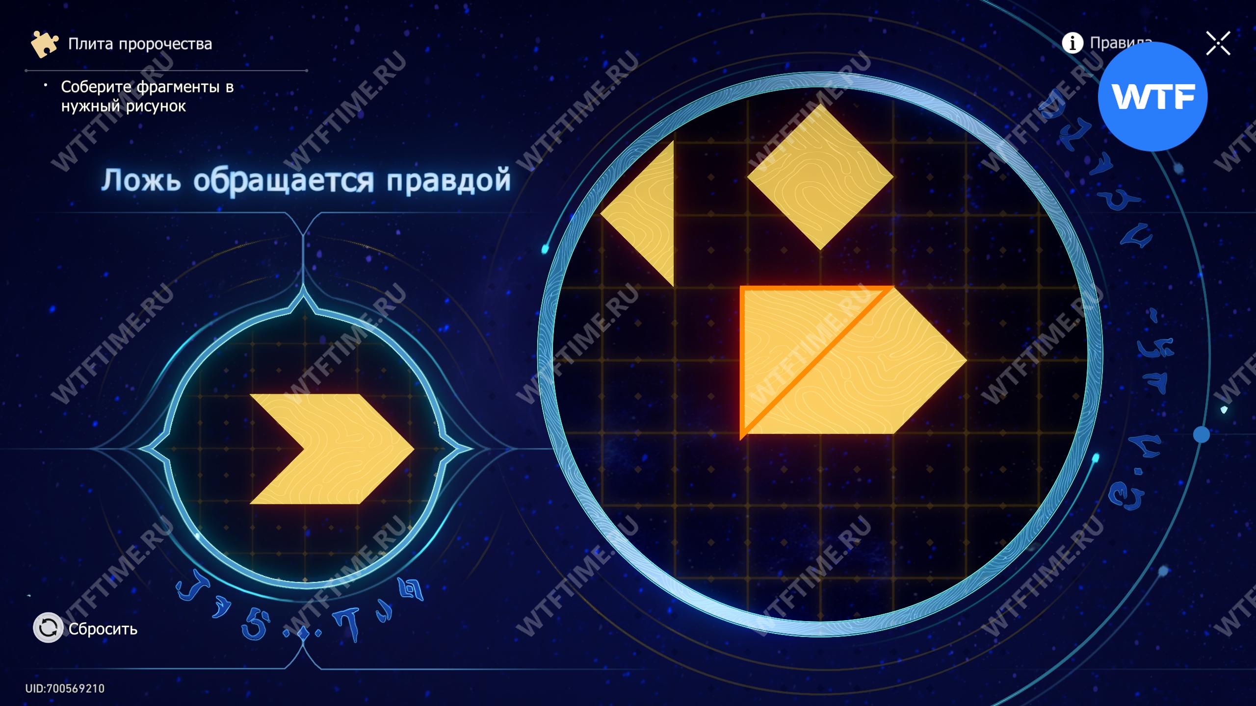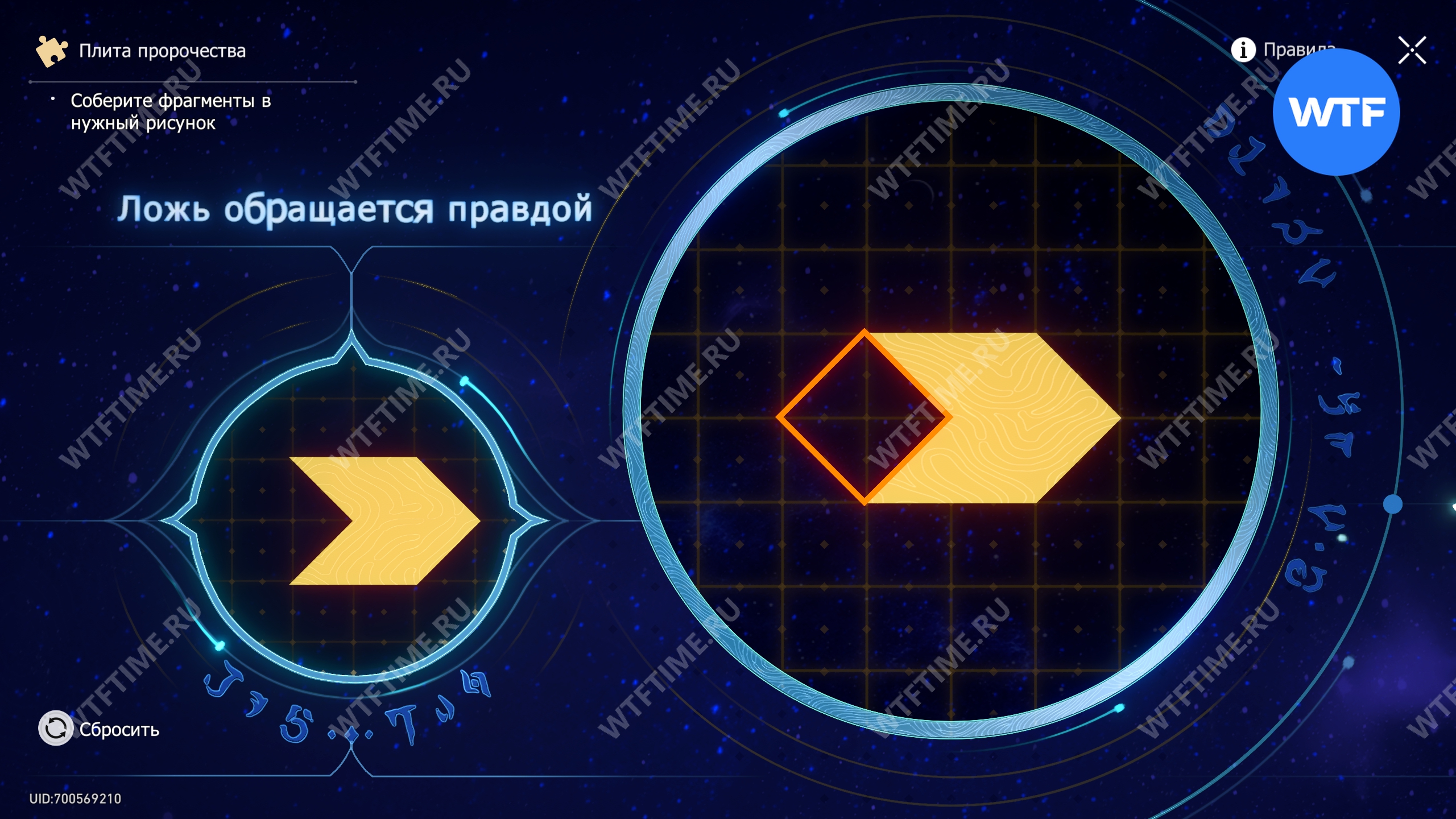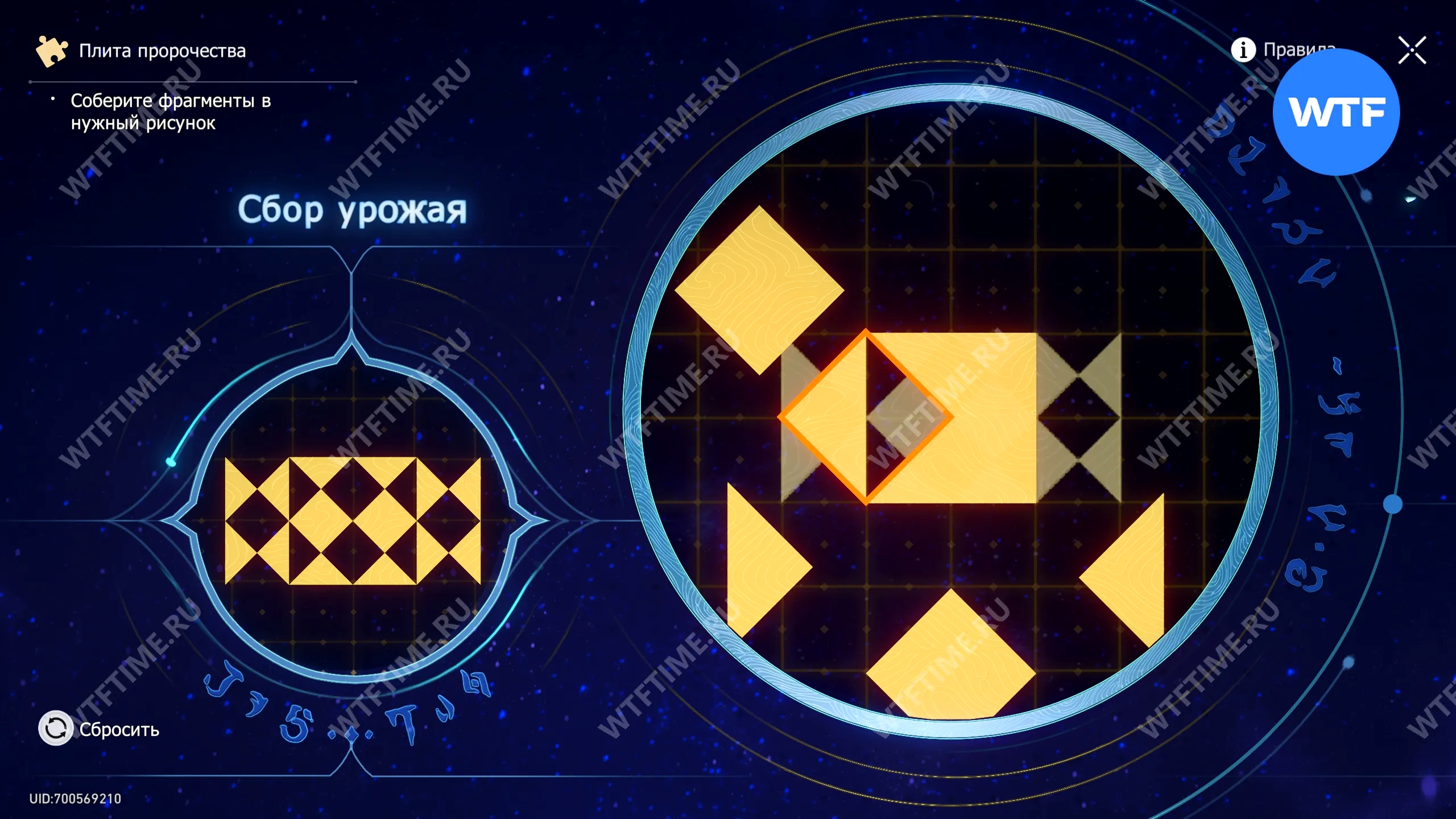 При запуске головоломки с плитой пророчества вы видите два изображения: левое показывает, какой результат должен получиться, а правое содержит разрозненные фрагменты, которые нужно расположить в верном порядке.