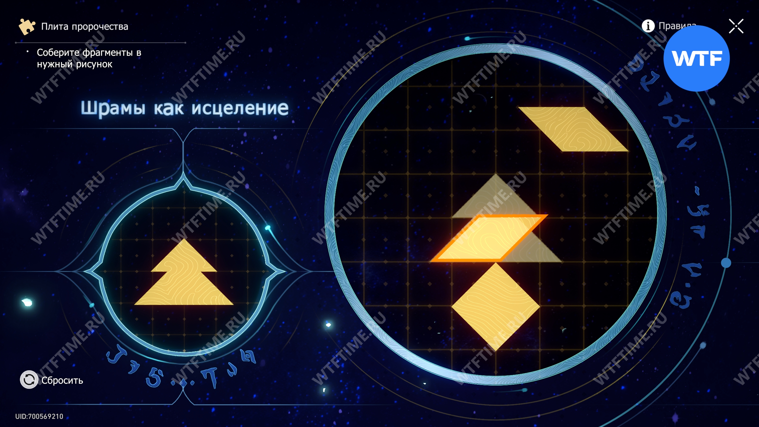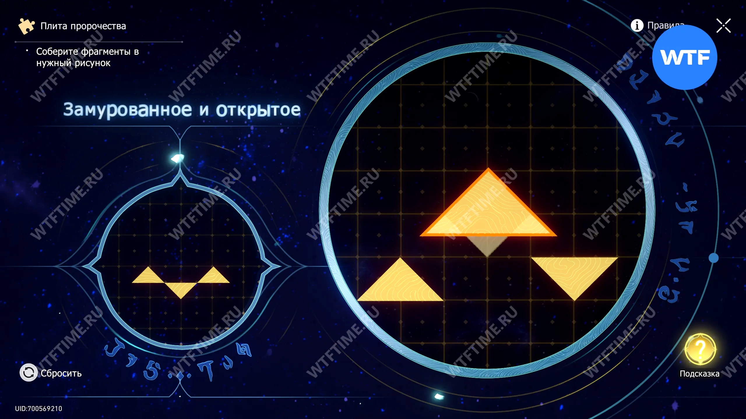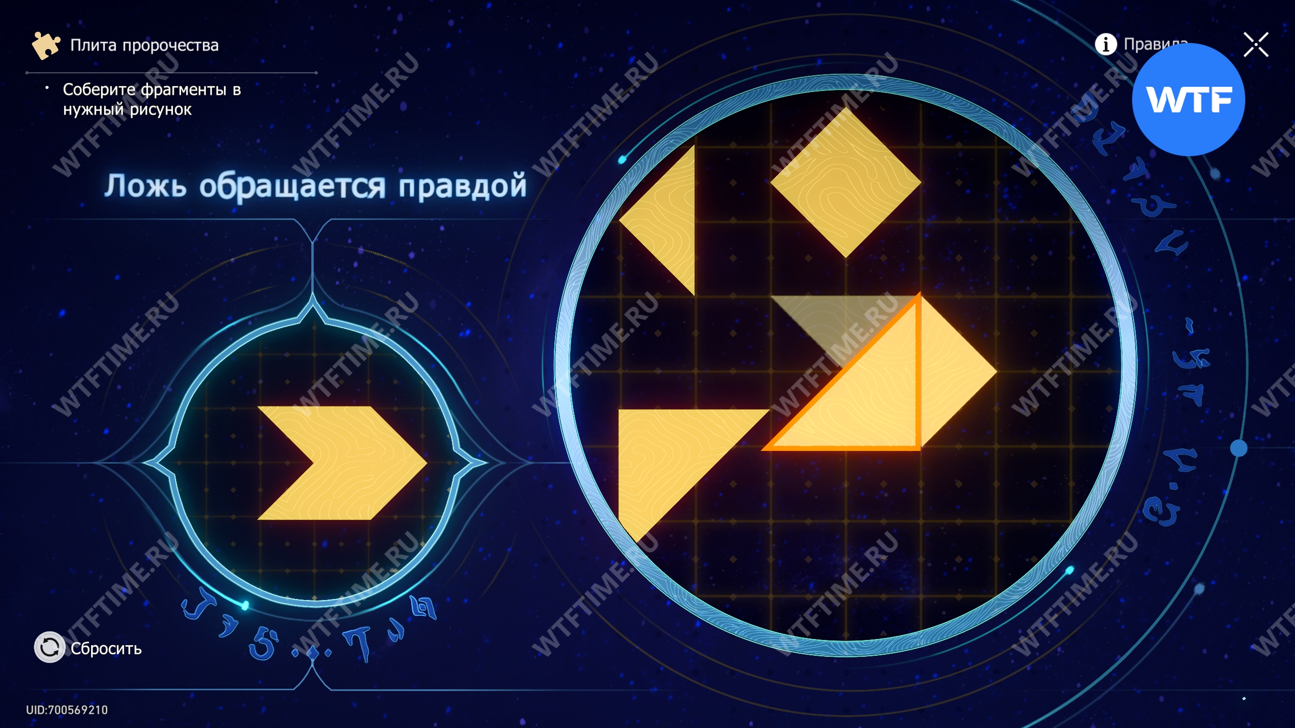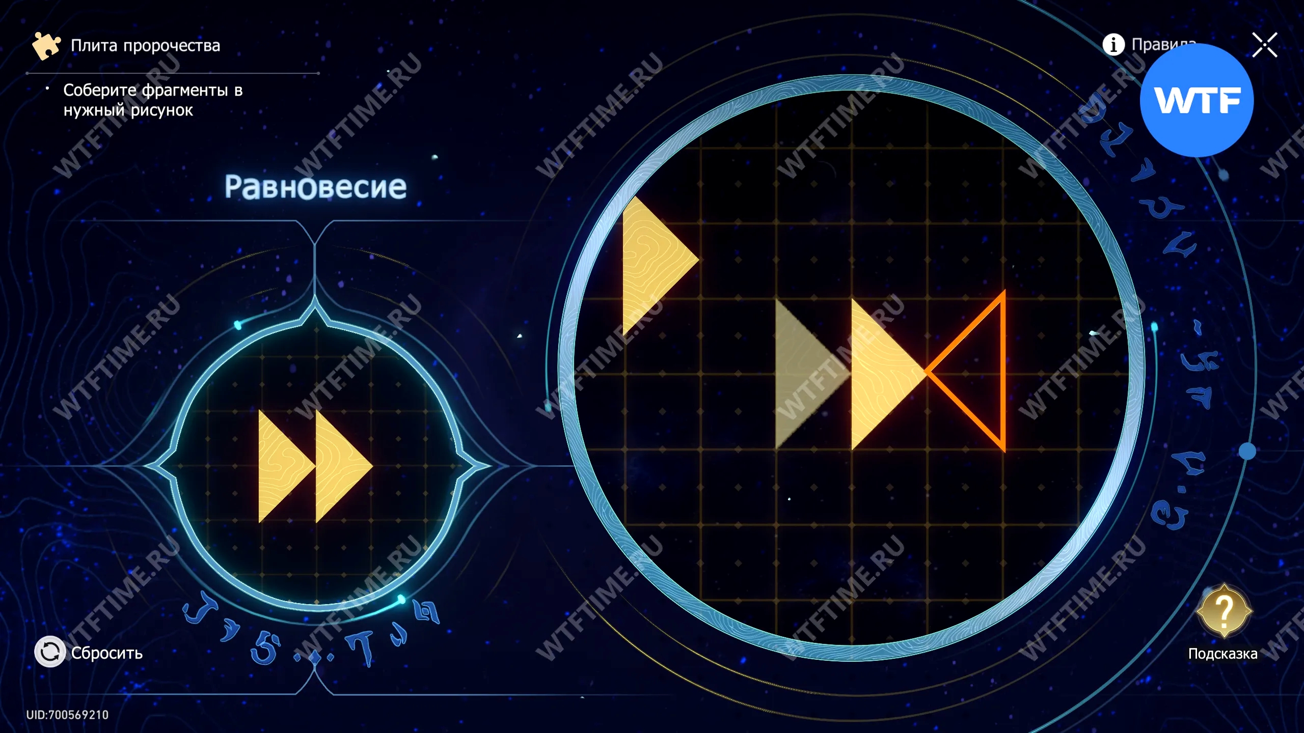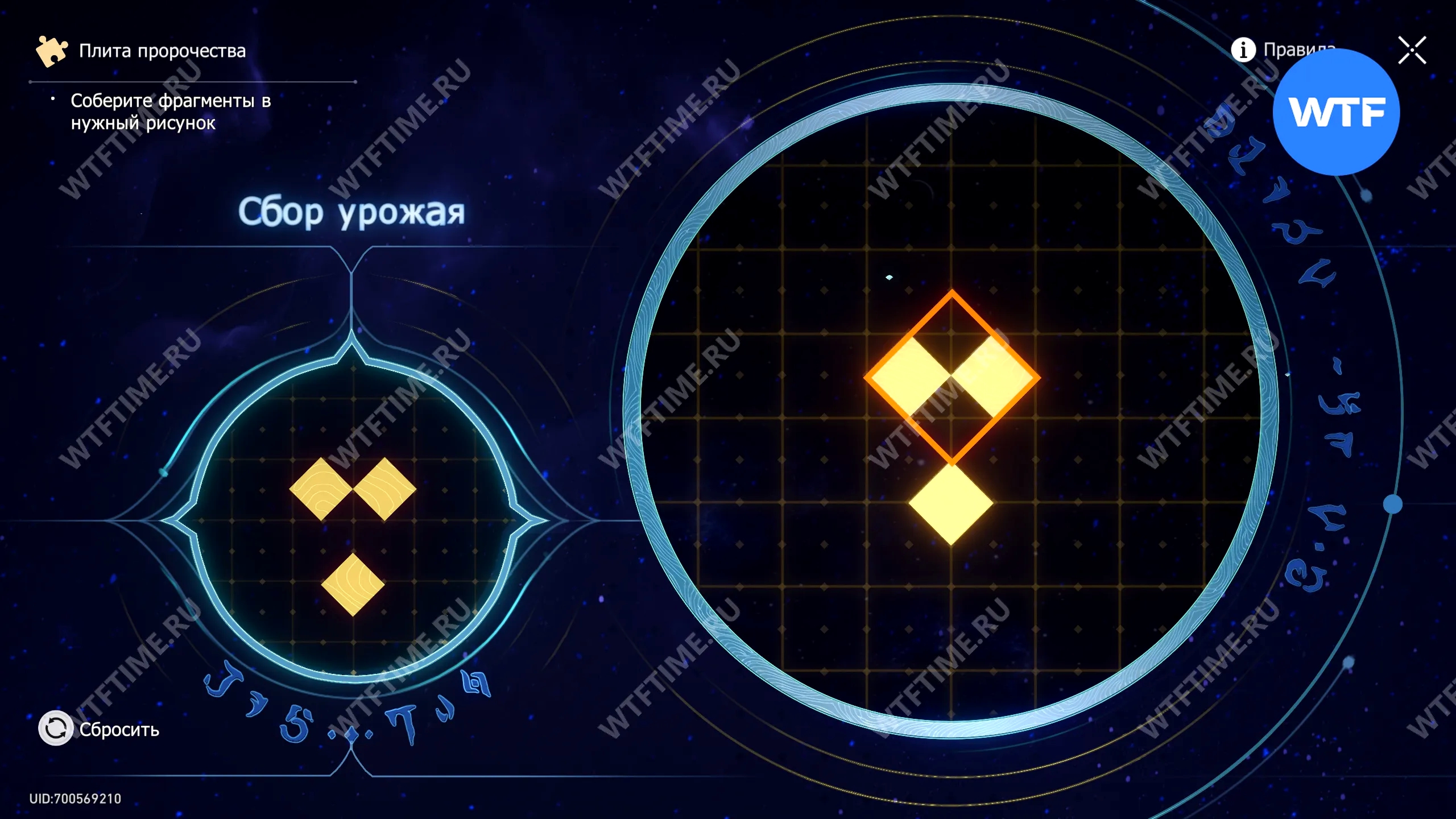 При запуске головоломки с плитой пророчества вы видите два изображения: левое показывает, какой результат должен получиться, а правое содержит разрозненные фрагменты, которые нужно расположить в верном порядке.