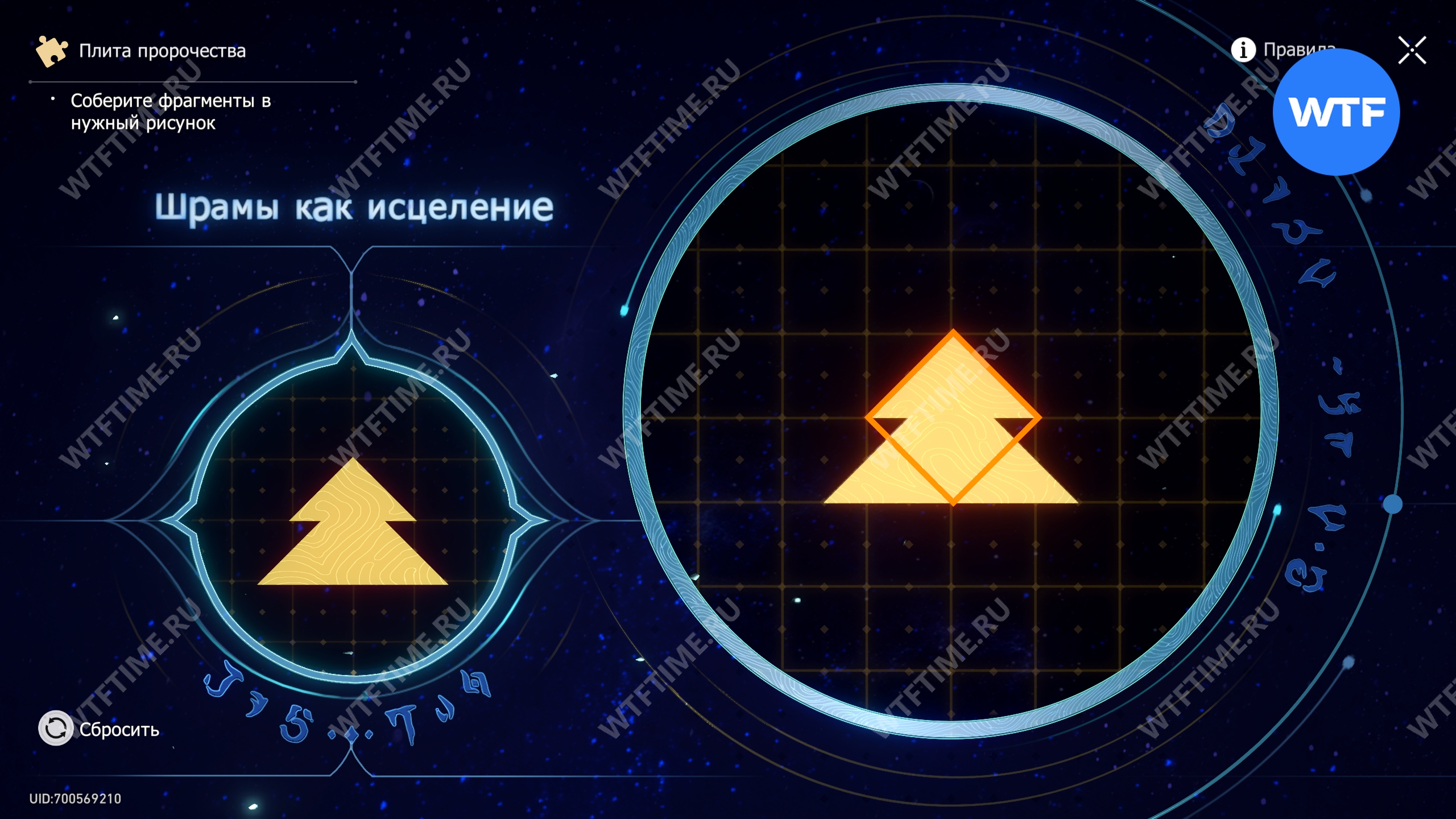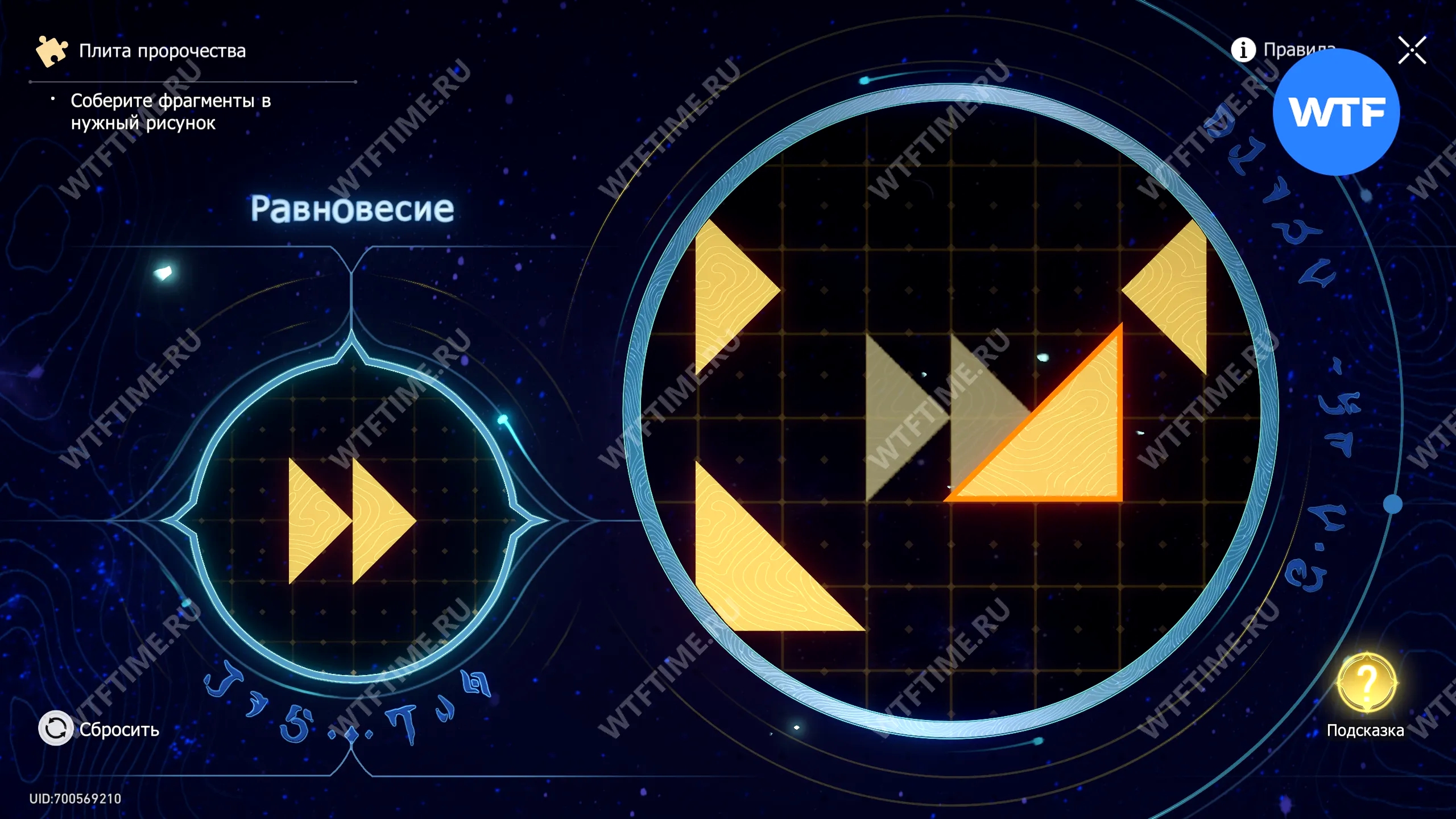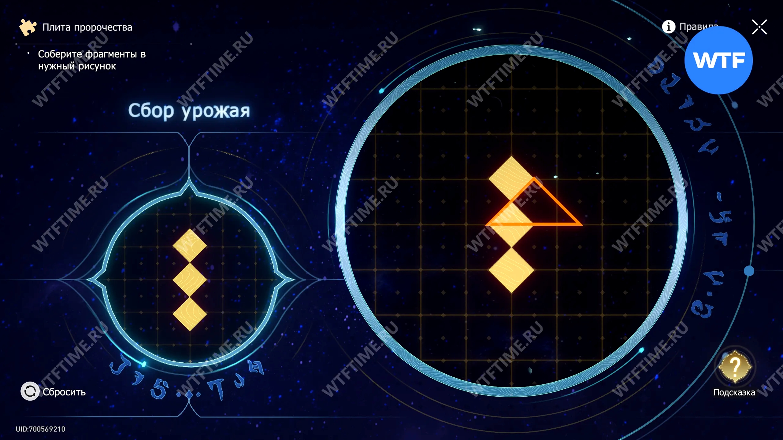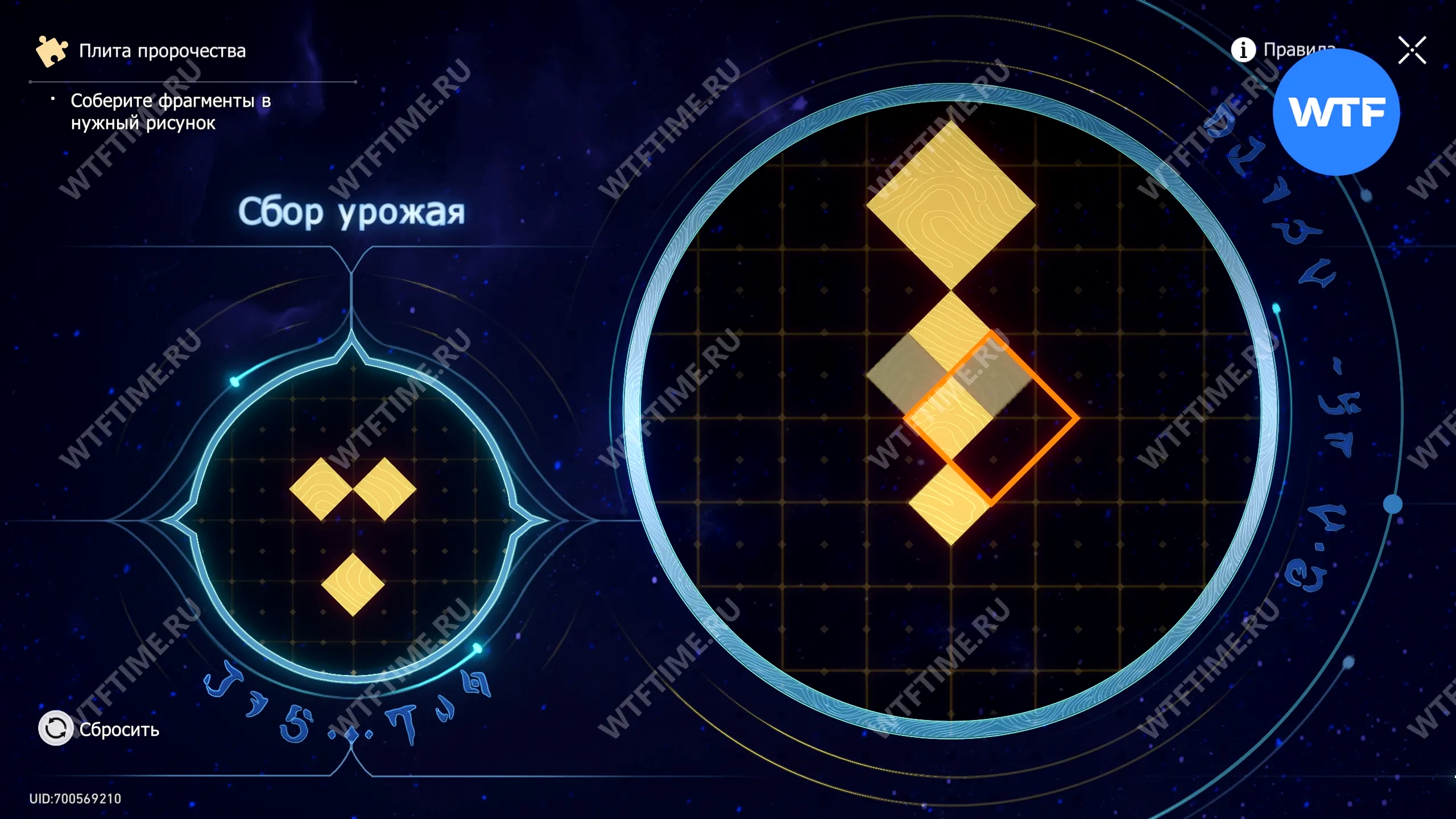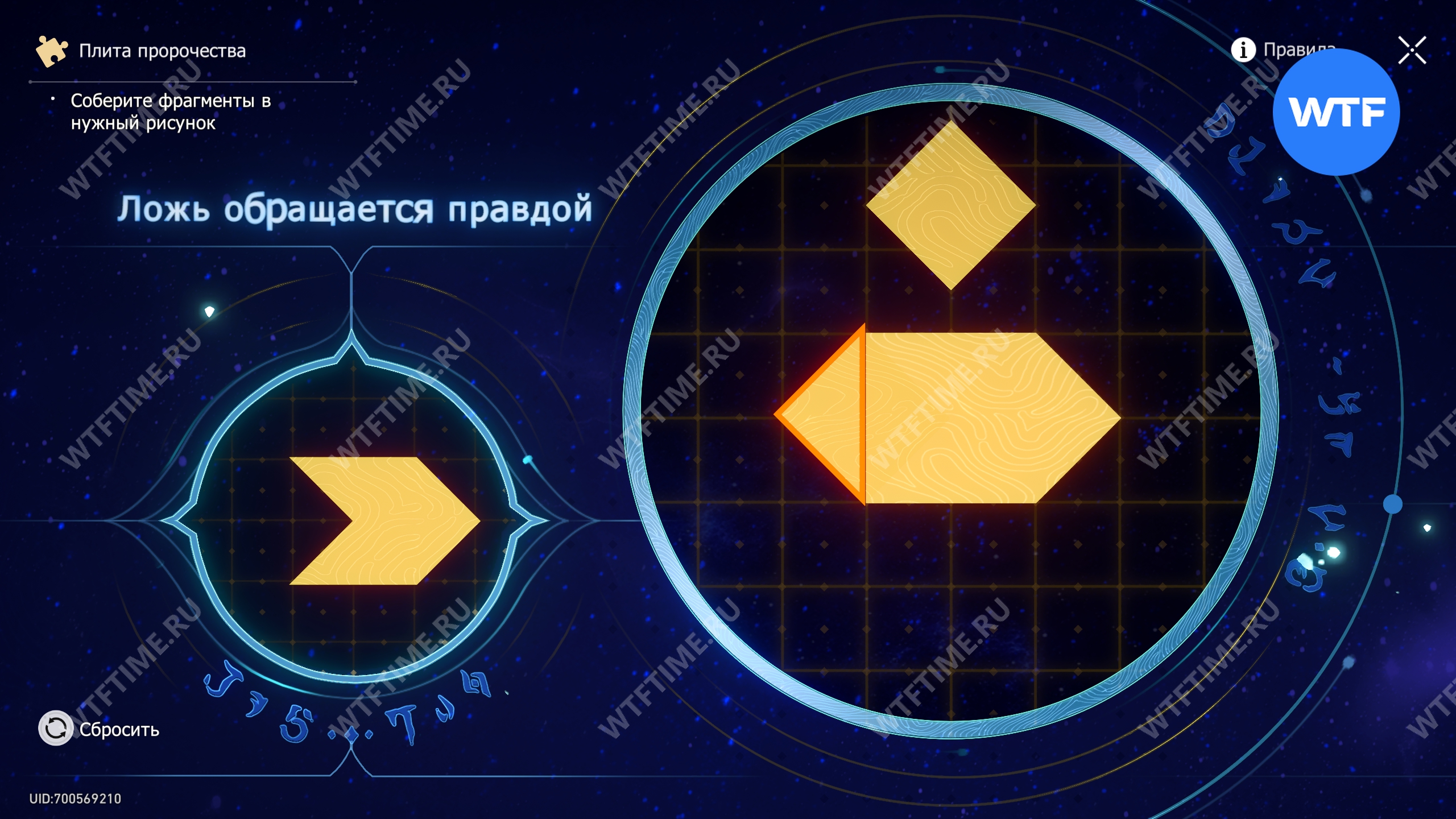 При запуске головоломки с плитой пророчества вы видите два изображения: левое показывает, какой результат должен получиться, а правое содержит разрозненные фрагменты, которые нужно расположить в верном порядке.