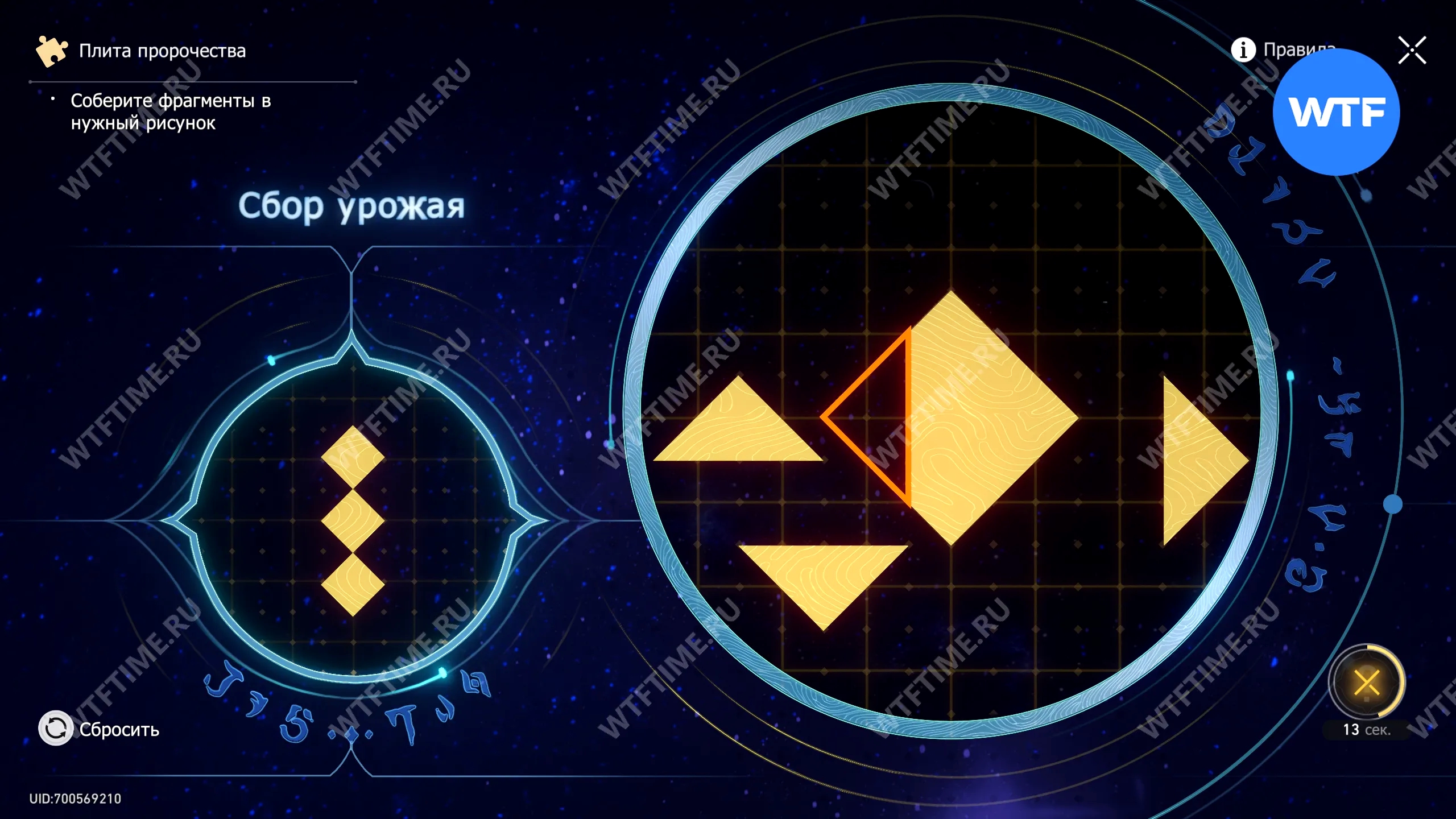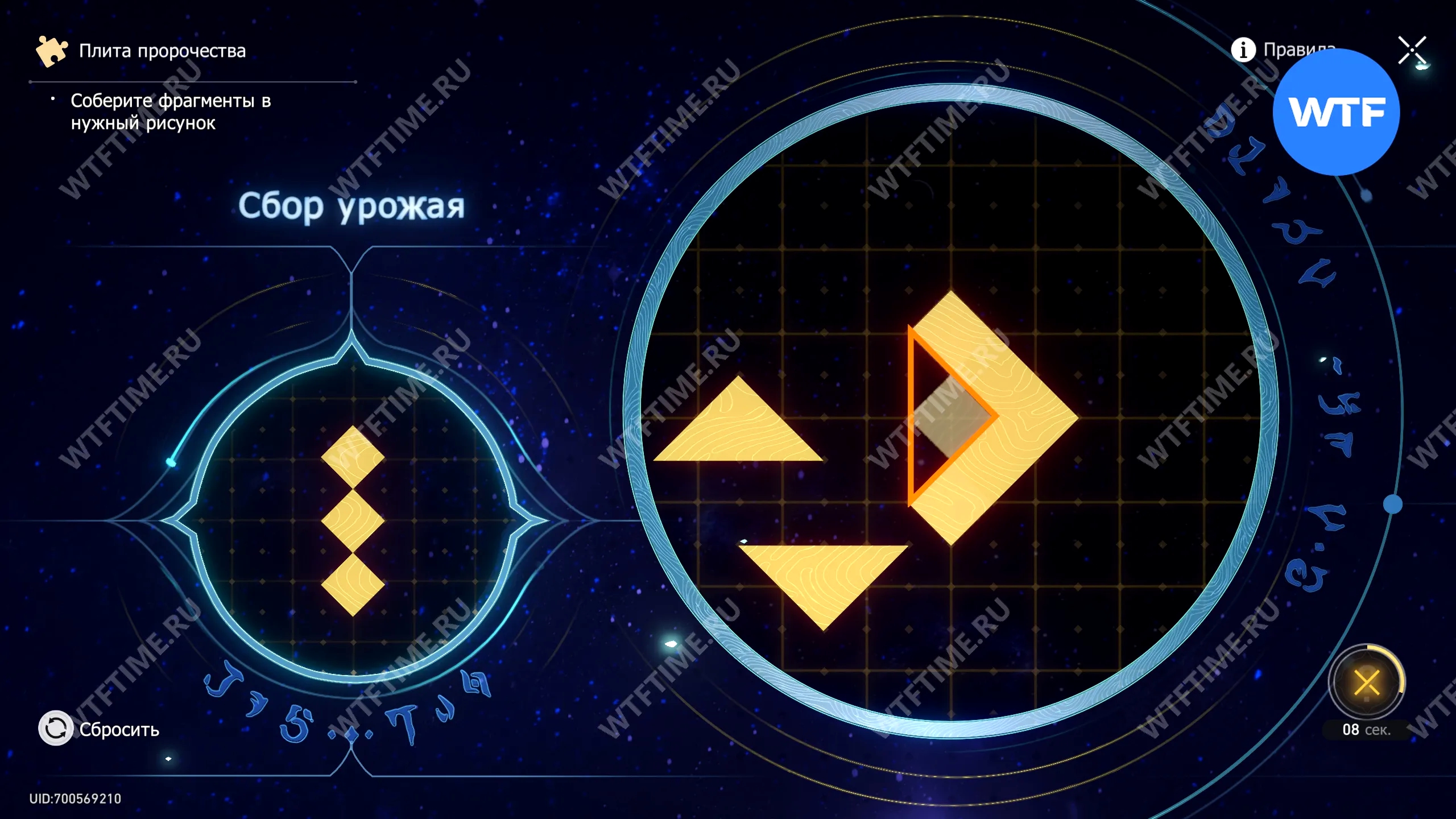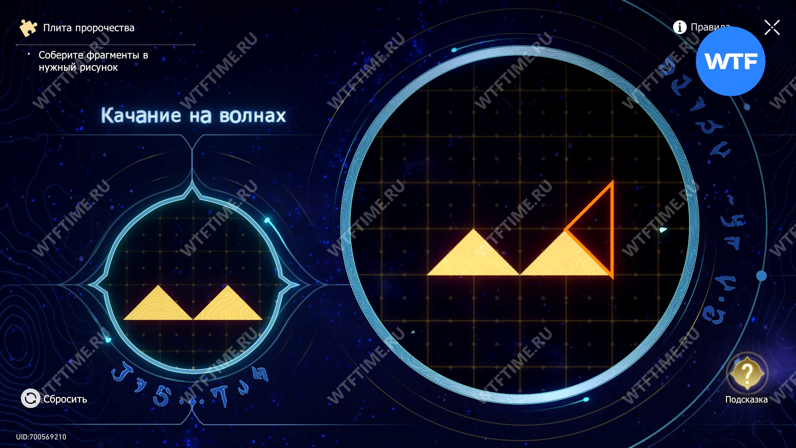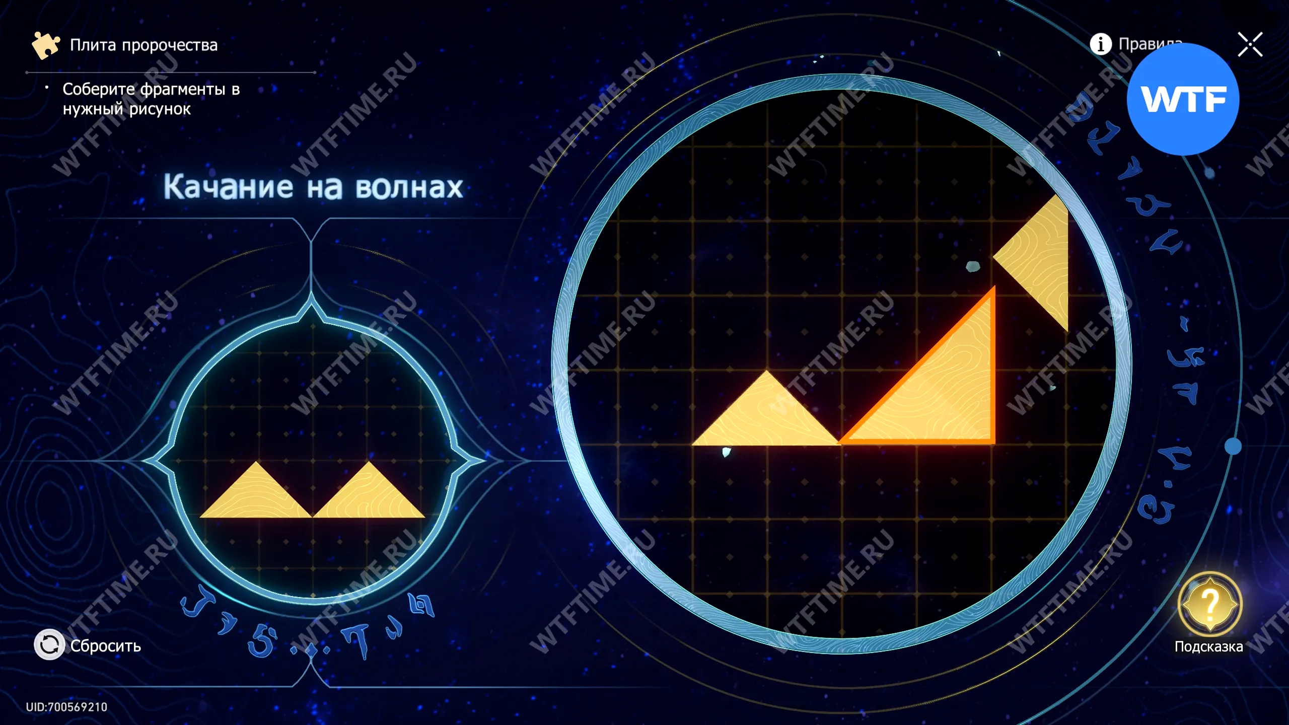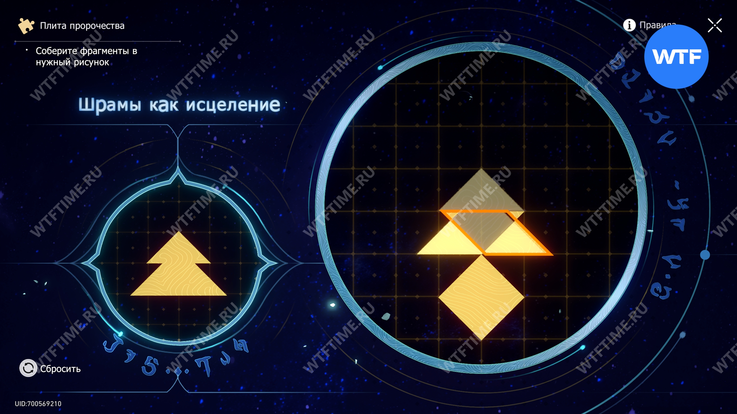 При запуске головоломки с плитой пророчества вы видите два изображения: левое показывает, какой результат должен получиться, а правое содержит разрозненные фрагменты, которые нужно расположить в верном порядке.