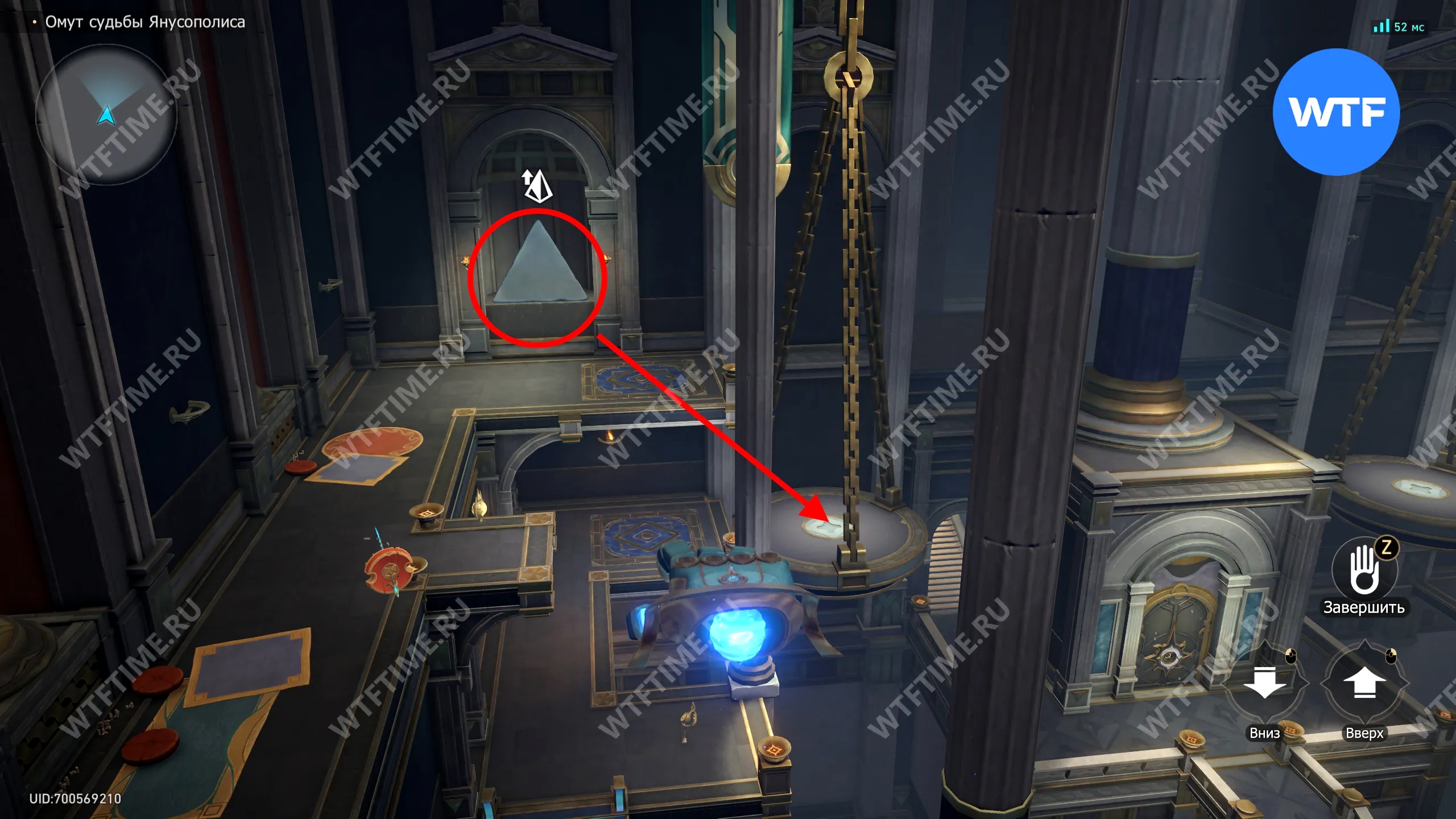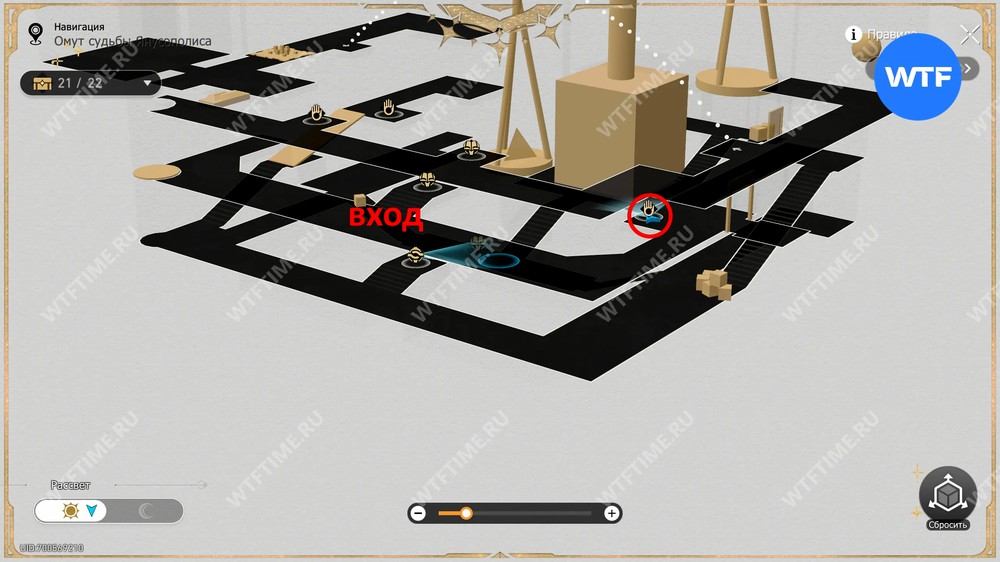 Добраться до ценного сундука, выданного в награду, вы сможете только после того как решите плиту пророчества «Равновесие» на этом же этаже и получите большую пирамиду. Поставив ее на левую чашу весов, сами вы сможете стать на праву, чтобы таким образом подняться наверх.