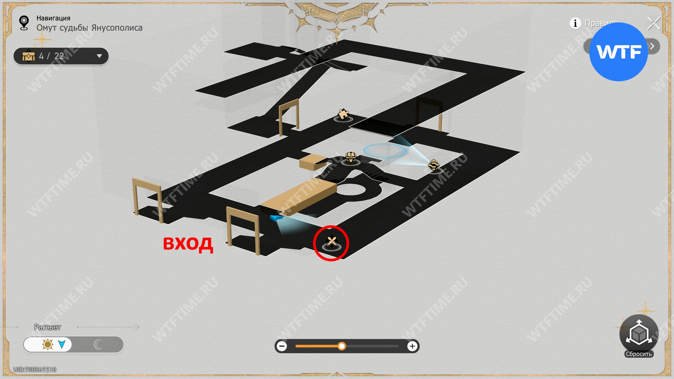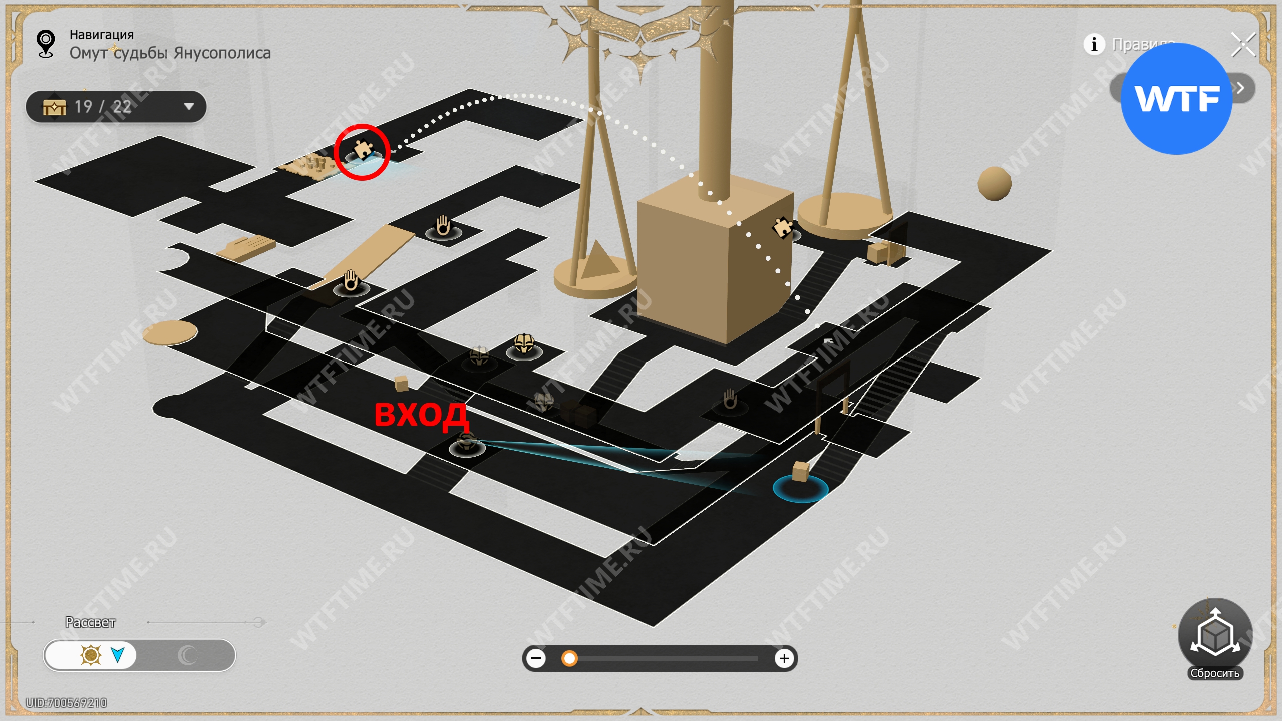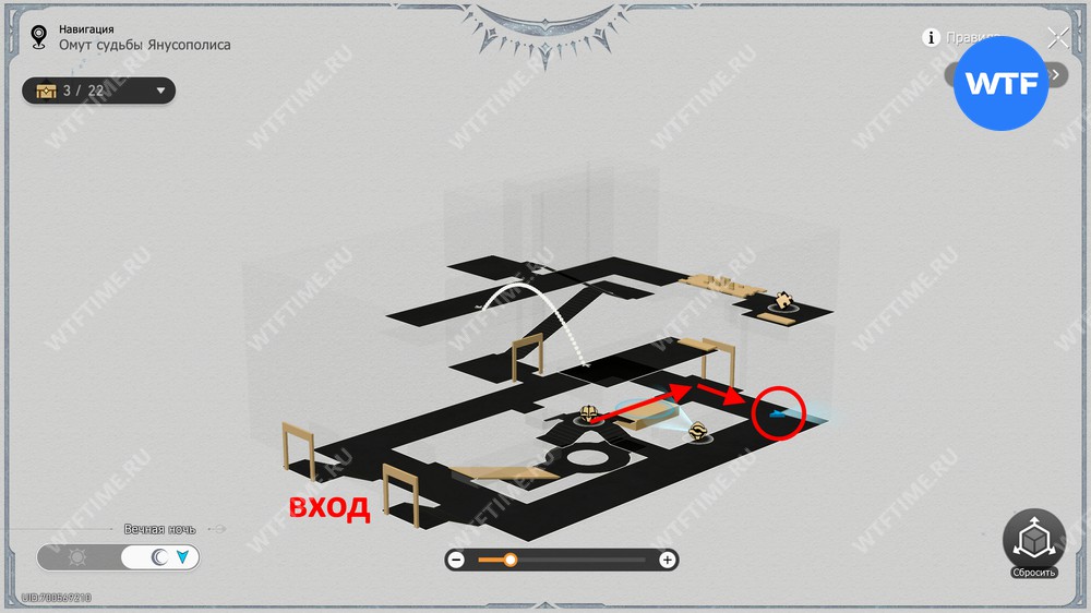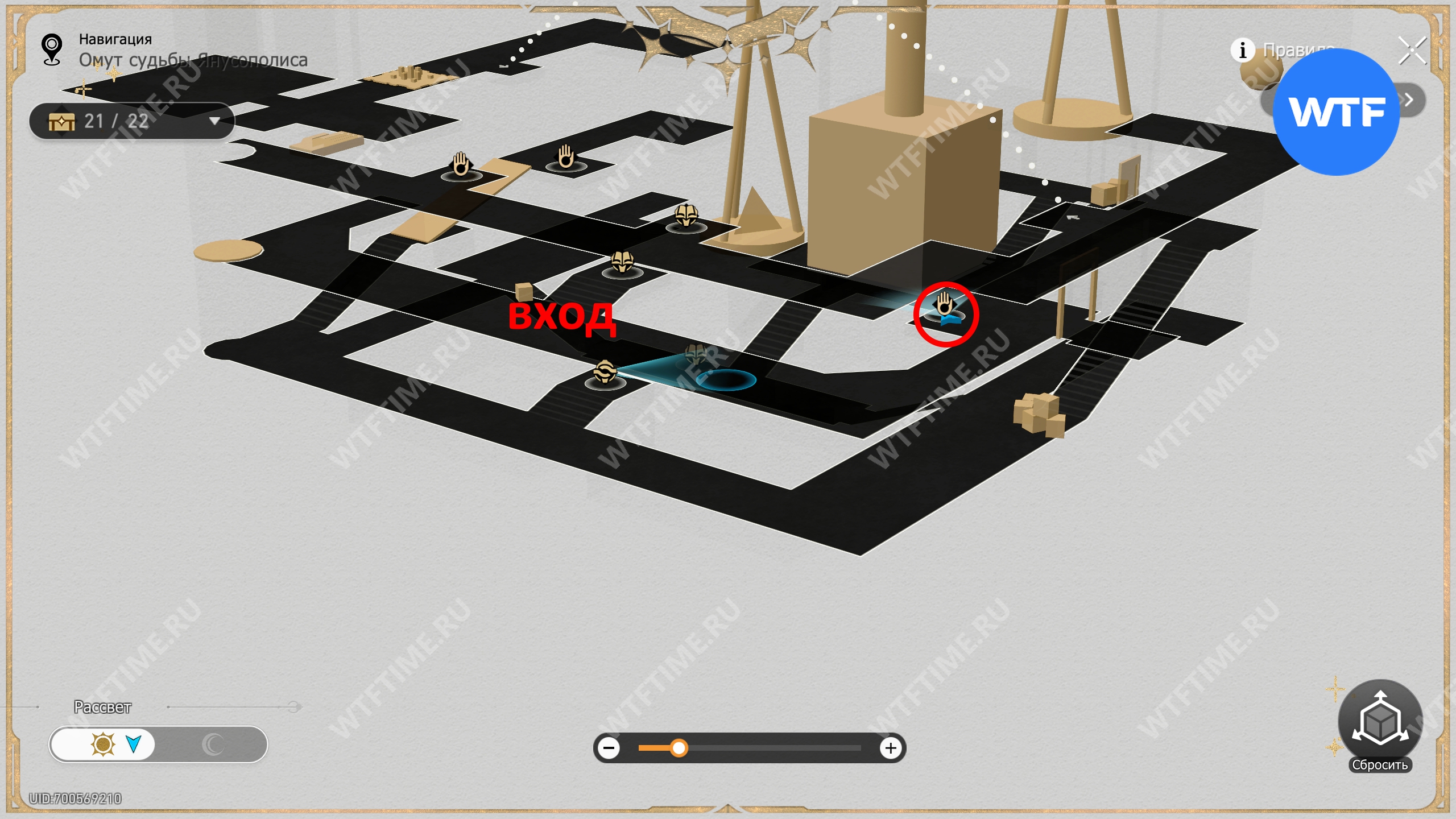 От пространственного якоря «Врата вечного сна» войдите в область с 3D-навигацией. На третьем этаже этого зала есть три плиты пророчества. Чтобы туда попасть, используйте Книгу чудес и переключитесь в режим «Рассвет».