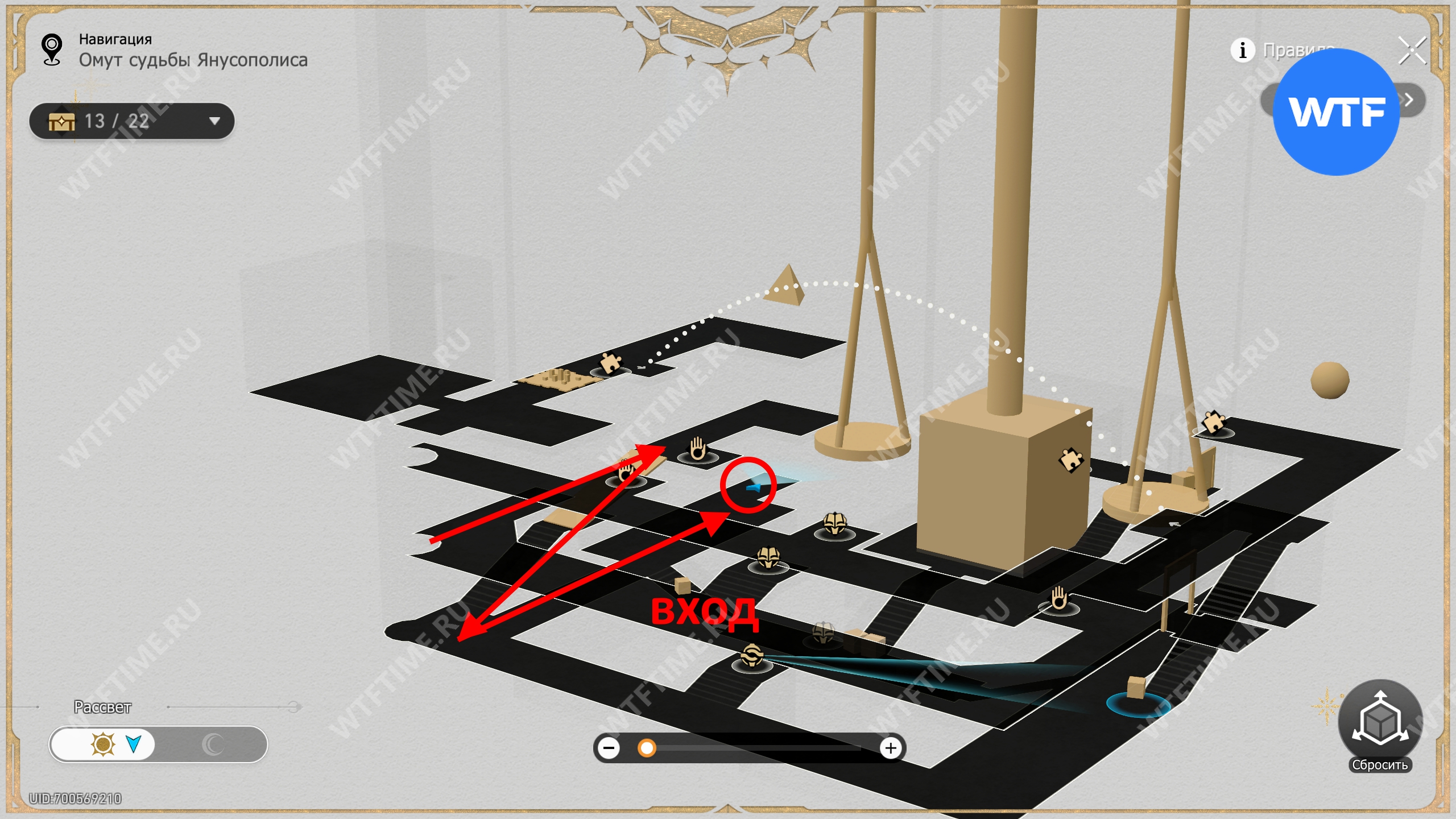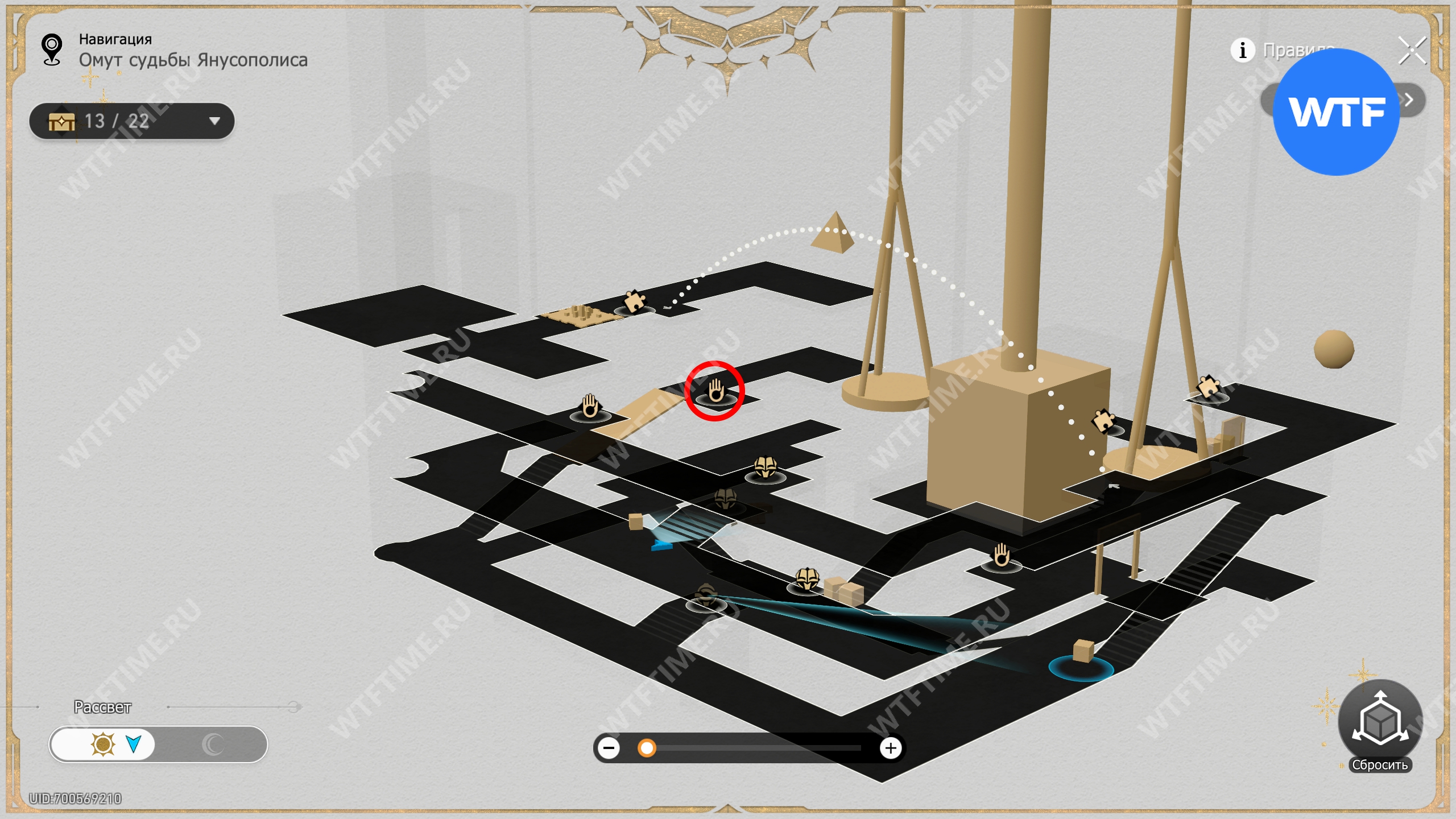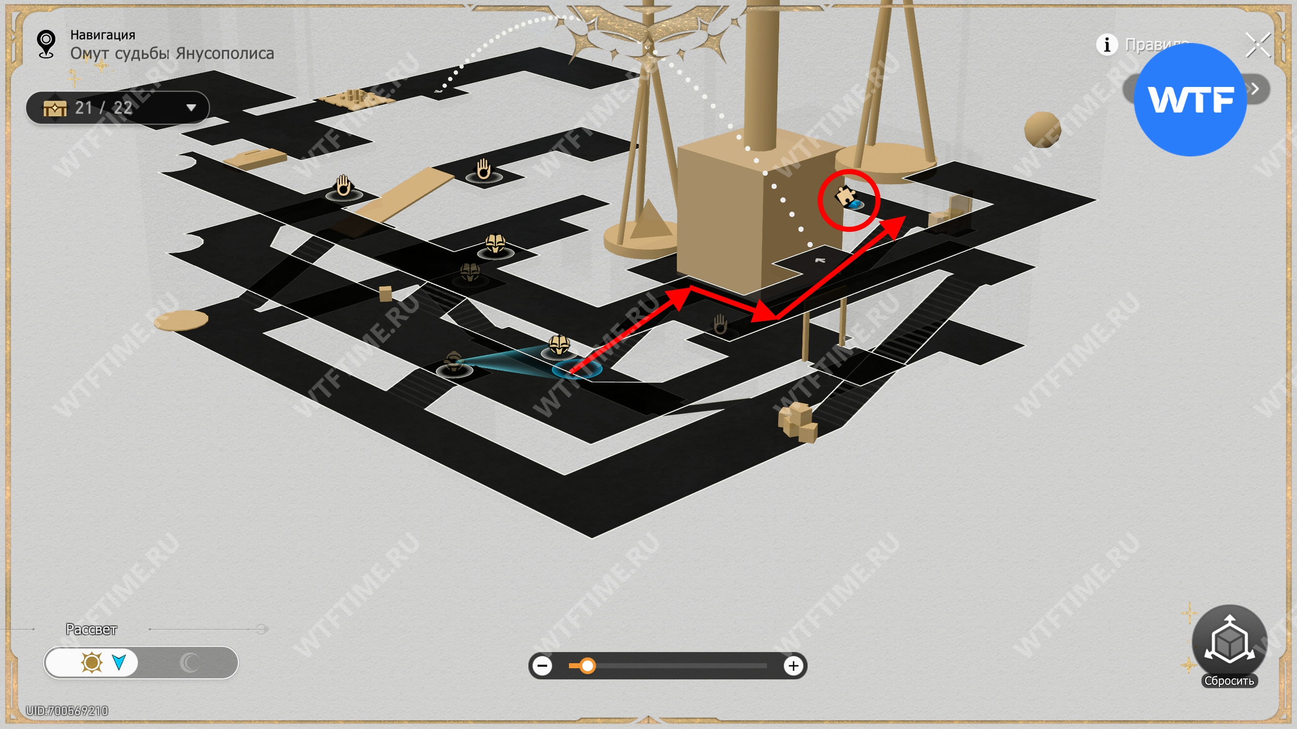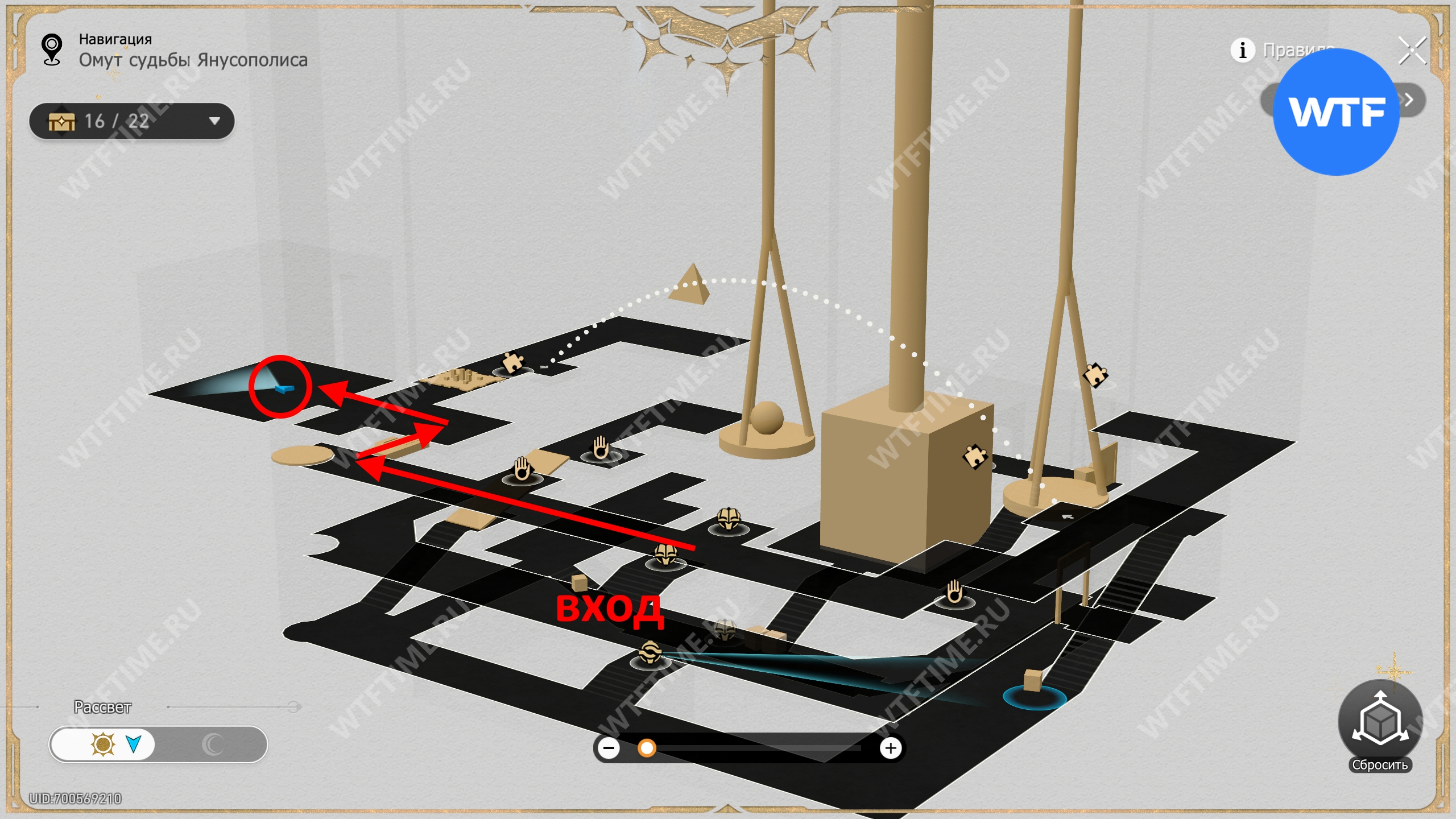 От точки быстрого перемещения «Врата вечного сна» войдите в область с 3D-навигацией. Используйте Книгу чудес и переключитесь в режим «Рассвет». Затем воспользуйтесь Рукой Загрея, чтобы поставить большой шар на правую чашу весов.