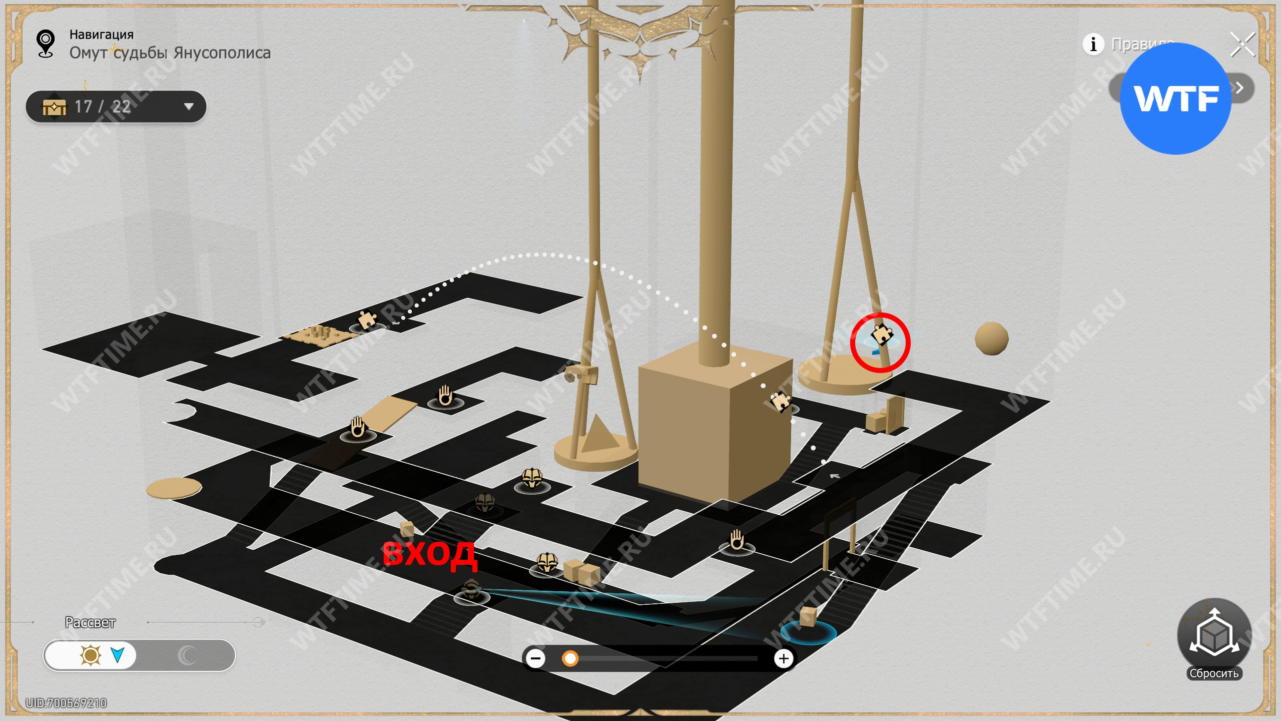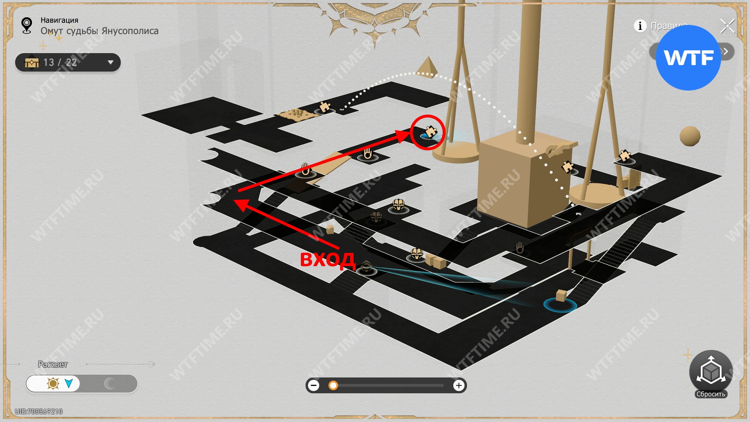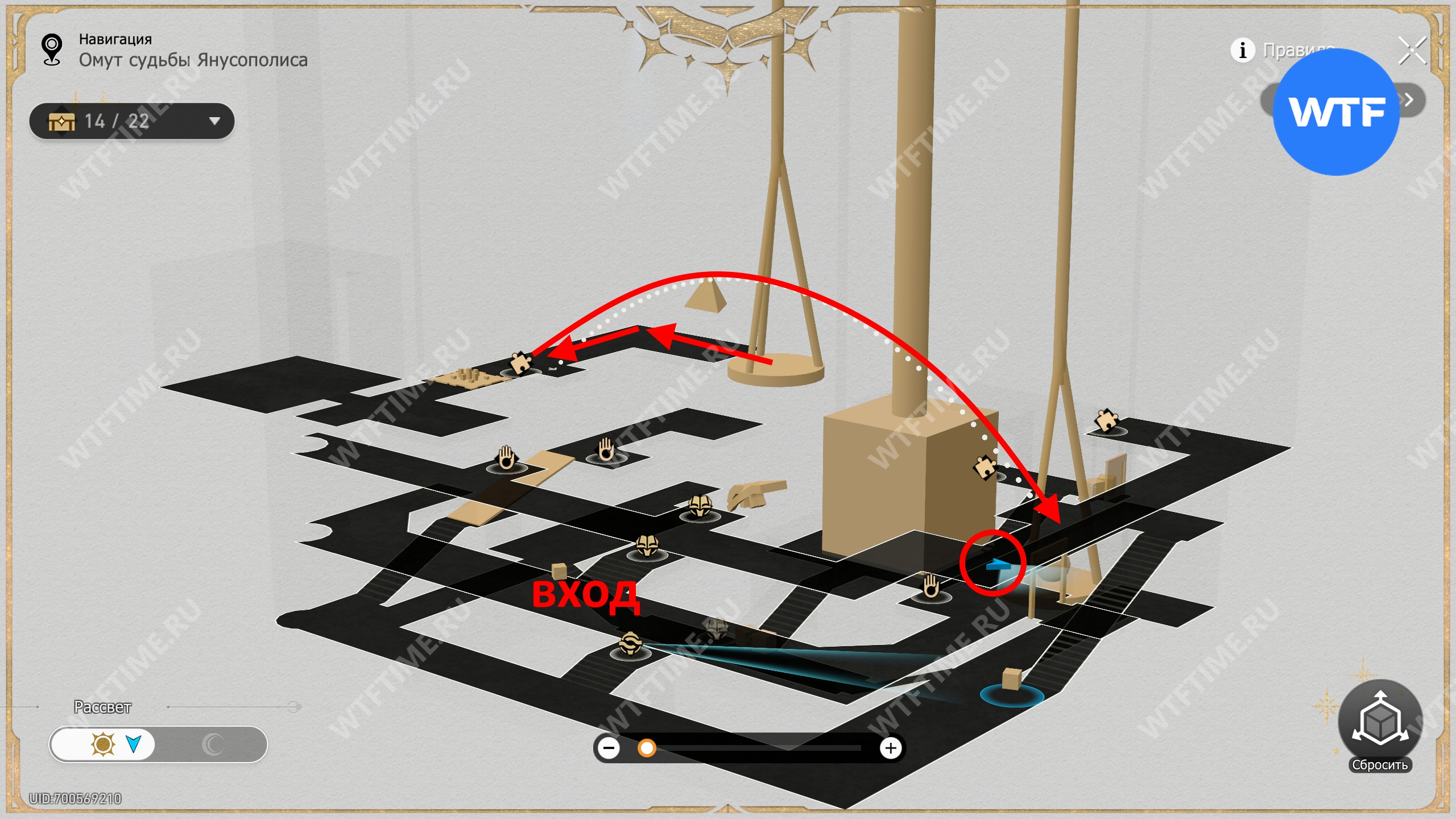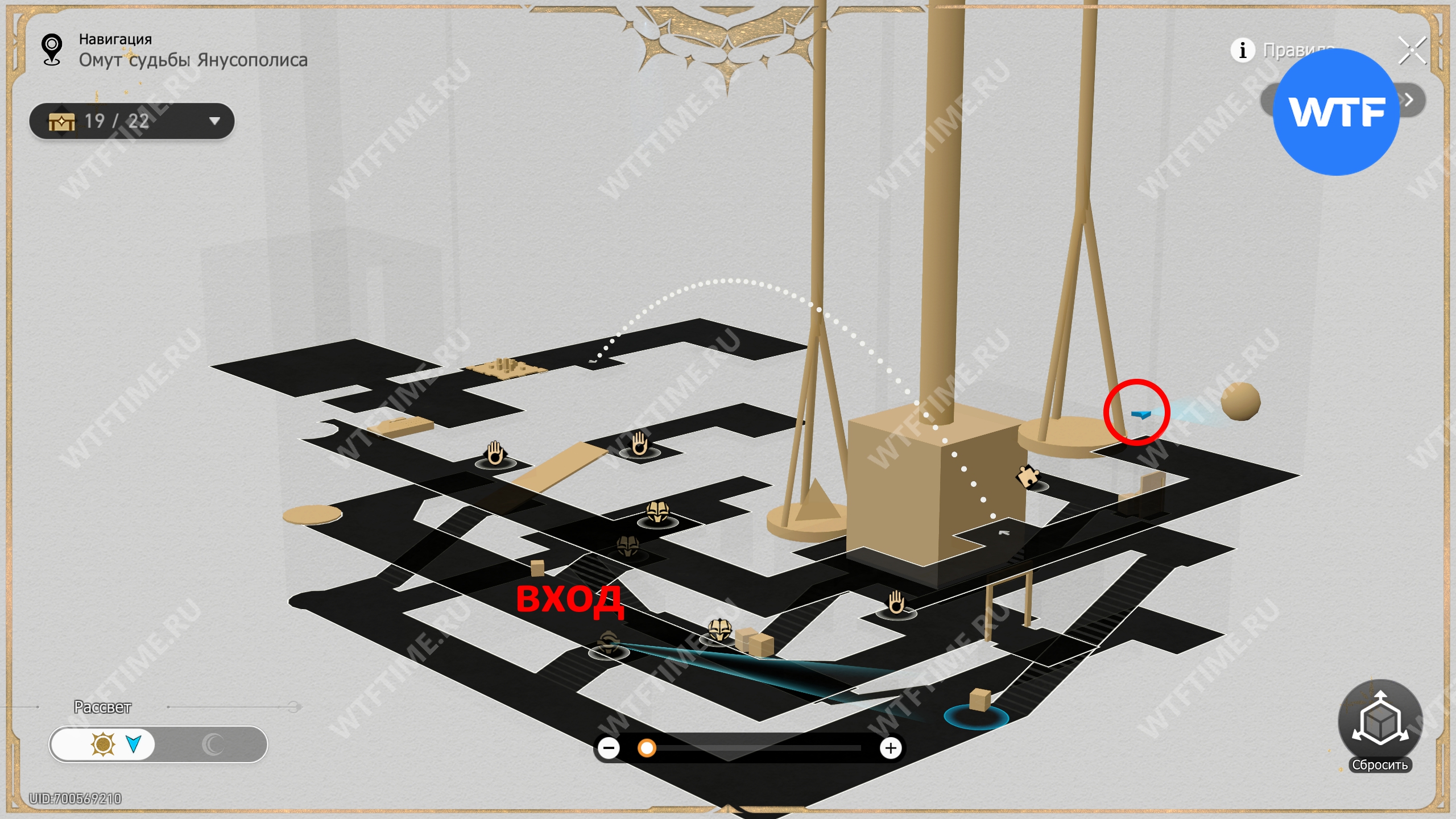 От точки быстрого перемещения «Врата вечного сна» войдите в область с 3D-навигацией. Используйте Книгу чудес и переключитесь в режим «Рассвет». Затем воспользуйтесь Рукой Загрея, чтобы поставить большой шар на правую чашу весов.