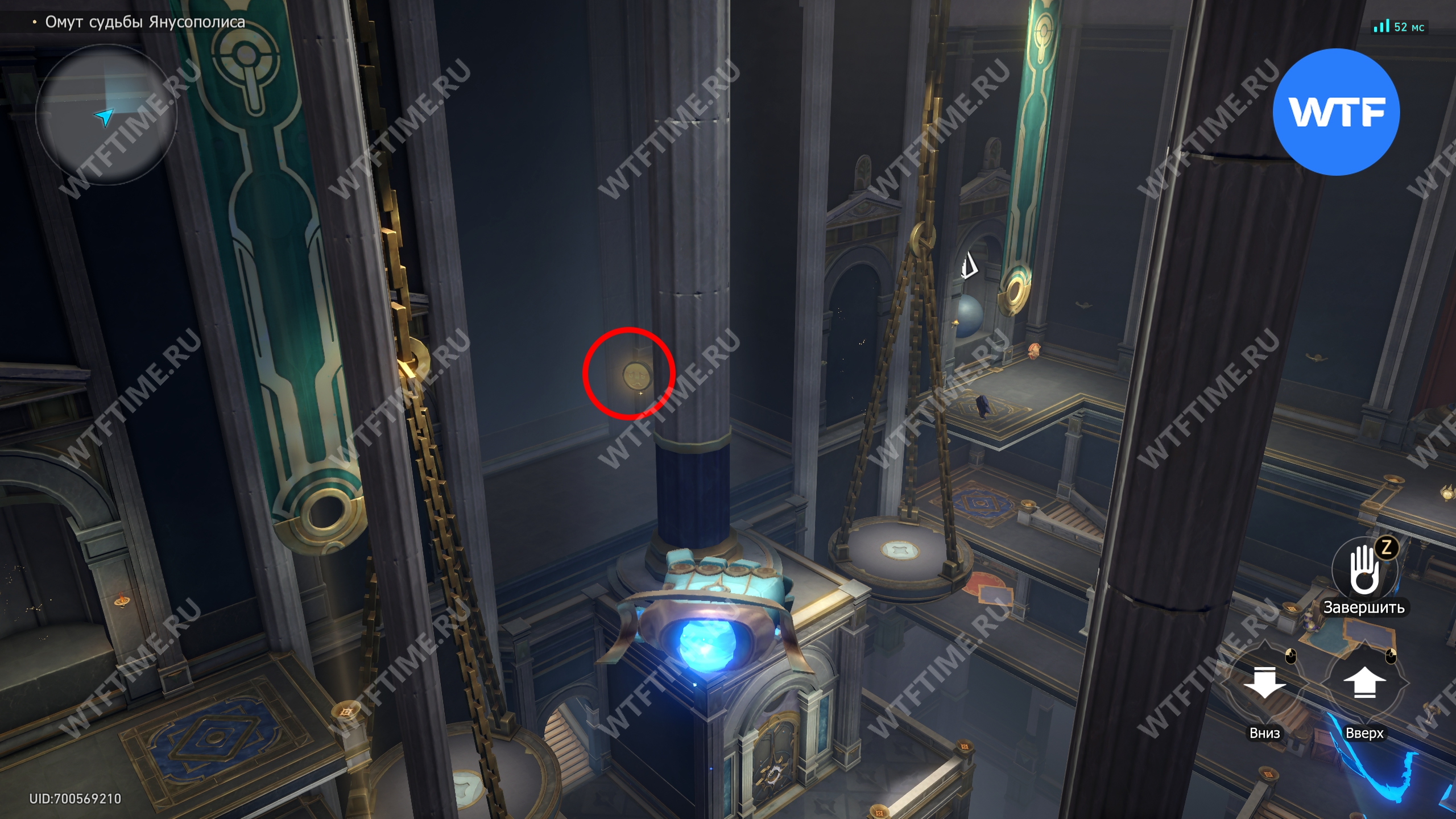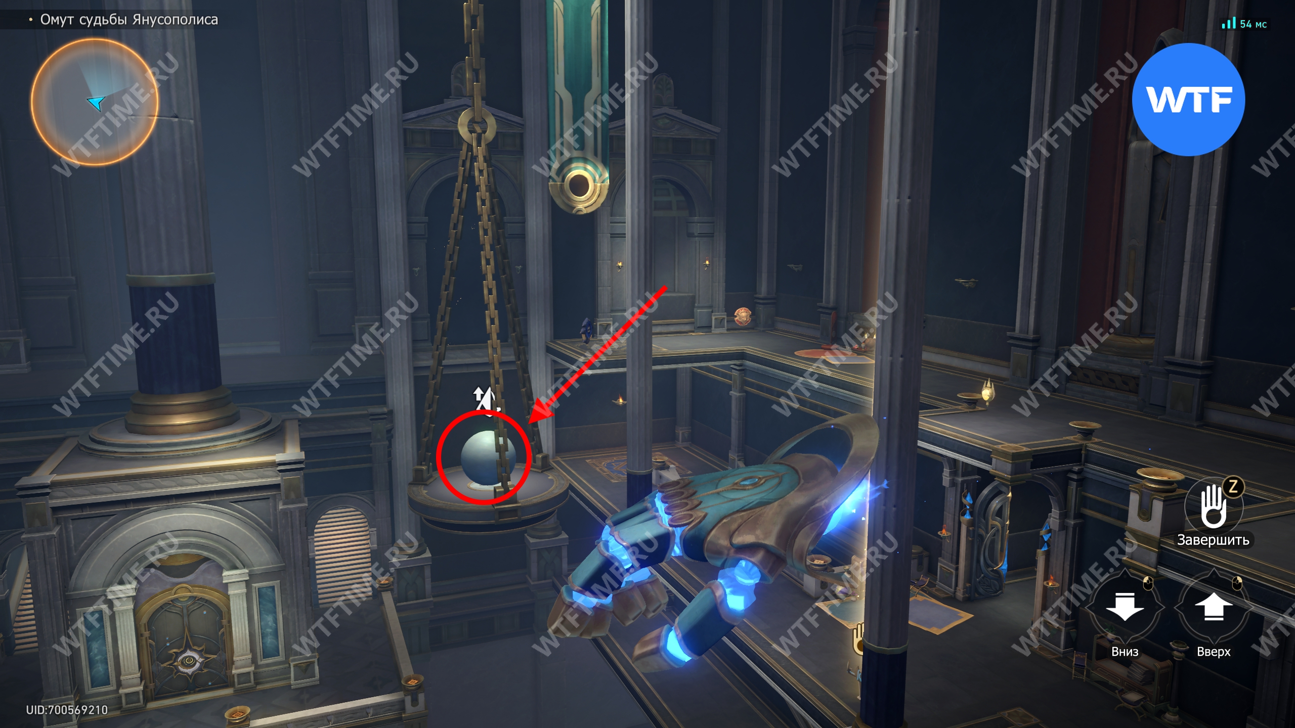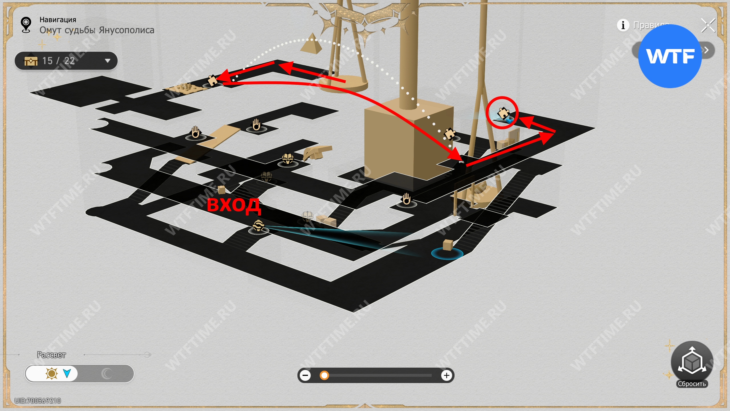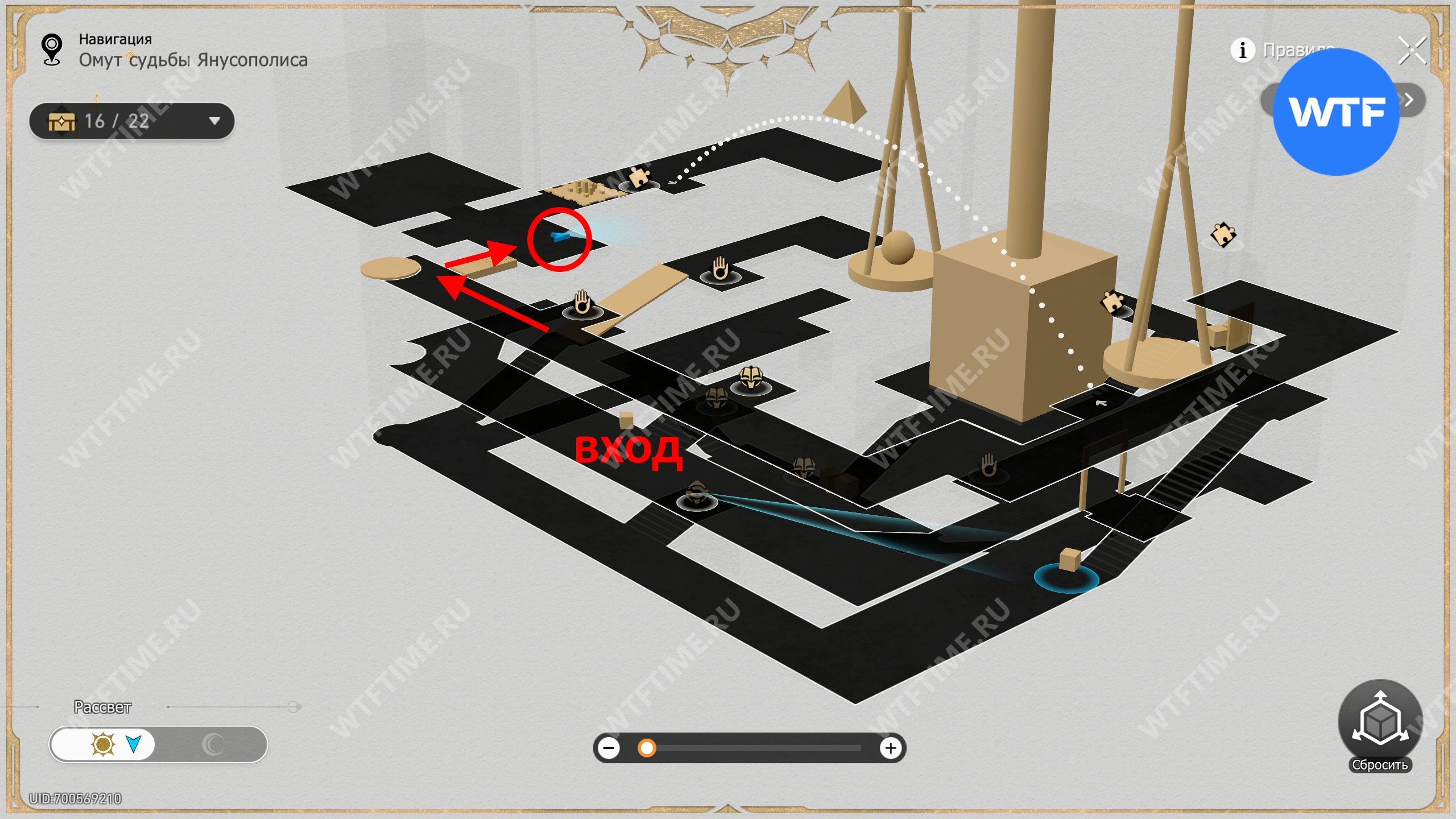 От точки быстрого перемещения «Врата вечного сна» войдите в область с 3D-навигацией. Используйте Книгу чудес и переключитесь в режим «Рассвет». Затем воспользуйтесь Рукой Загрея, чтобы поставить большой шар на правую чашу весов.