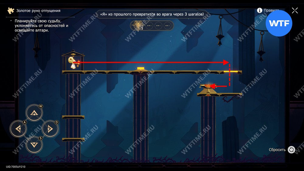 Первым делом идите влево до упора, чтобы оказаться на желтой кнопке. Затем поднимитесь по лестнице и идите направо до конца. К моменту вашего падения тень закончит повторять шаги и вы спокойно доберетесь до алтаря: