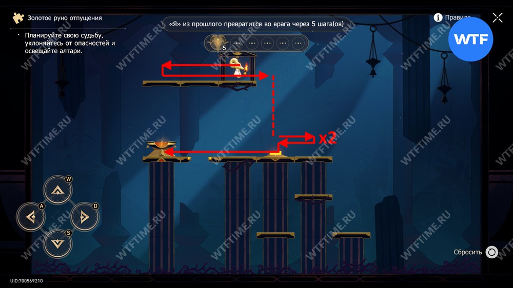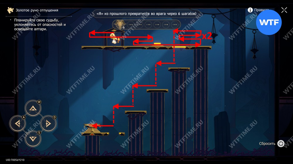 Для начала идите к левому краю платформы, затем к кнопке. После этого сделайте один шаг влево и один обратно вправо. Это Позволит вашей темной версии занять место на кнопке в конце 6 хода.
