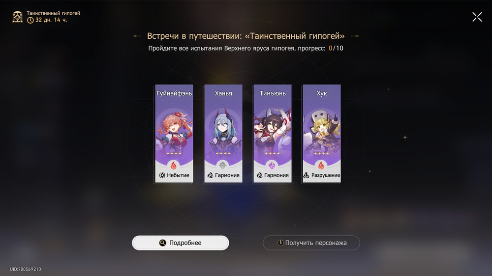 Одной из главных наград события «Таинственный гипогей» в ХСР является персонаж с 4 звездами редкости. Пройдя все испытания Верхнего яруса гипогея, вы сможете бесплатно забрать Гуйнайфэнь (огонь, Небытие), Ханью (физ., Гармония), Тинъюнь (электро, Гармония) или Хук (огонь, Разрушение).