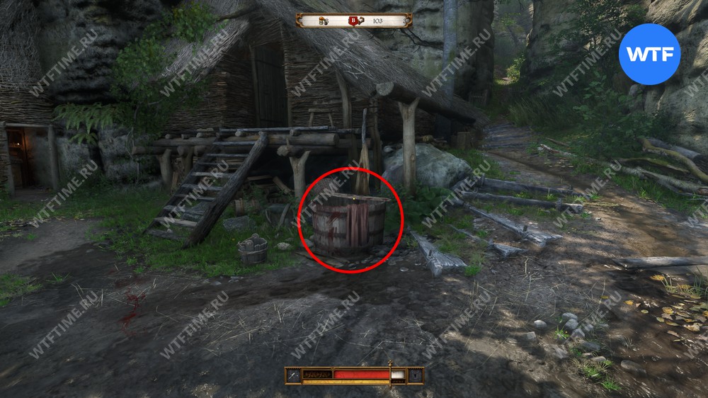 Наденьте на себя добытые у бандита вещи и ополоснитесь в бадье с водой, стоящей возле дома. Это позволит смыть кровь как с вас, так и с вашей одежды. Грязь с неё при этом до конца убрать не получится.