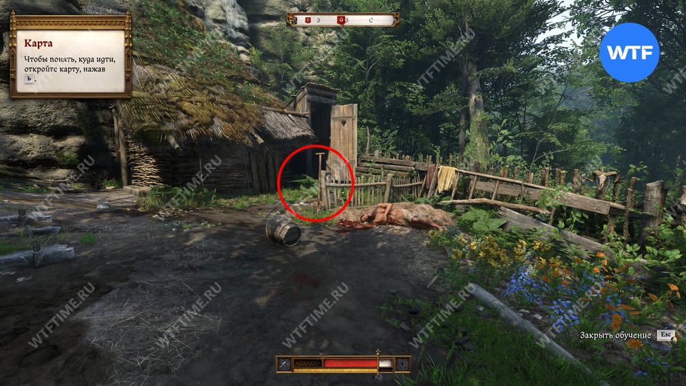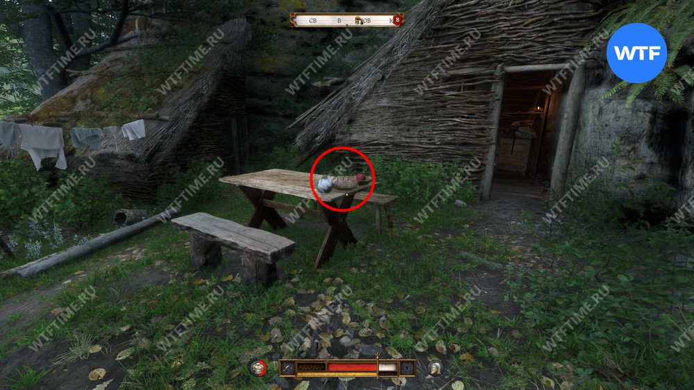 Следующая важная задача — поесть. Во-первых, стоит дважды приложиться к котелку возле кровати. Затем выйдите из дома и заберите припасы, которые Божена оставила для вас на столе.