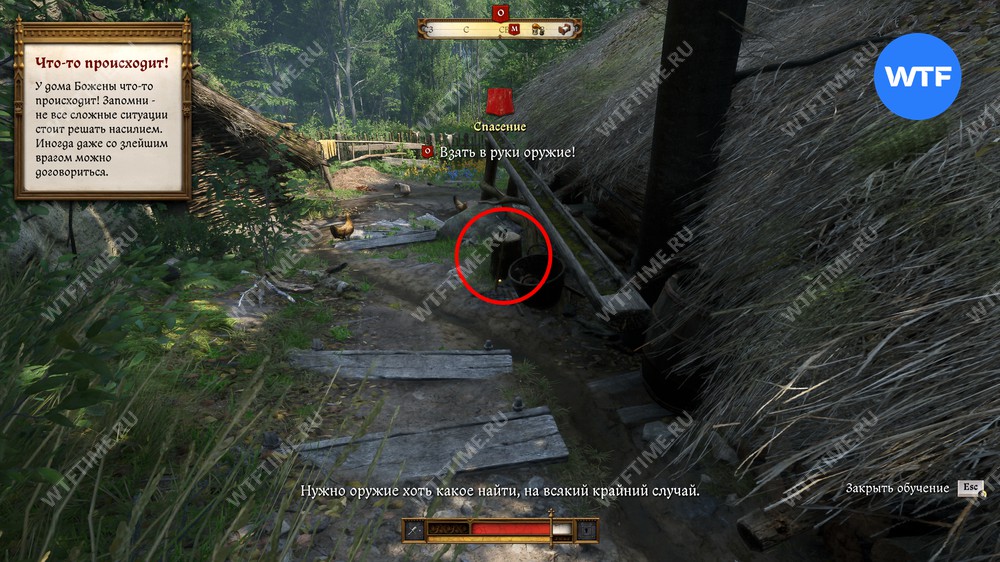 Вернувшись к дому Божены с травами, вы увидите там вооруженных людей. Прежде чем подходить к ним, возьмите в руки оружие. Рабочий топор, торчащий из бревна у дома, отлично подойдет.