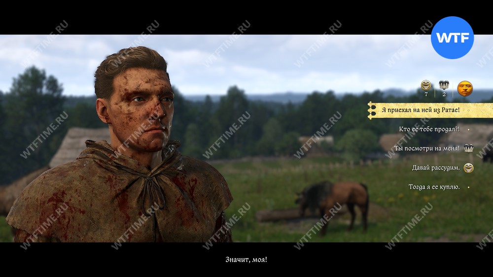 Поговорите с ним и он расскажет, что купил эту лошадь у какого-то подозрительного типа. 7 уровня красноречия хватит, чтобы выбрать вариант диалога «Давай рассудим» и забрать у него лошадь бесплатно. После этого вы также получите достижение «Старый друг».