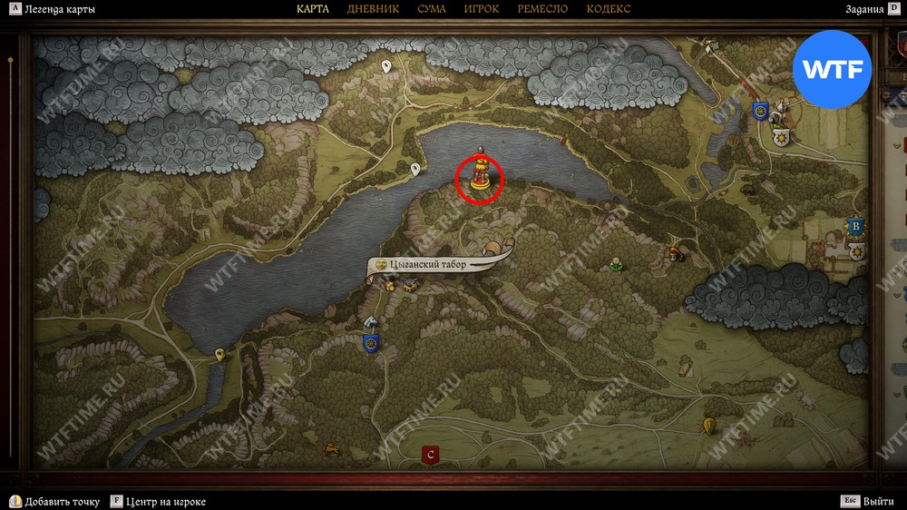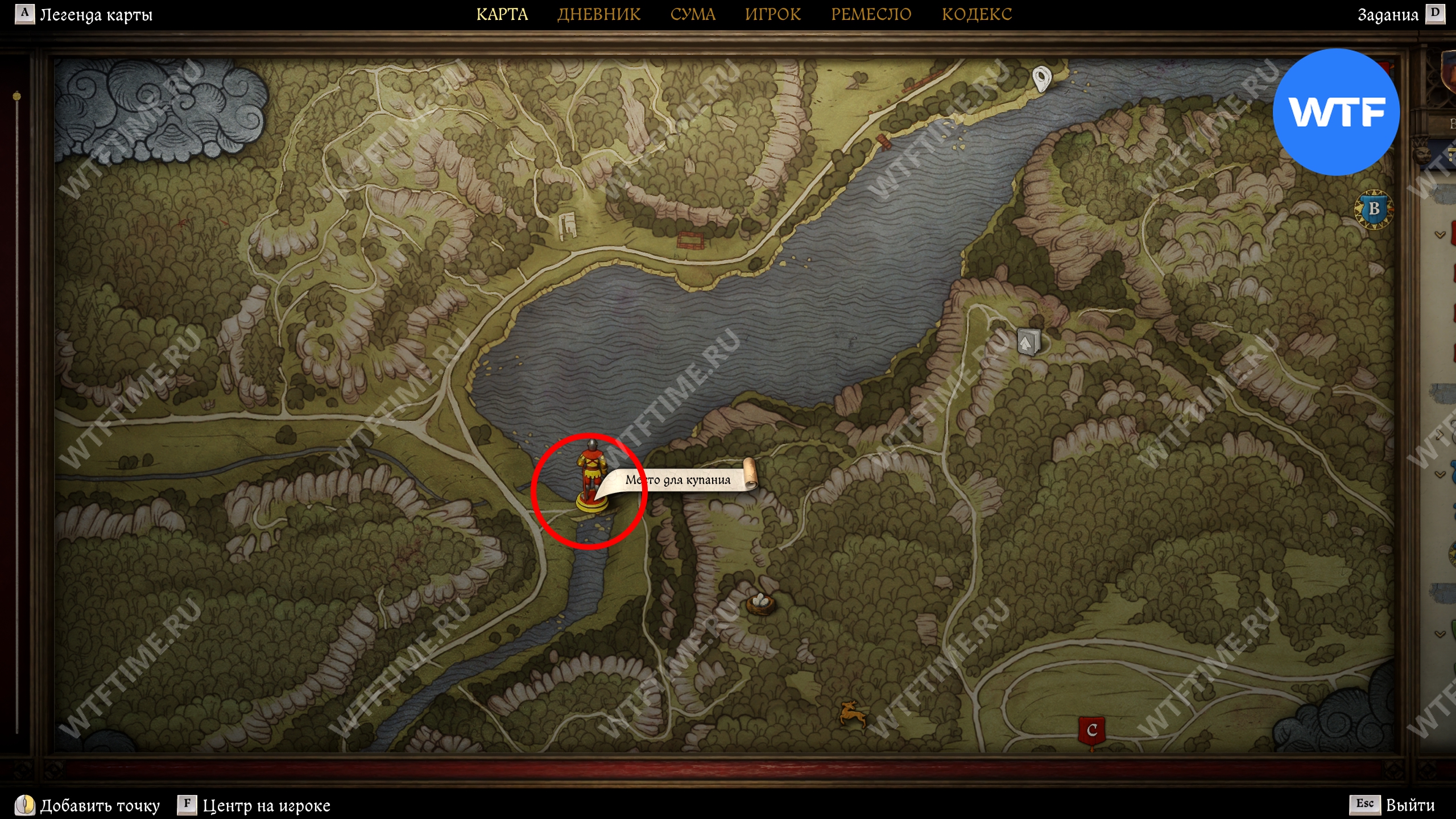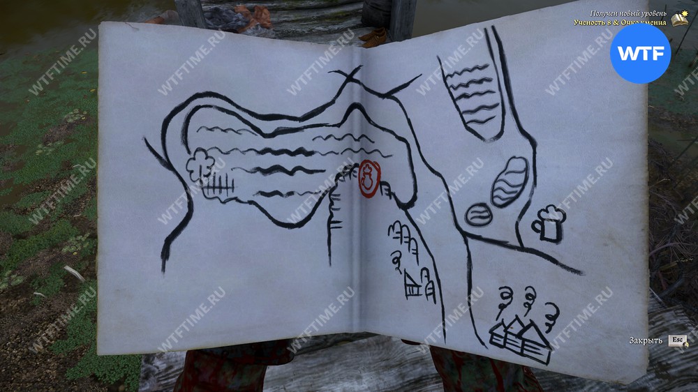 Полученную карту можно найти в инвентаре, в разделе с книгами. Несмотря на её схематичность, здесь вполне угадывается корчма, большой пруд и знакомый нам причал слева. Сокровище водяного отмечено красным кругом.