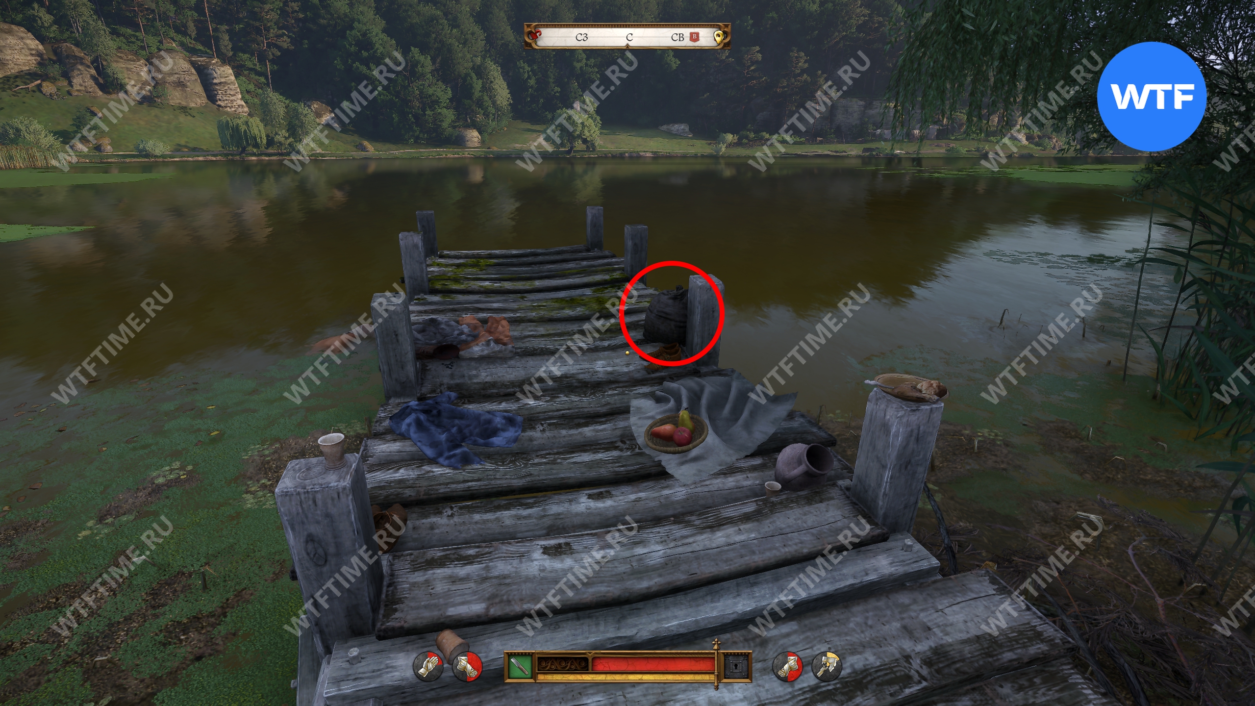 Прибыв на место, осмотрите деревянный причал, по которому разбросана куча еды и одежды. Обыщите тела утопленников в воде и самое главное — загляните в мешок на причале, чтобы найти внутри деньги и Карту утопленника.