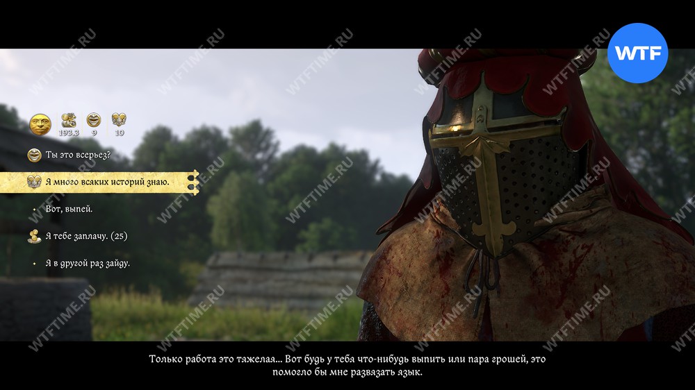 Попросите его рассказать вам историю и либо пройдите одну из проверок, либо отдайте выпивку, либо заплатите. Мы попросили поведать нам что-то познавательное, но скорее всего этот выбор не имеет никакого значения.