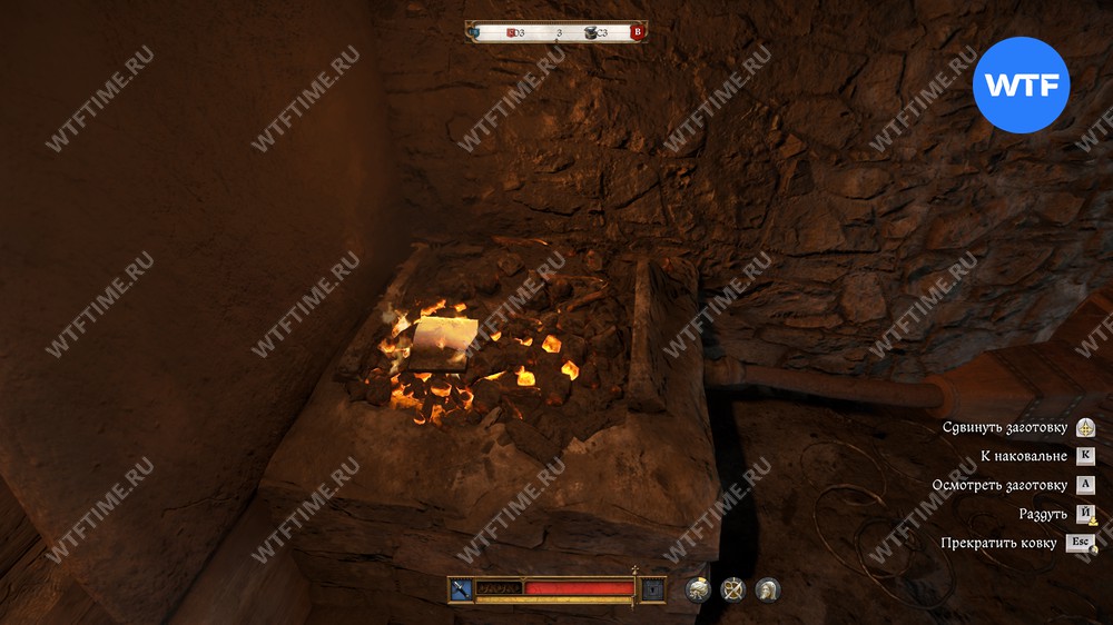 Подойдите к наковальне и начните ковку. Ваша первая задача — раздуть огонь в горне и нагреть заготовку до равномерного желтого цвета. Вы можете периодически вынимать её из огня, чтобы оценить степень нагрева.