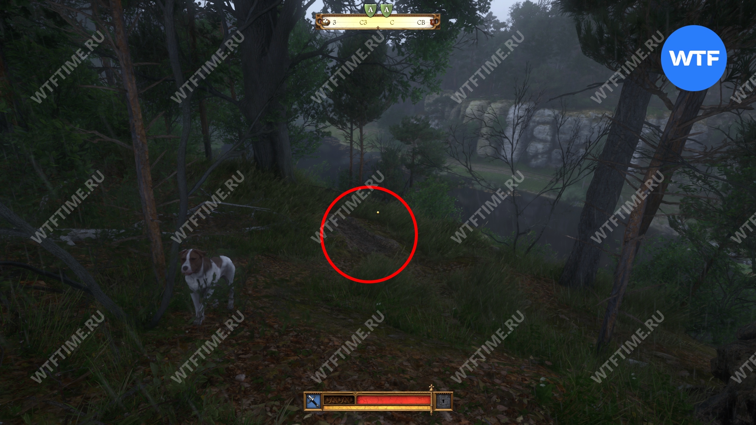 Продолжайте идти по тропинке, пока не обнаружите гнездо. Когда в просвете среди деревьев покажется пруд, сверните с тропинки налево и осмотрите небольшую могилу (см. скриншот 2). Раскопайте её, чтобы добыть следующее содержимое:
