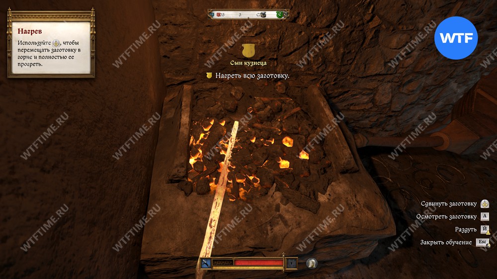 - Поводить мечом в печи — передвигайте заготовку внутри огня, следуя указаниям кузнеца;