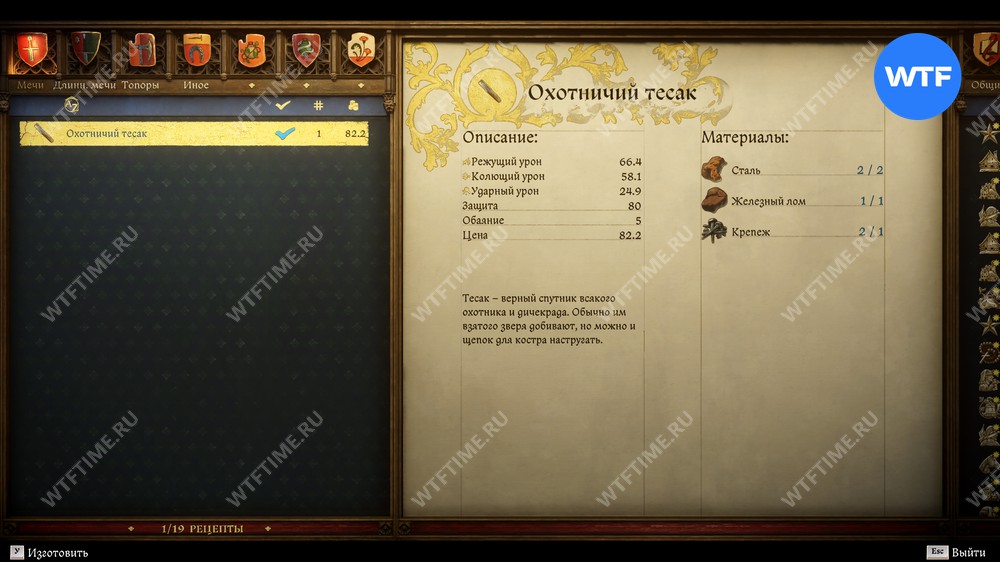 Прежде чем допустить до более серьезной работы, кузнец захочет вас испытать. Он попросит изготовить охотничий тесак, чтобы проверить как много вы смыслите в кузнечном деле.