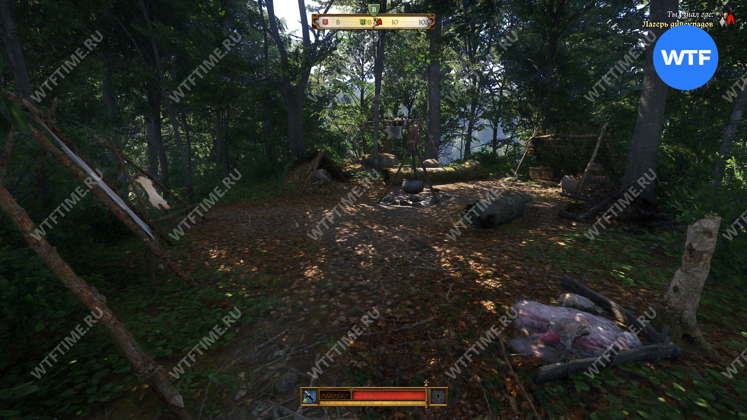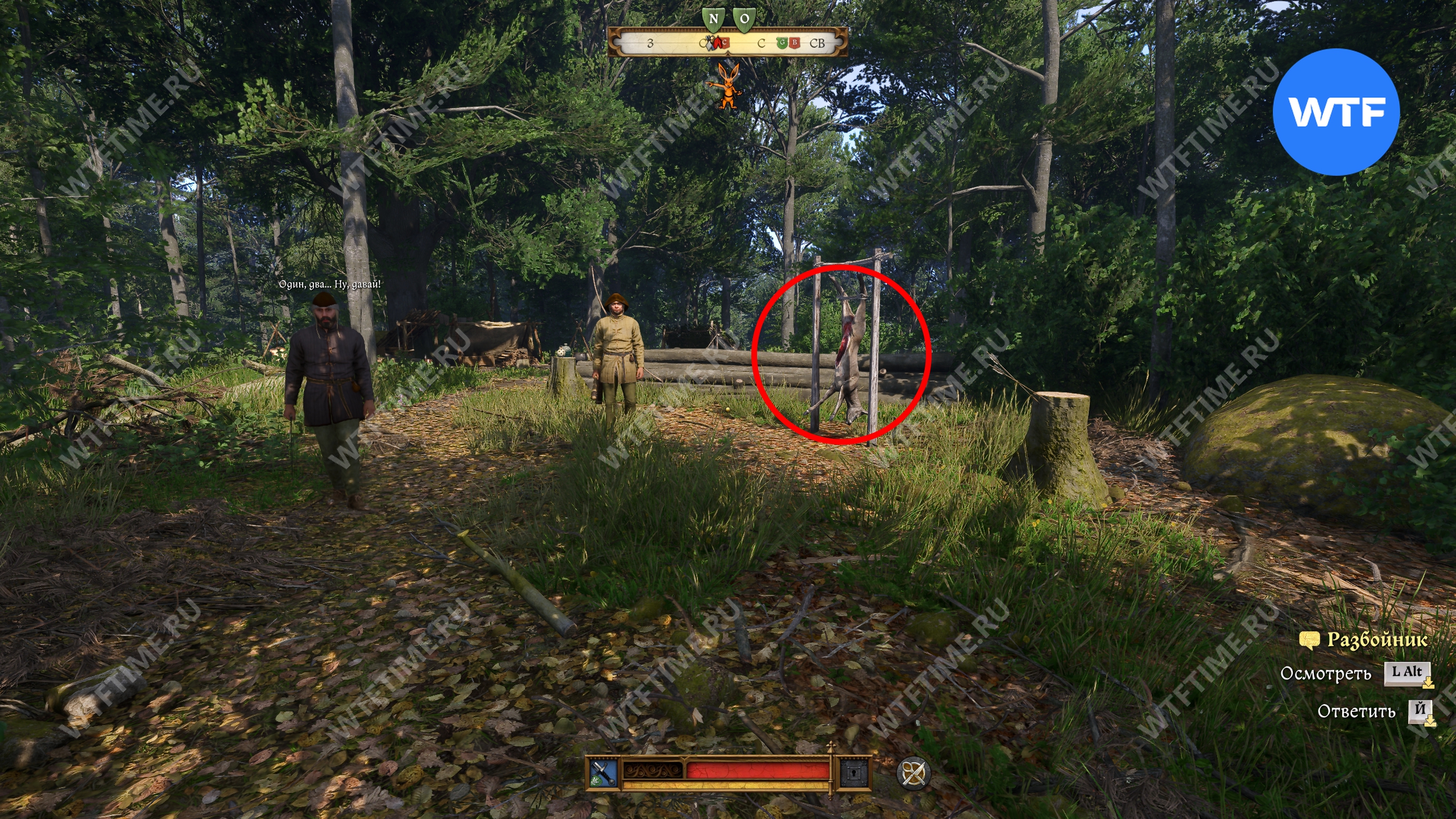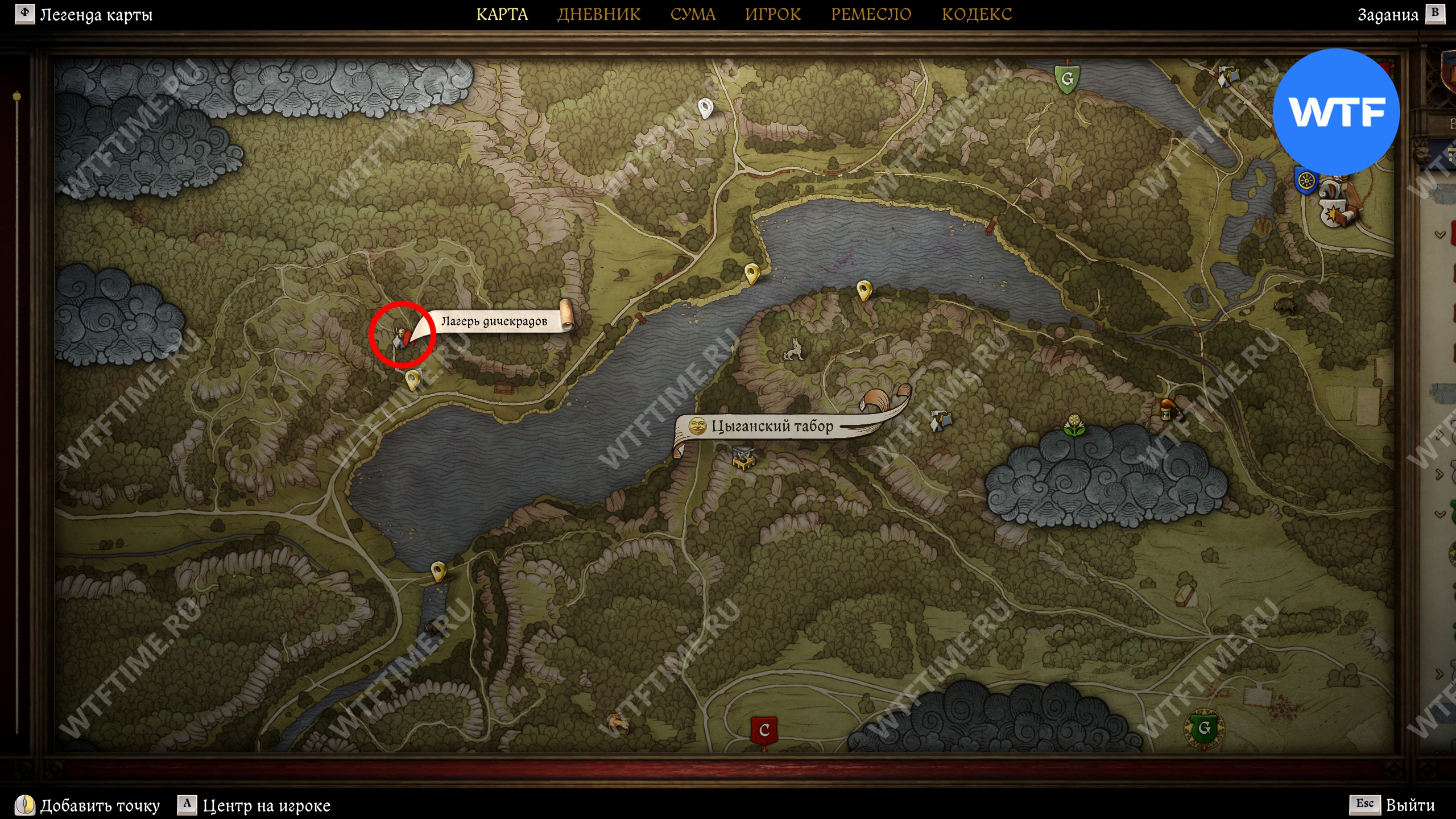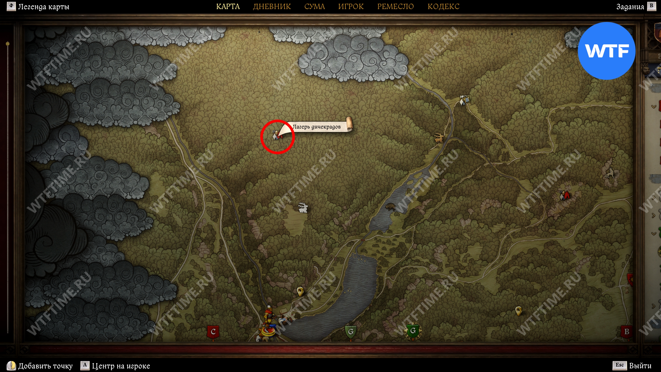 В любом случае, эти двое не очень помогут нам в поисках дичекрада. Поэтому просто ориентируйтесь на карту ниже, чтобы найти лагерь. Лес там достаточно густой, но к лагерю ведет что-то вроде протоптанной тропинки, чтобы его было легче заметить.