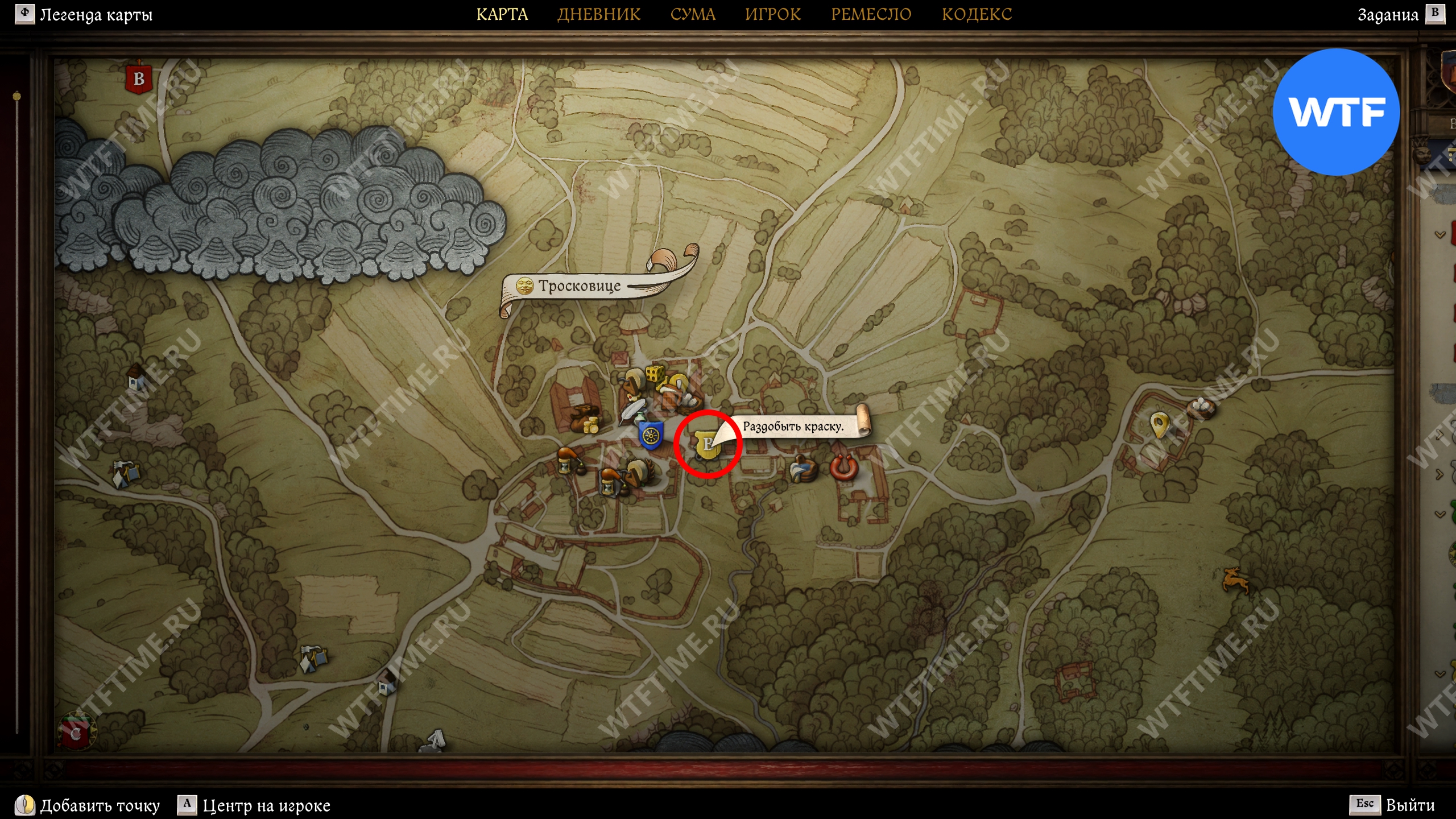 Теперь отправляйтесь в Тросковице и загляните к портному Бартошеку. Вы можете заплатить за краску 60 грошей, либо честно рассказать, зачем она вам нужна, а затем терпеливо выслушать его долгий рассказ об изготовлении различных красок и получить то, что вам нужно, бесплатно.