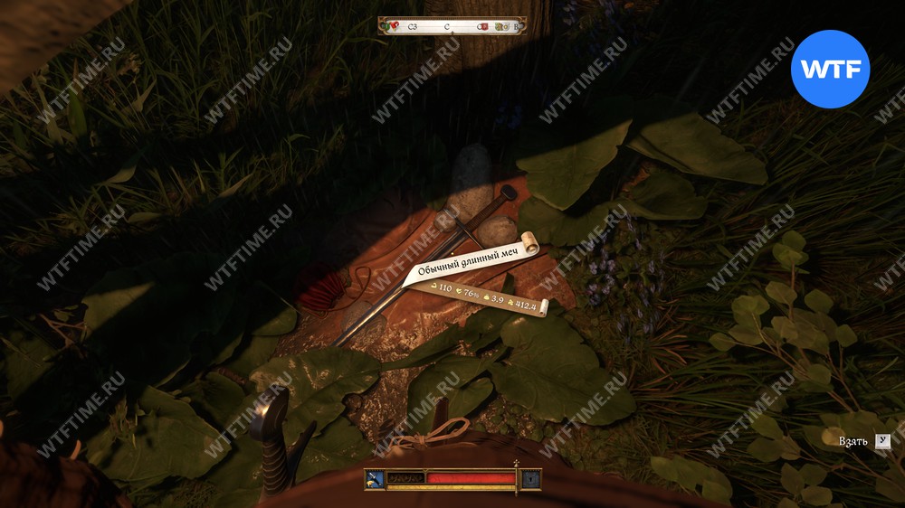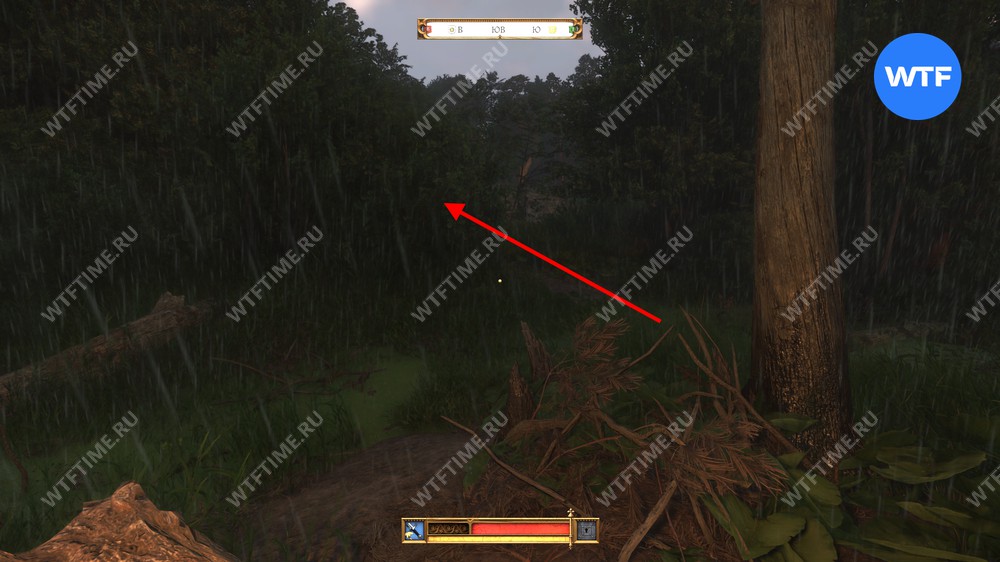По ней вам нужно пройти вперед до упора и залезть прямо в густую листву, чтобы найти красный бархатный кошель с 84 грошами и обычный длинный меч, лежащие на прямо земле.