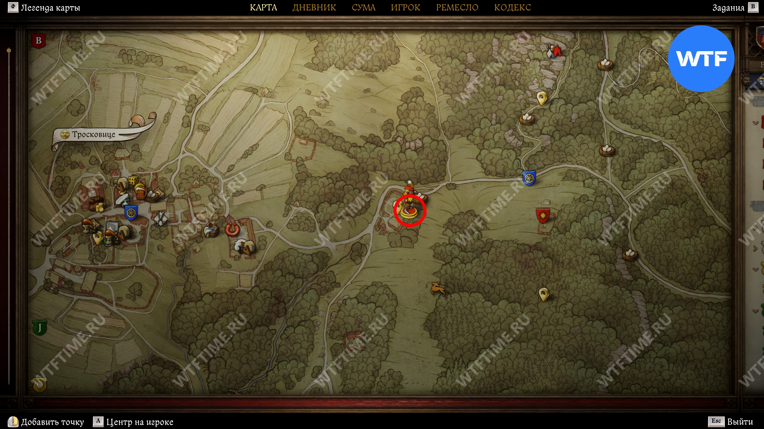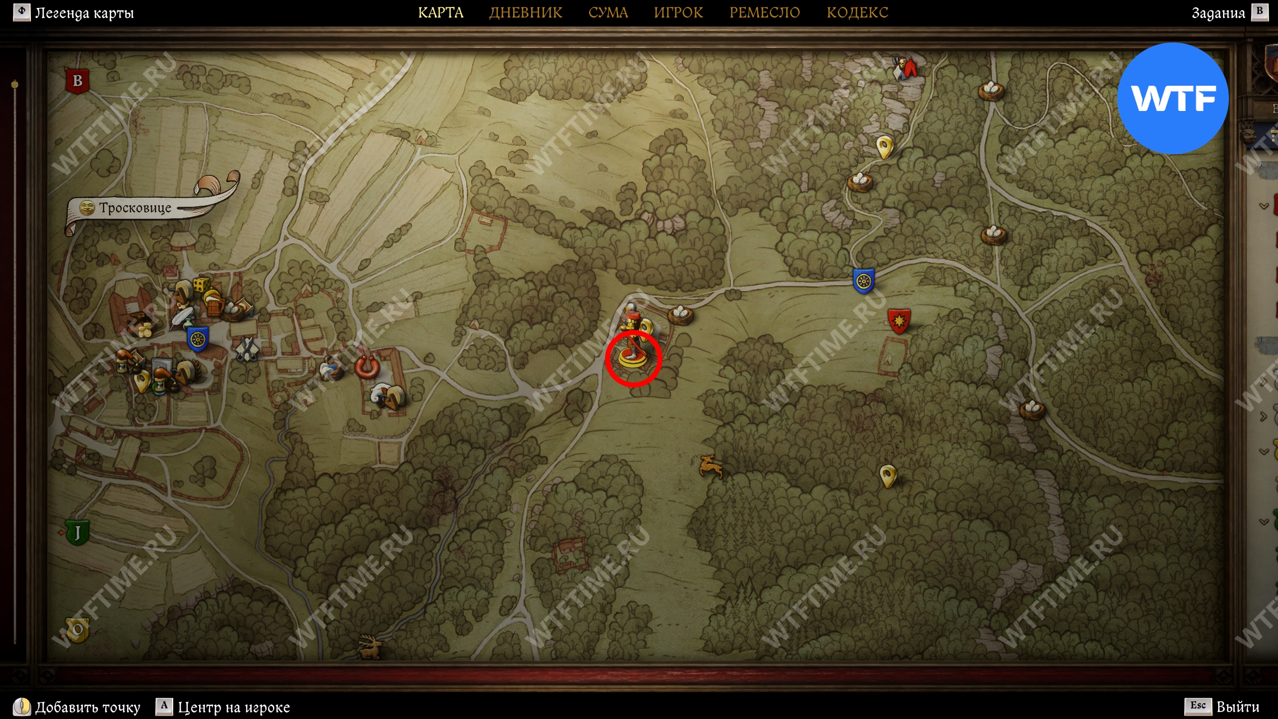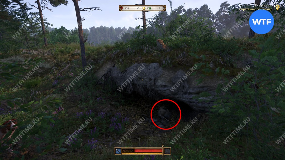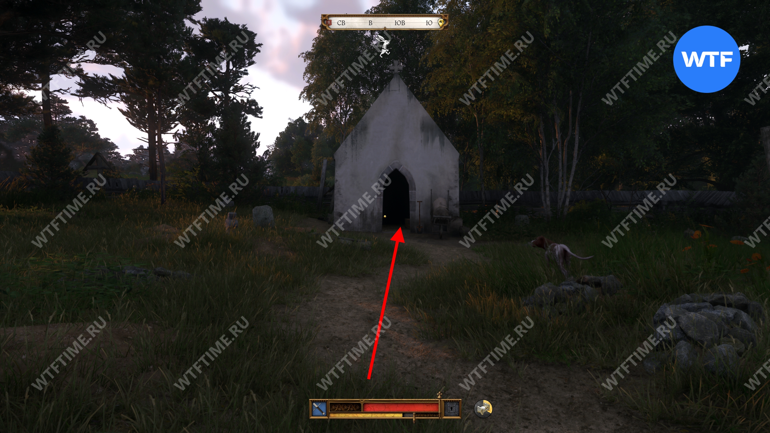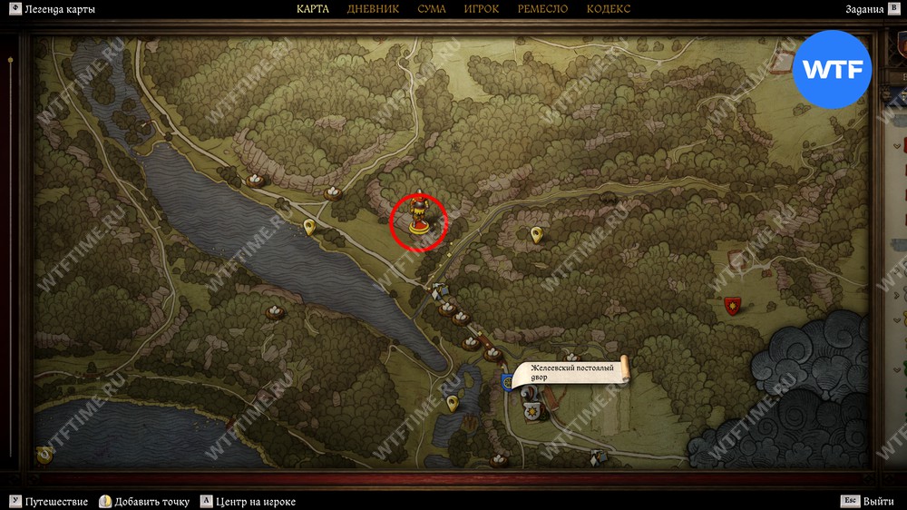 Доберитесь до Желеевского постоялого двора и от него идите на северо-запад. Пересеките ручей, а затем сворачивайте в лес. Точное место мы показали на скриншоте ниже.