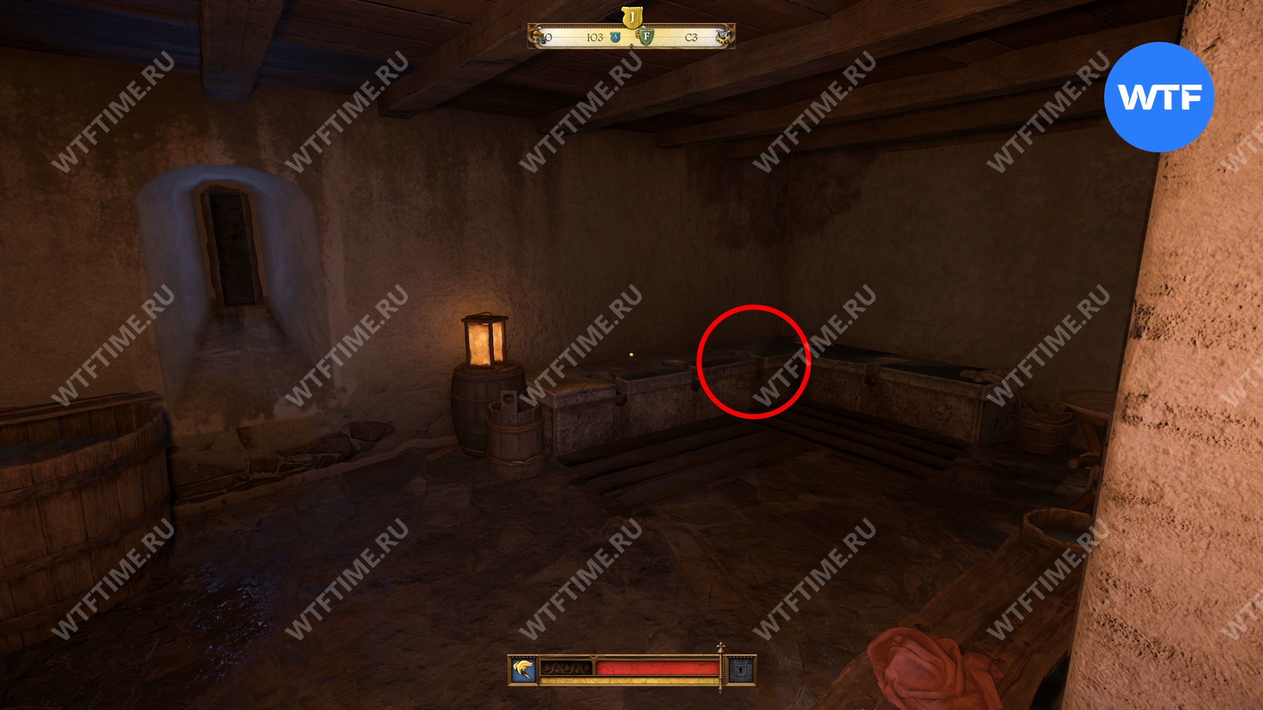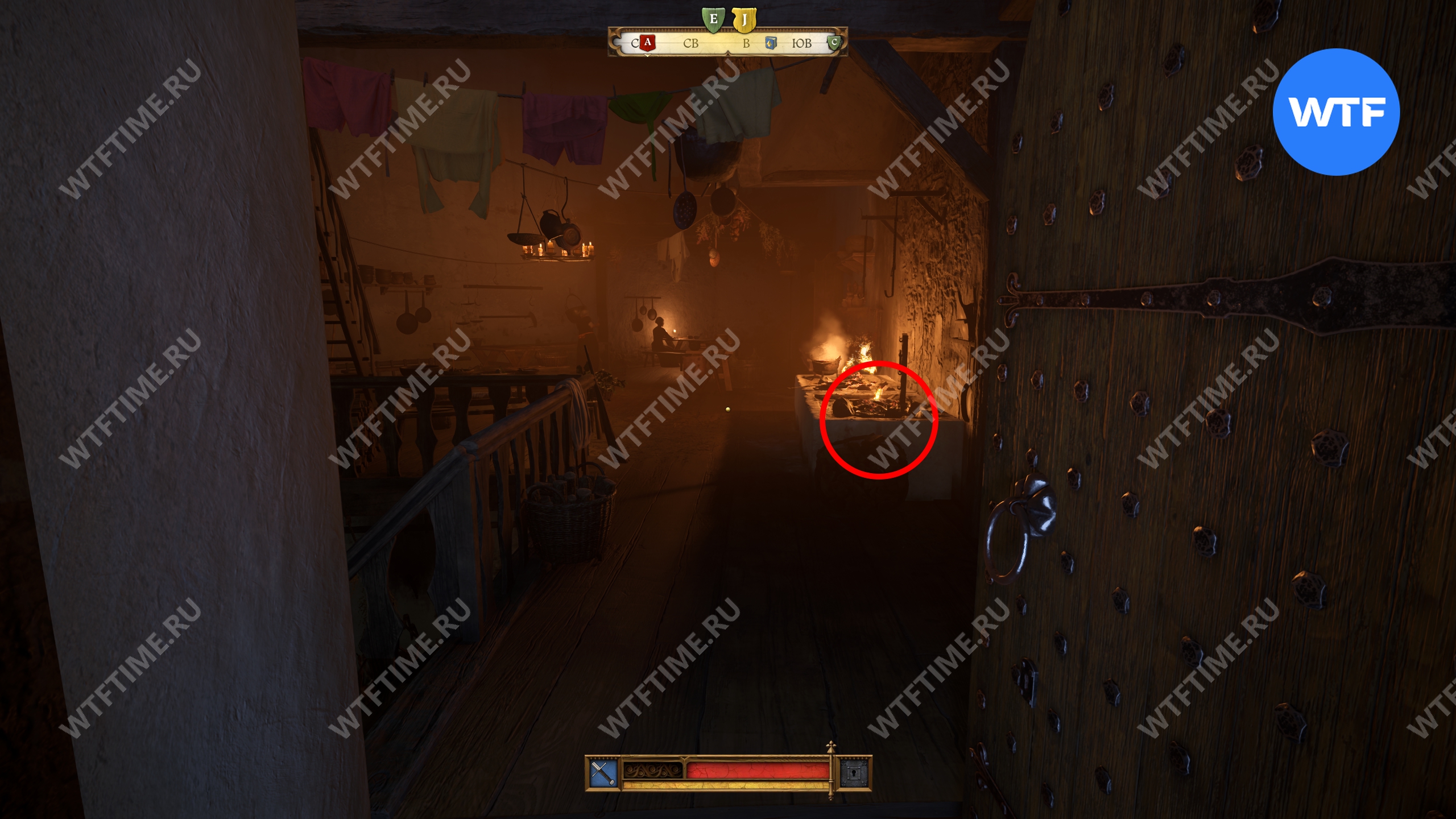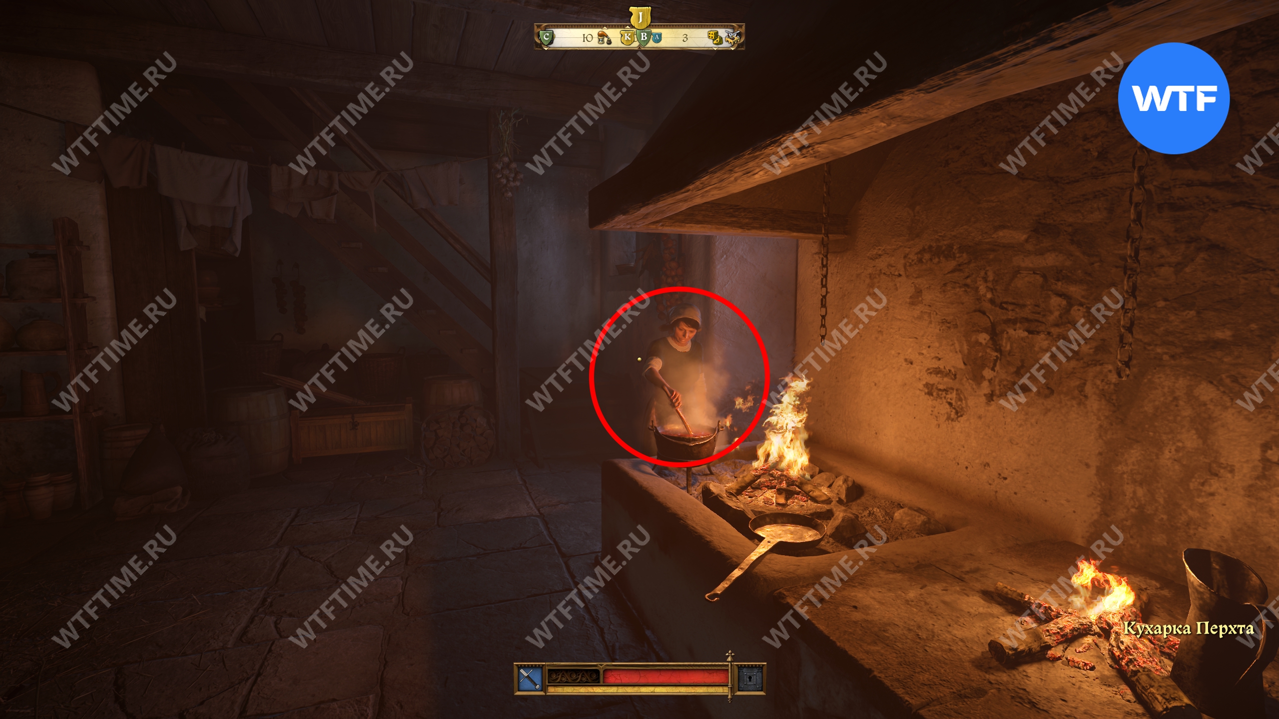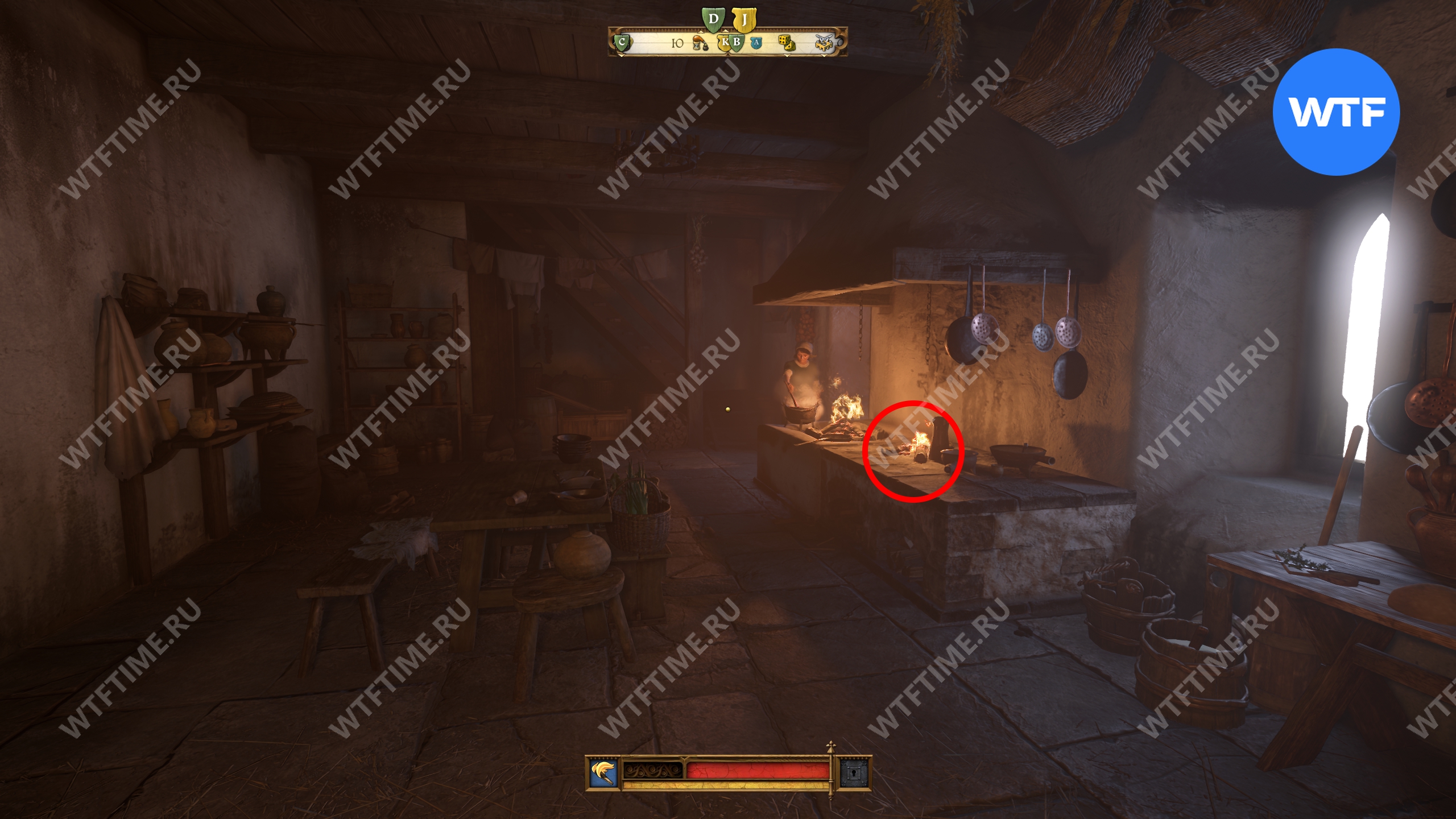 Вернитесь во двор, где находится кузница, и оттуда поднимитесь вверх по лестнице над местной баней. Это приведет вас на кухню, где у правой стены есть два очага для готовки. Воду нужно вылить на тот, что по центру.