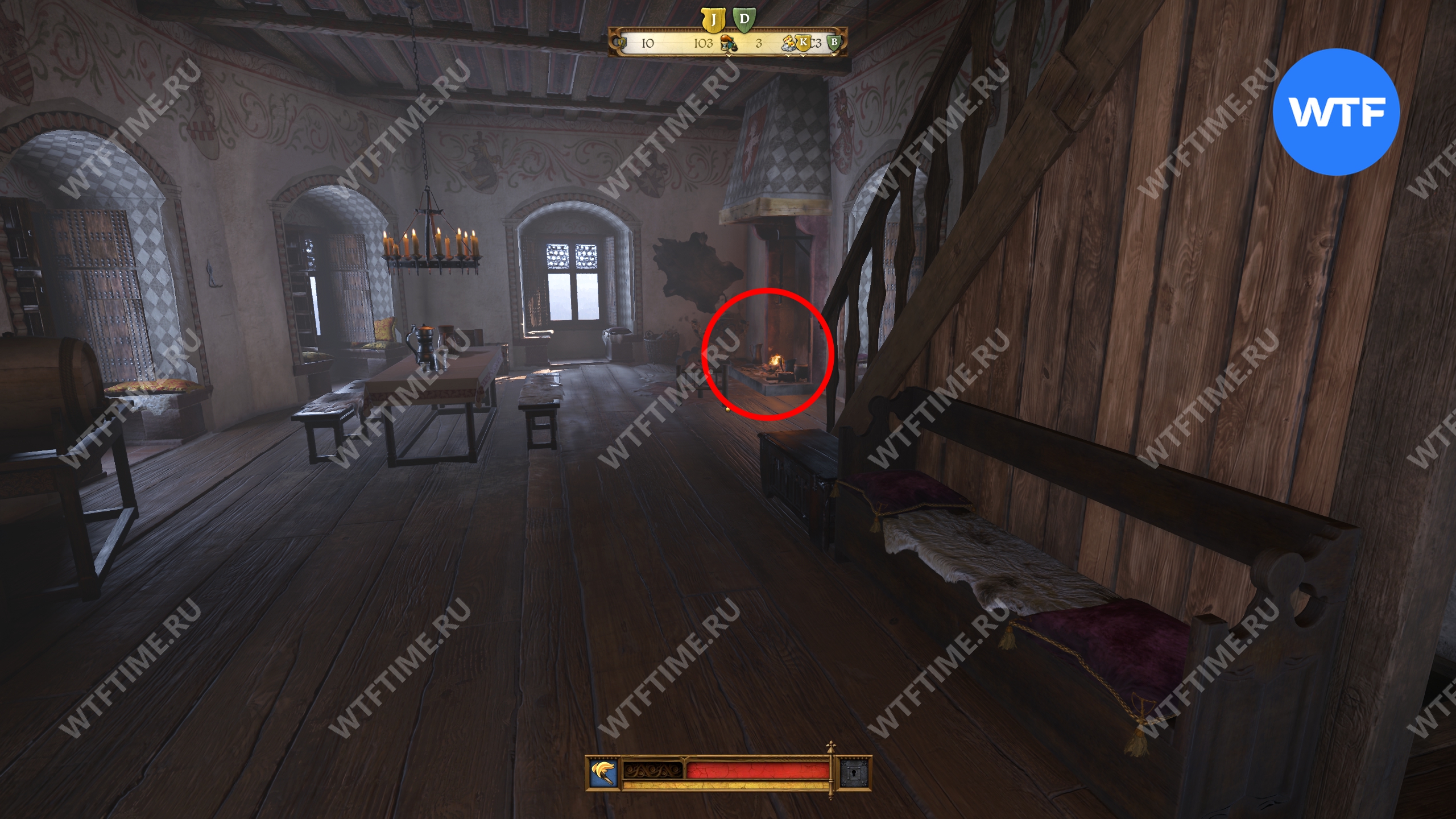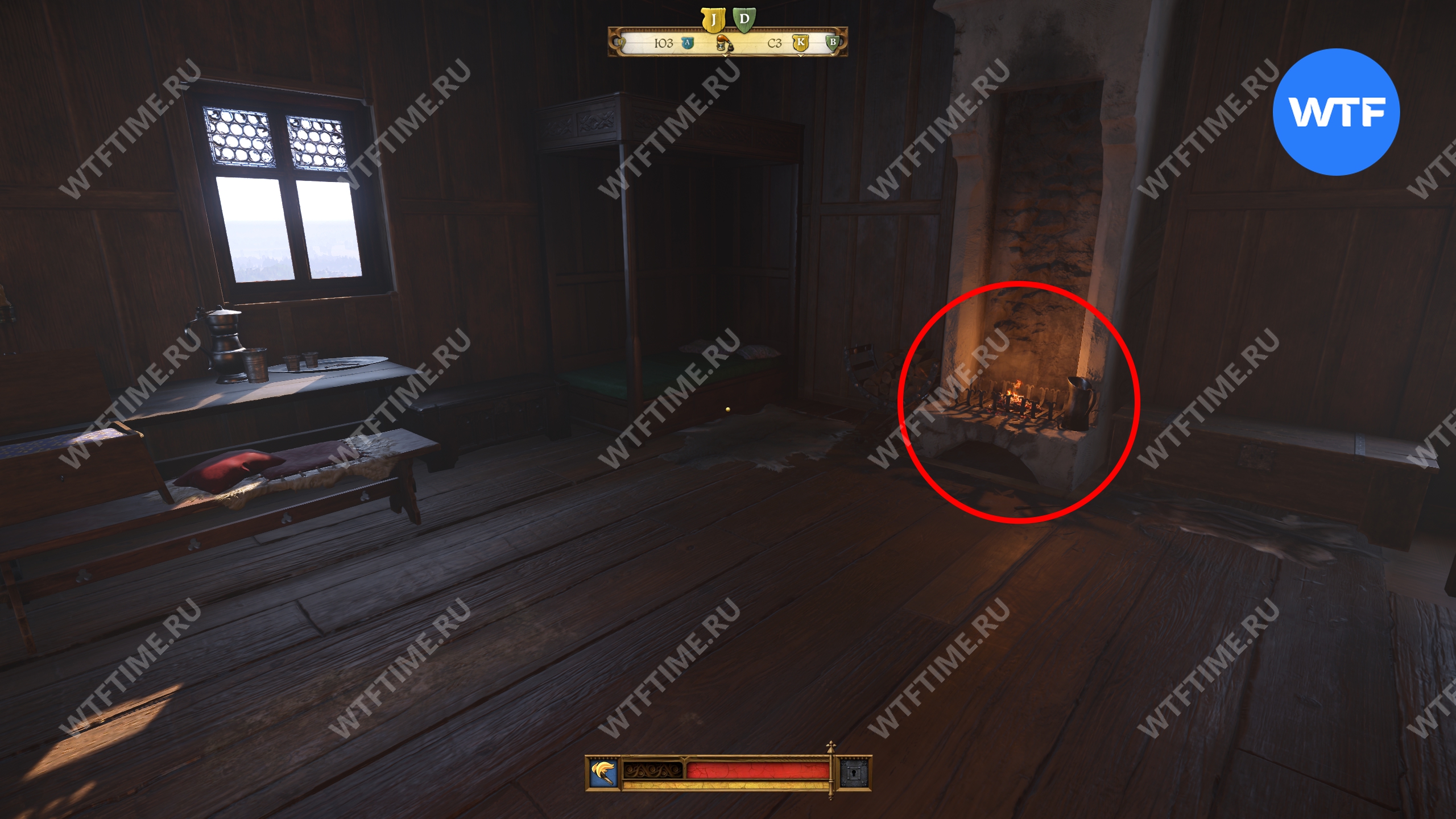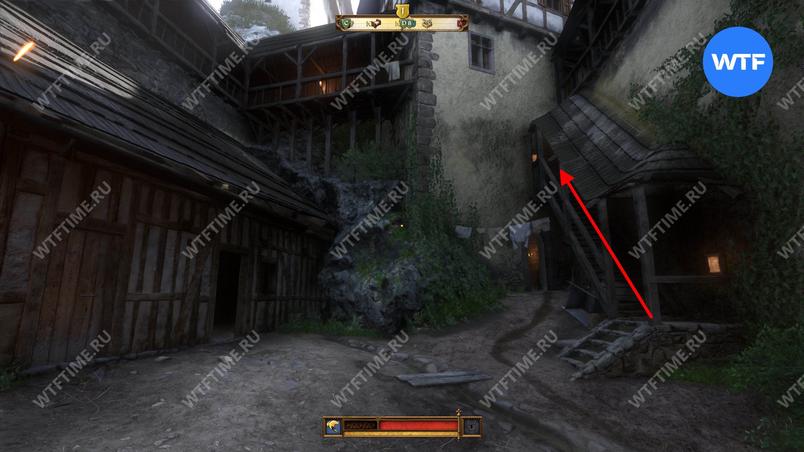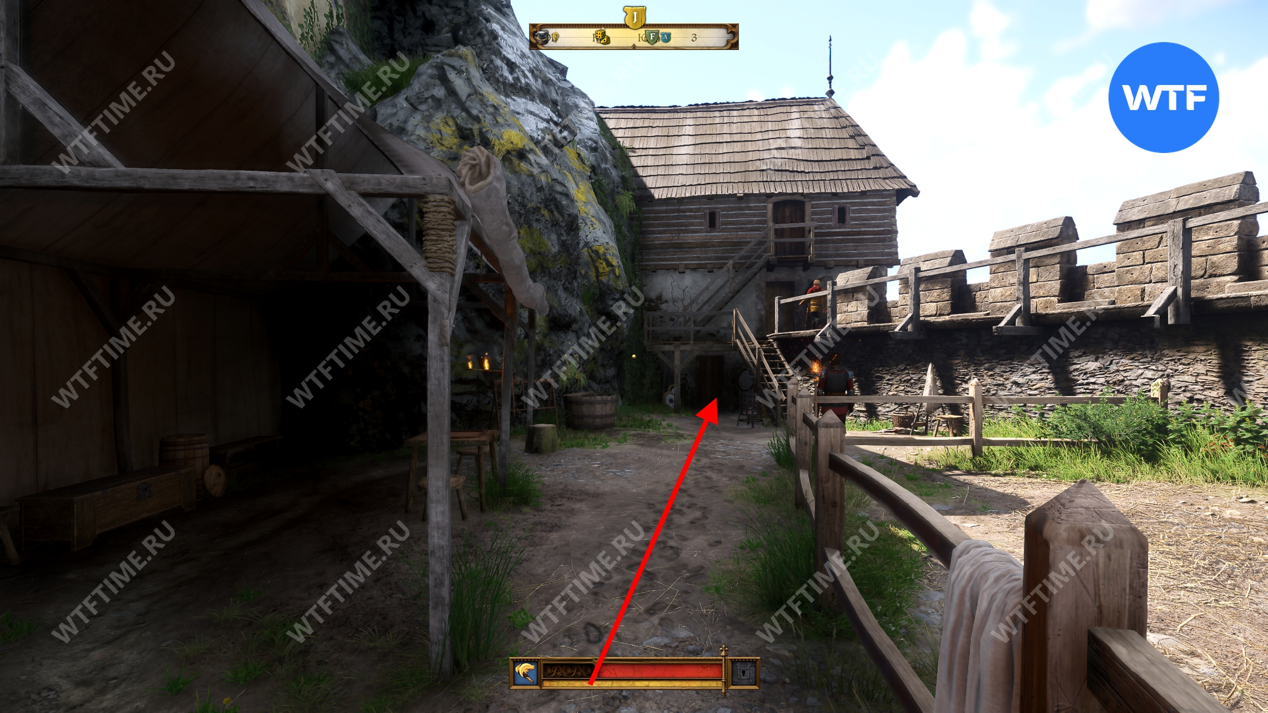 Вернитесь во двор, где находится кузница, и оттуда поднимитесь вверх по лестнице над местной баней. Это приведет вас на кухню, где у правой стены есть два очага для готовки. Воду нужно вылить на тот, что по центру.