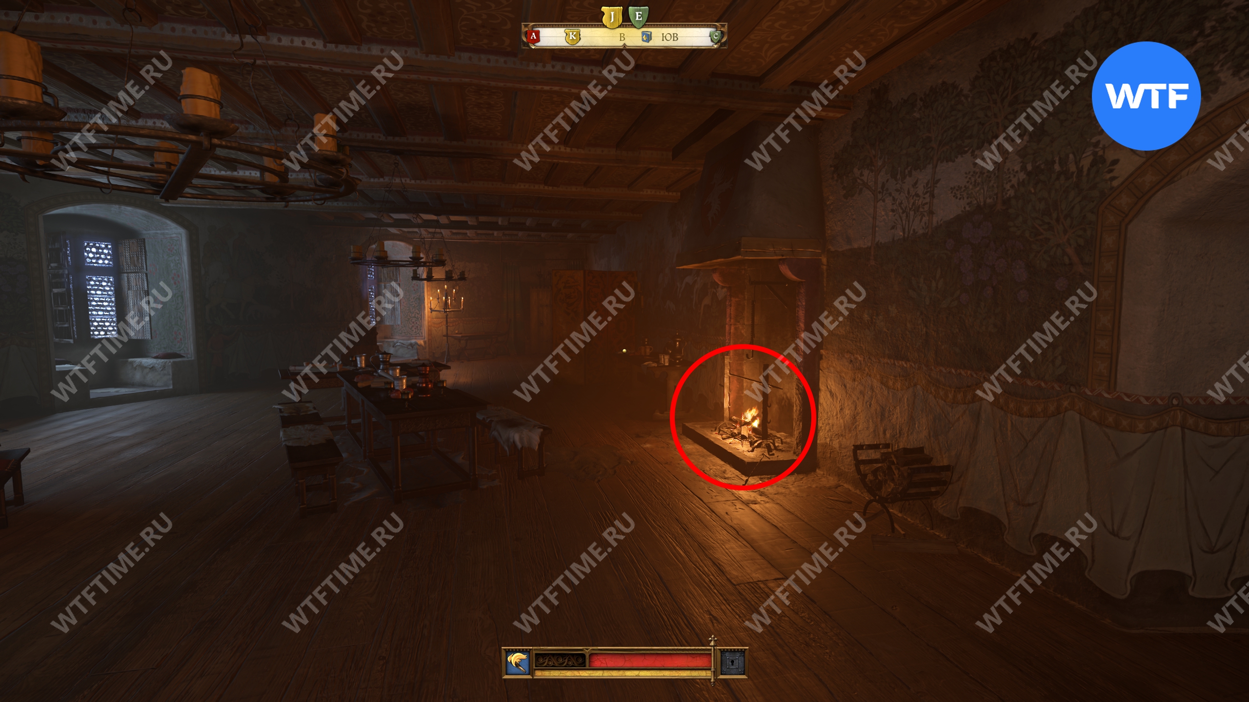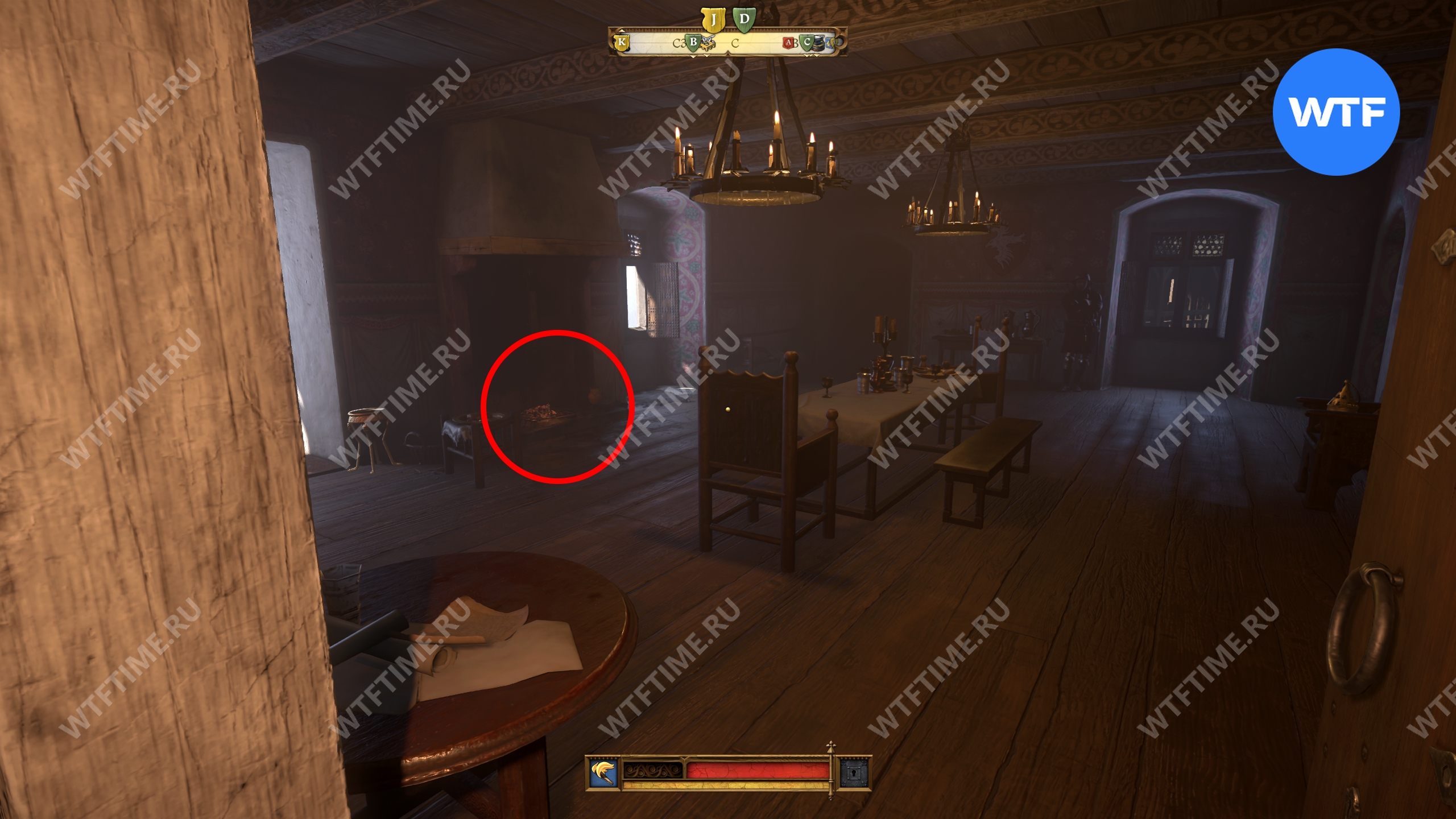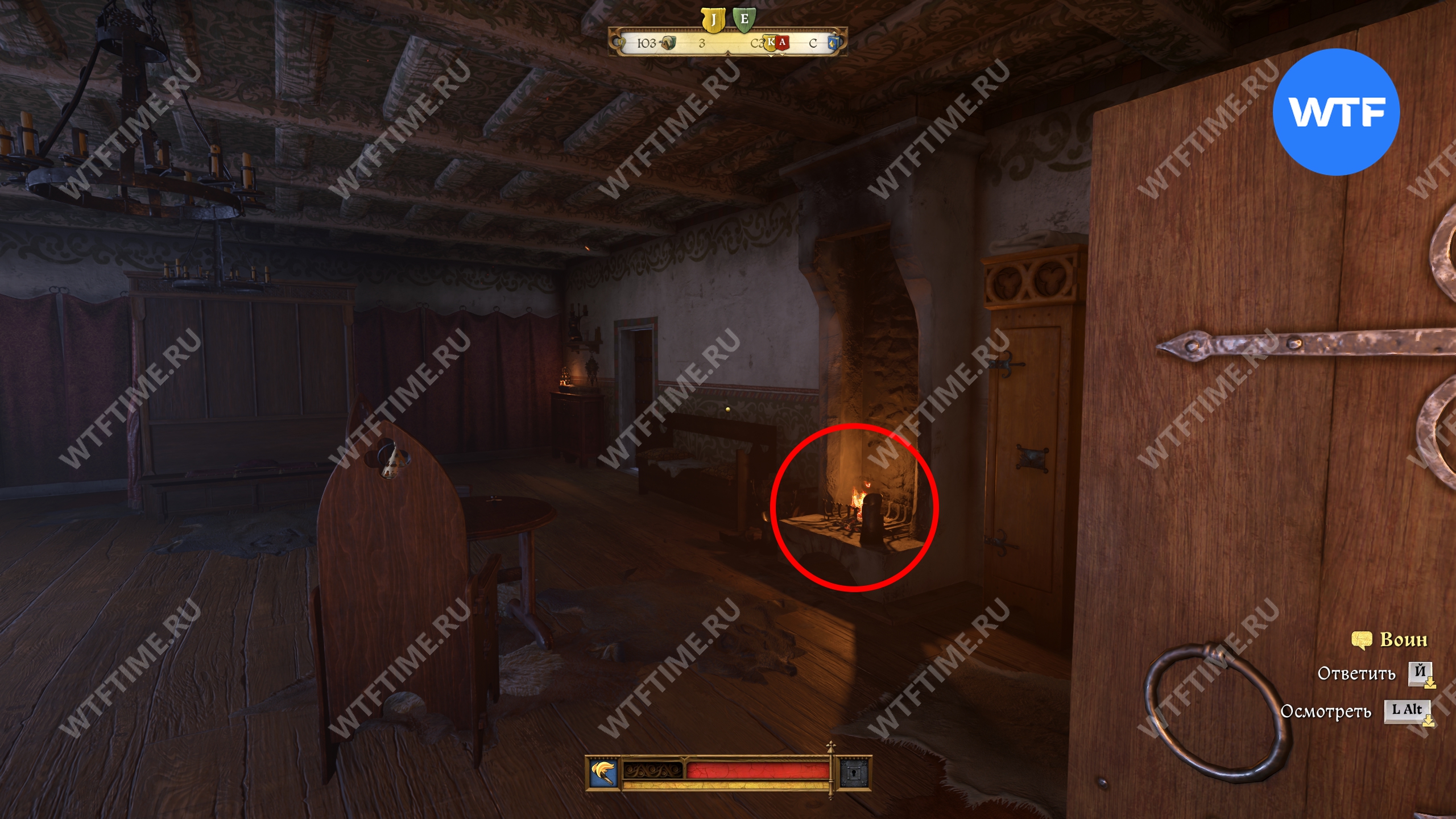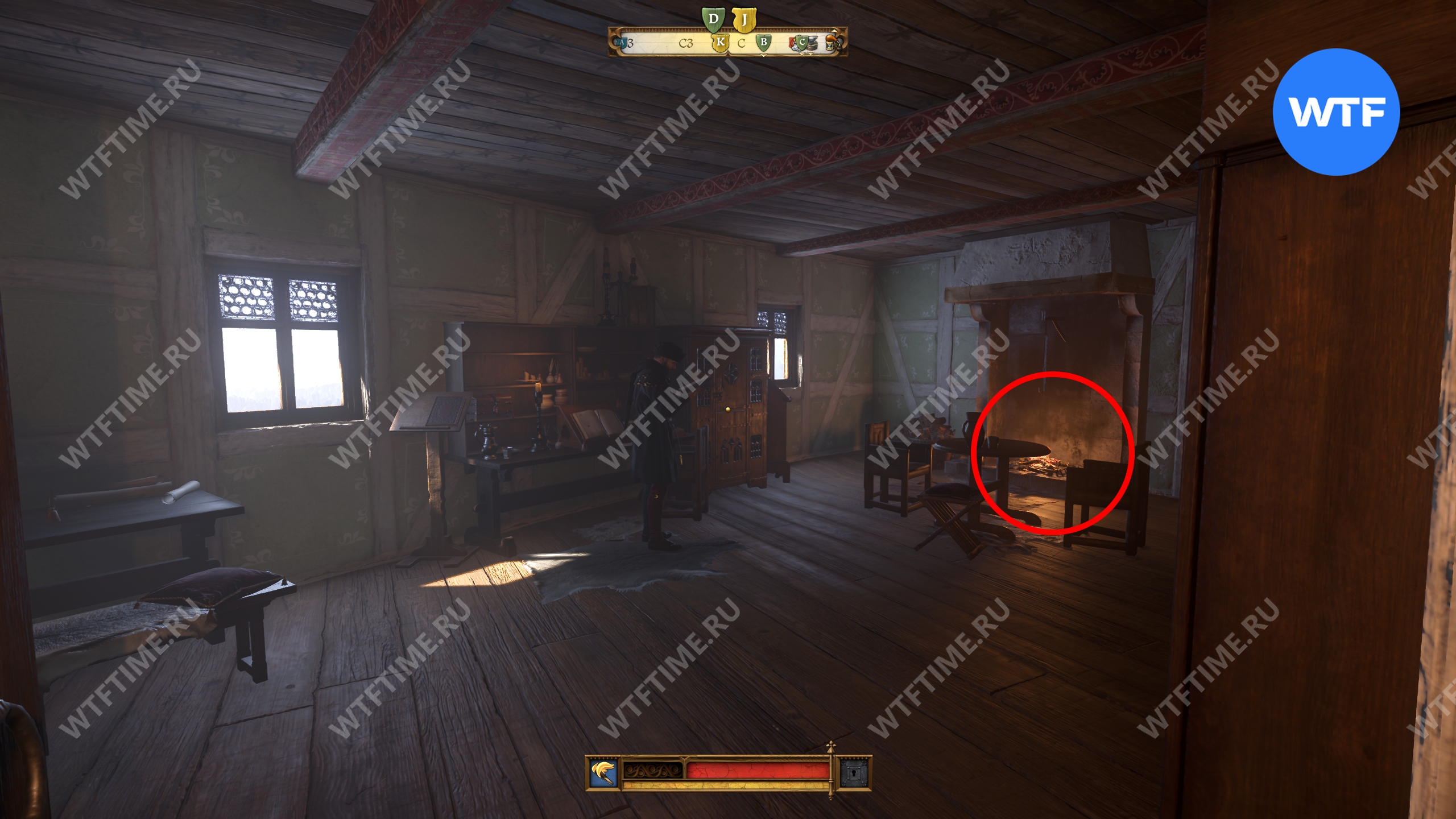 Пройдите через дверь слева от предыдущего камина (обычную деревянную, не зеленую) и окажетесь в комнате, где можно найти третий камин. Здесь мы по странному совпадению снова встретили писаря Эразима.