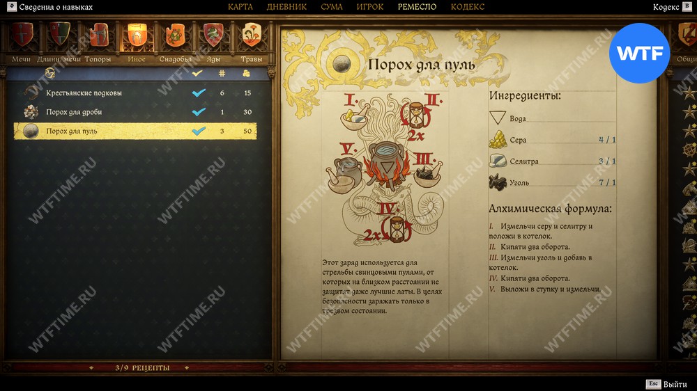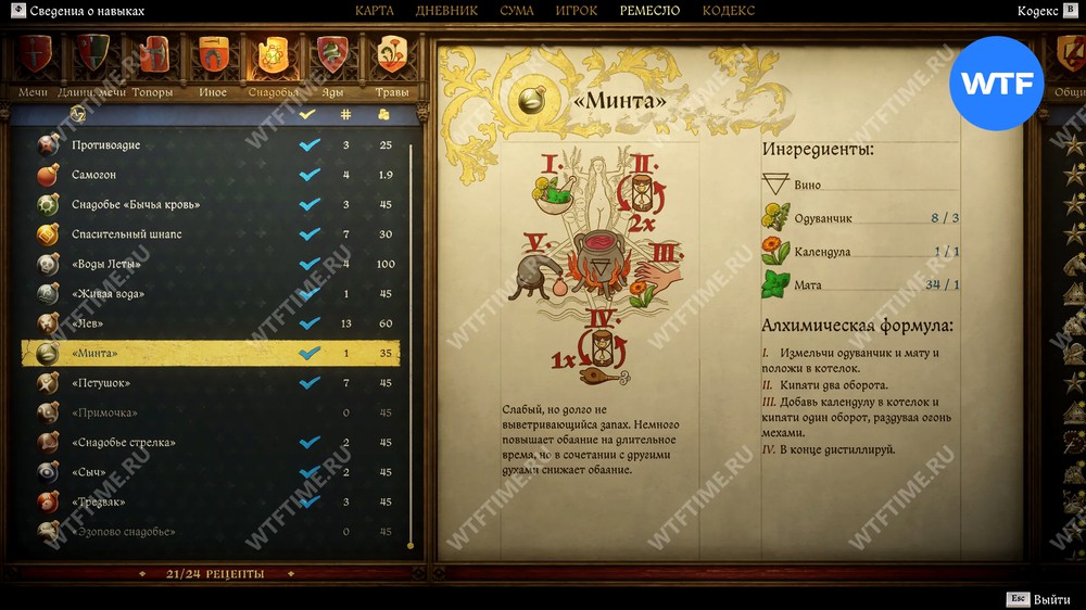 Во-вторых, можете изготовить их самостоятельно на алхимическом столе. Для этого вам не нужен сам рецепт, достаточно знать ингредиенты и порядок действий. Все травы можно купить у аптекаря Эммериха в Тросковице.