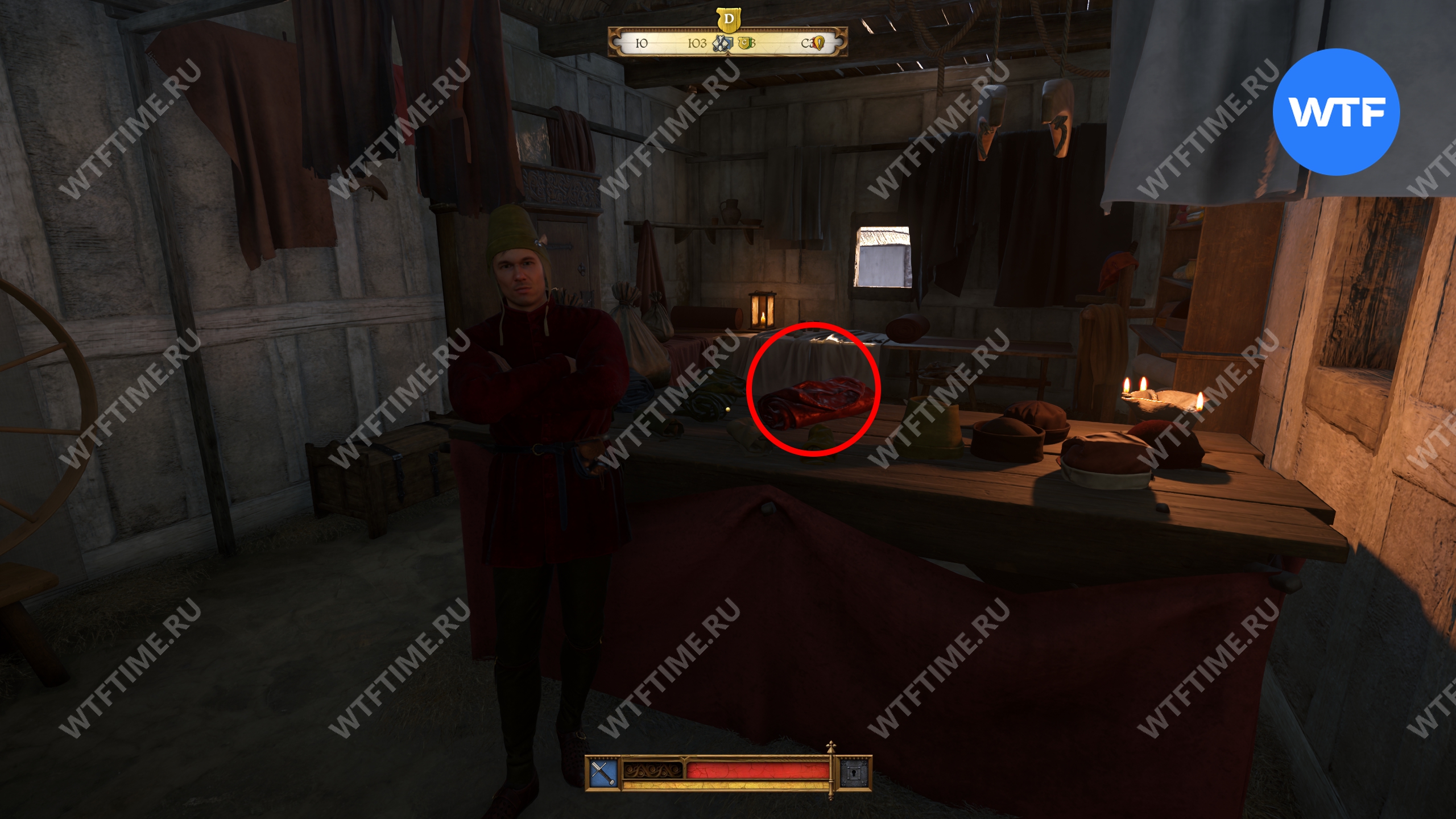 Если такую сумму вы отдать не готовы, то выманите портного из магазина при помощи камешков, а затем быстро прокрадитесь за прилавок и схватите со стола красный сверток. Даже если он вернется и вас поймает, откупиться можно будет значительно меньшей суммой, либо вообще договориться.