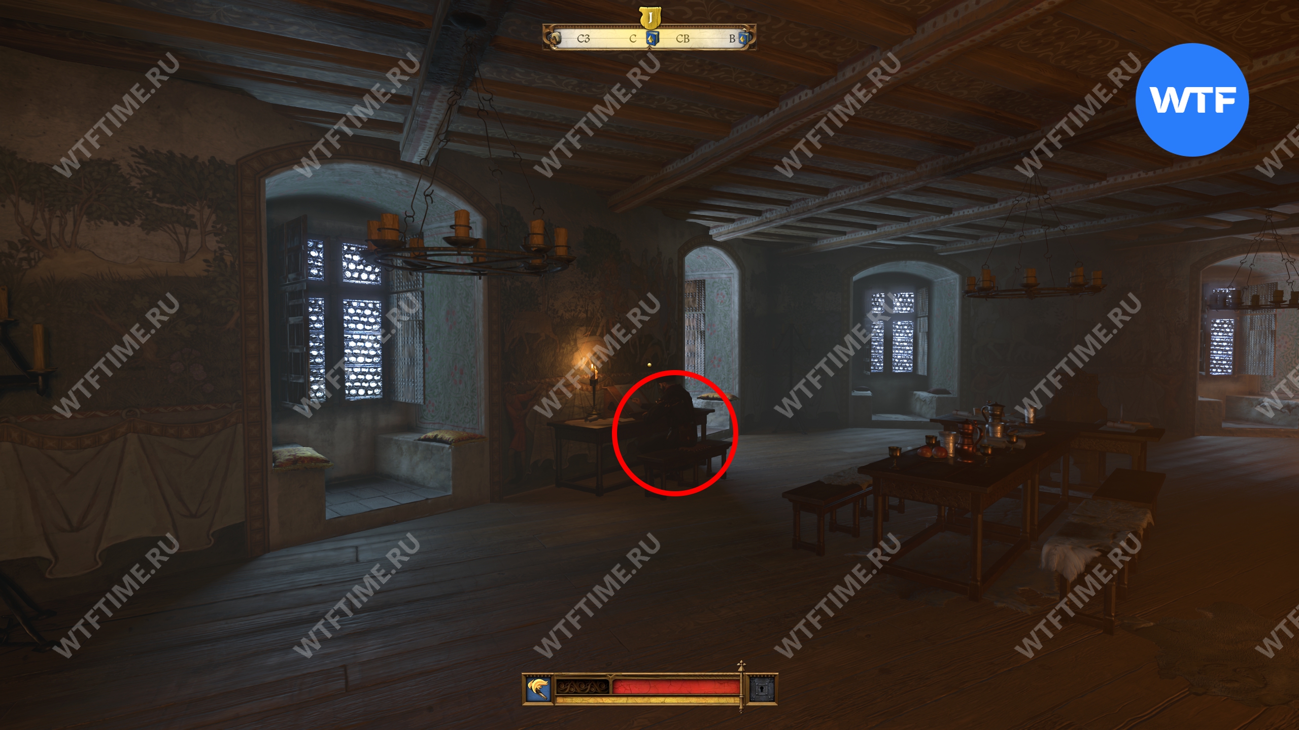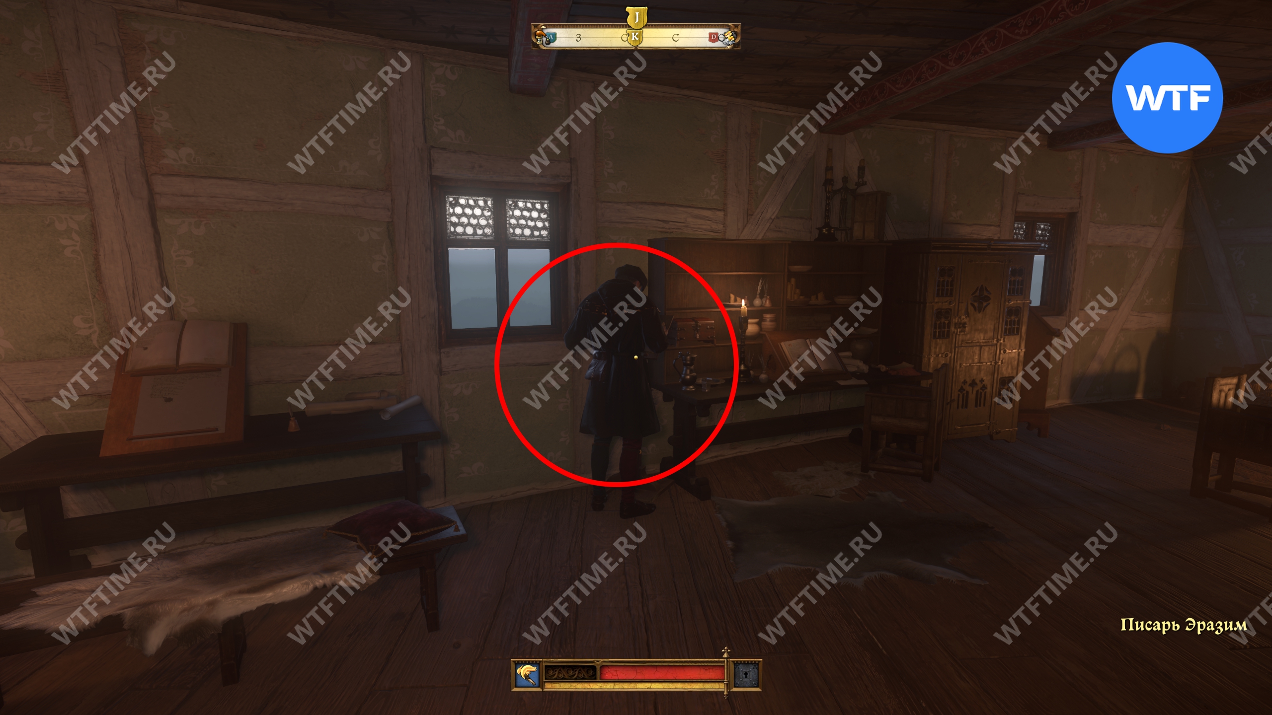 Во-вторых, идите на кухню в башне Девицы. Поднимитесь по лестнице и войдите в кладовку. Затем снова поднимитесь по лестнице в дальней части комнаты на один этаж, а затем идите в комнату слева. Пройдите через дверь слева от камина и окажетесь в зале, где также может работать писарь.