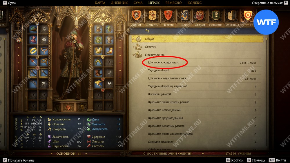 Для активации скрытого перка «Загребущие руки» вы должны украсть предметы на общую сумму от 10 000 грошей и выше. Проверить размер украденного на данный момент можно в разделе со статистикой преступлений.